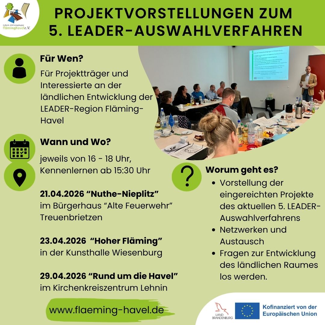 Die LAG Fläming-Havel lädt zu den Projektvorstellungen des laufenden LEADER-Auswahlverfahrens ein. Mit Stichtag 13.03.2026 wurden rund 50 LEADER-Projekte zur Teilnahme am 5. LEADER-Auswahlverfahren eingereicht, die