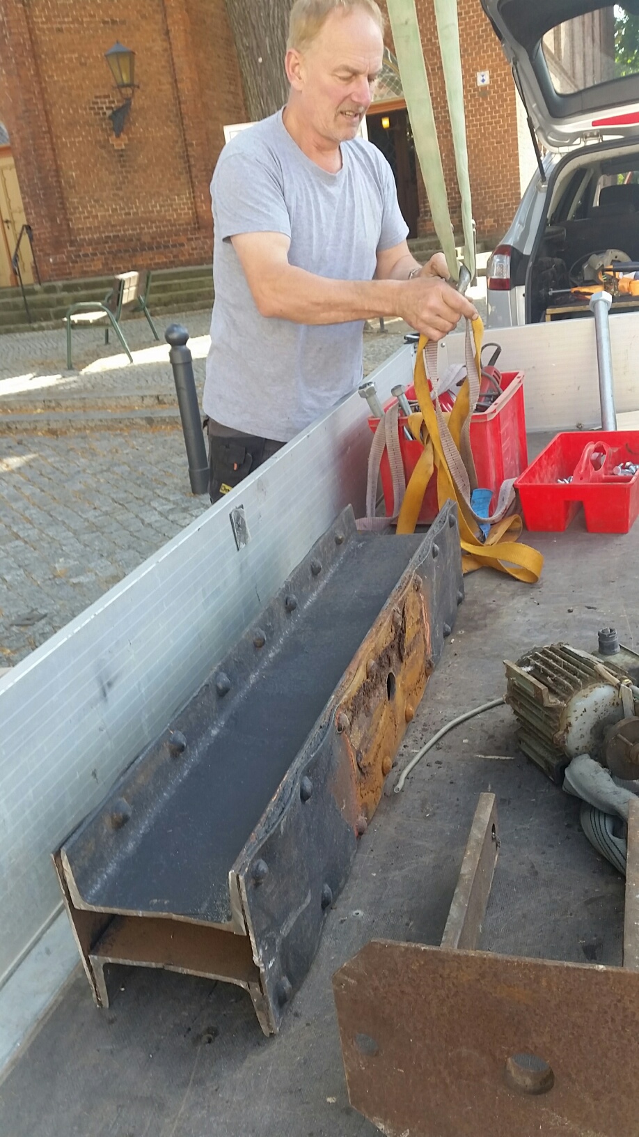 Die neuen Stahljoche für die Kirchenglocken wurden heute morgen frisch aus der Schmiede geliefert. Ein großer Autodrehkran hob die bis zu 120 kg schweren Stücke durch die Schallluken in den Glockenturm der St-Johannis-Kirche, in dem Mitarbeitern der Firma Glockenläuteanlagen Walter die Joche entgegengenommen und montiert haben. Die alten Stahljoche aus dem Jahr 1922 mussten nach fast einhundertjährigem Dienst außer Betrieb genommen werden. Sie waren so weit verrostet, dass die Sicherheit nicht mehr garantiert werden konnte.