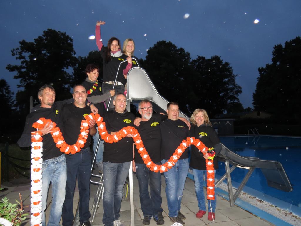 Die Freunde des Freibades um Ines und Thomas Maager haben sich einmal mehr um das Freibad verdient gemacht. Stolz präsentierten sie ihr druckfrisches T-Shirt und nahmen für ein Erinnerungsfoto an der kürzlich eingeweihten Rutsche Aufstellung.