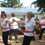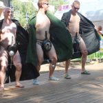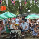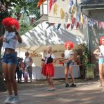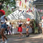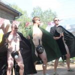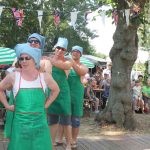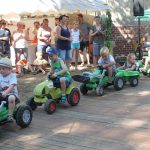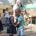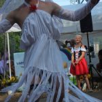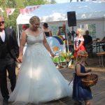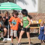 In diesem Jahr wanderte das Rotkäppchen durch beide Orte. Mit vielen der Orte, die sie dabei besuchte, verbinden sich Geschichten und Erinnerungen. Diese wurden märchenhaft dargestellt. So traf Rotkäppchen die Zwerge – die waren zwar nur zu fünft, aber lustig anzusehen – Pumuckel, Elfen, Max und Moritz und den „Blumenmän“. Letzterer ist schon öfter mit dem gleichnamigen Lied von Jürgen von der Lippe aufgetreten und provozierte Lachsalven über den teilweise zweideutigen Text. Diese ernteten auch die Jungs mit ihrer Darstellung des Hits „Die Glocken von Rom“, die auch als Partygeck bekannt ist. Und natürlich durften auch die Jüngsten nicht fehlen. Sie waren Schmetterlinge, tanzten, fuhren mit ihren Spielzeugtraktoren zur Erinnerung an das Treckertreffen und waren Blumenkinder bei der Hochzeit des Prinzen, der natürlich im Medewitzer Schloss wohnt. Nach dem Programm wischten sich alle die Schweißperlen von der Stirn, immerhin war es über 30 Grad heiß. Da waren alle froh, dass das Bahnhofsgelände von großen Bäumen umsäumt ist, die zumindest ein bisschen Schatten spendeten.