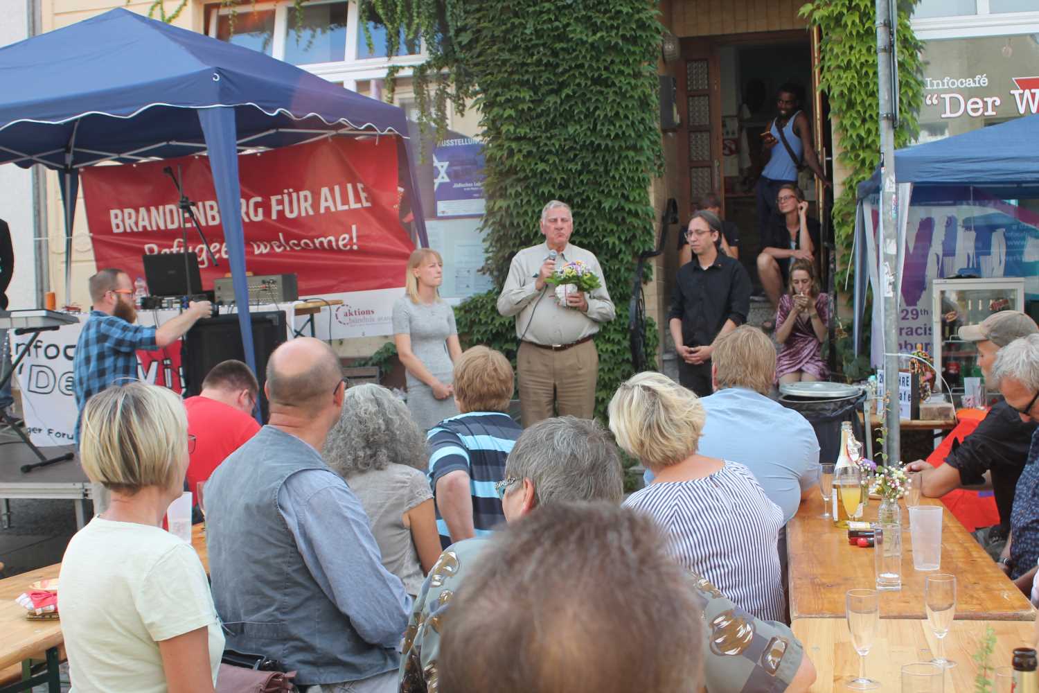 Das Infocafe war und ist ein verlässlicher Partner in der Region für Integration und Zusammenleben. Im Gegensatz zu Städten wie Cottbus oder Rathenow hat man es hier zu etwas gebracht. Das betonten alle Gratulanten immer wieder. Stets gibt es neue Projekte, es werden immer wieder andere Themen für Veranstaltungen und auch Lesungen gefunden. Das Zeichen des Cafés ist der rote Winkel. Dieser hat mehrere Bedeutungen. Wer sich erinnert weiß, dass das Cafe erst genau auf der Ecke zur Ernst-Thälmann-Straße in einer ehemaligen Bäckerei ansässig war. Damals dachten viele: Was soll das jetzt? Na ob das was wird? Aber es wurde. So ist die Ecke einmal in dem roten Winkel enthalten.