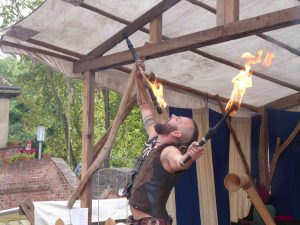 Das Motto seiner Show „Im Falle eines Falles, ist richtig fallen alles“ bewahrheitete sich auch dieses Mal, mitunter landet eine brennende Fackel auch mal auf der Erde. Live ist eben live. Die ganze Vorführung war in eine kleine Geschichte von einem Flugzeug und seinen beiden Piloten gepackt. Und natürlich machte er auch seinem Namen alle Ehre, als das brennende Ende einer Fackel im Mund verschwand. Am Ende seiner Vorführung hatte auch „Gisela“ noch ihren großen Auftritt. Sie durfte mit einem Bierzelttisch auf Arnes Kinn balancieren.