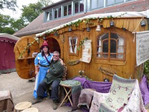 Wer nach stundenlangem herumwandern Rückenschmerzen hatte oder auch sonst völlig fertig war, konnte sich in die Hände von Cora Barth begeben. Sie hatte ihren Wohnwagen in eine Wohlfühloase verwandelt. Neben einer Physiotherapieausbildung und anderem hat sie auch verschiedene Einweihungen in spirituellen und paraphysikalischen Energien erhalten. Wichtige Lehren und Einsichten bekam und bekommt sie auf den mittelalterlichen Märkten, die ihr an vielen Wochenenden im Jahr gleichzeitig Arbeit und zu Hause sind. Wie am vergangenen Wochenende auf Burg Rabenstein. „Dort herrschen ganz eigene Energien und oft kommt es zu Begegnungen oder Ereignissen, die meinem Glauben an Wunder keine Zweifel übrig lässt“ sagt sie.