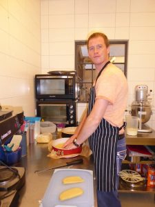 Zu seinen Schützlingen gehört Marcus Kühle. Er wohnt seit 8 Monaten bei „Scarabäus“. Der gebürtige Magdeburger kommt aus Berlin und ist gerade mit einem Käsekuchen beschäftigt. „Genau das richtige für mich“, sagt er schmunzelnd, „ich bin gelernter Bäcker.“