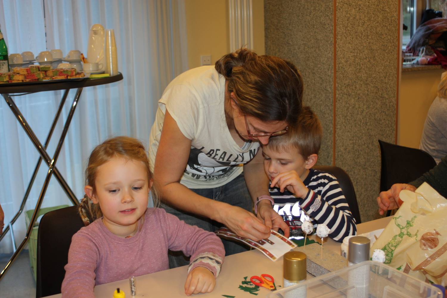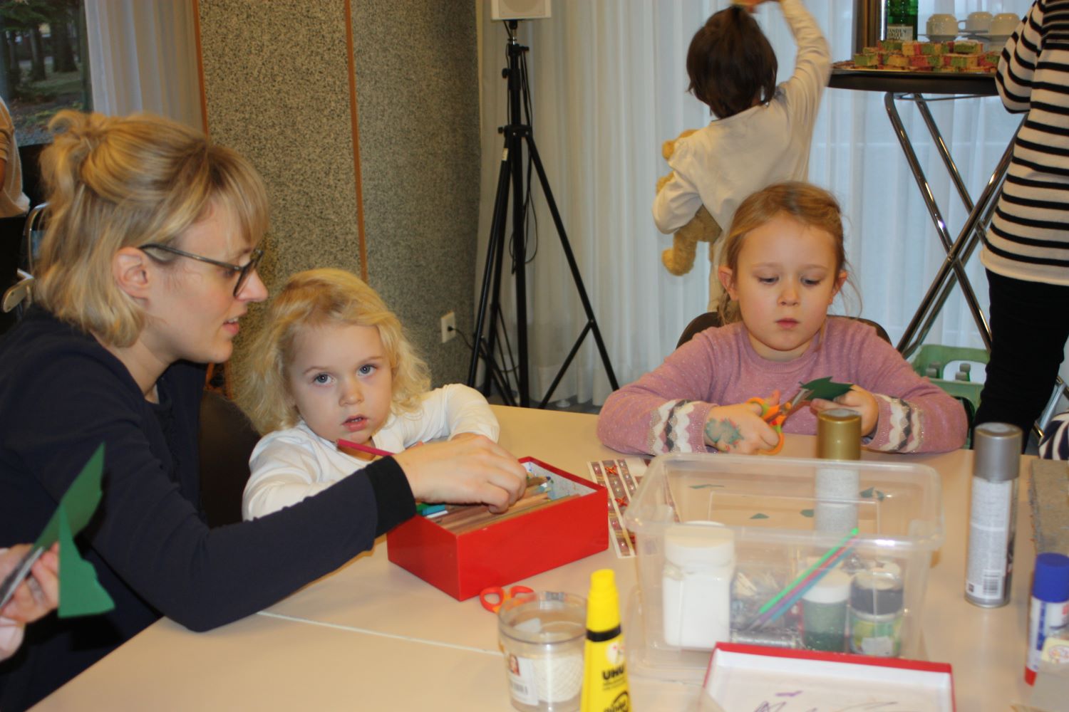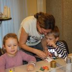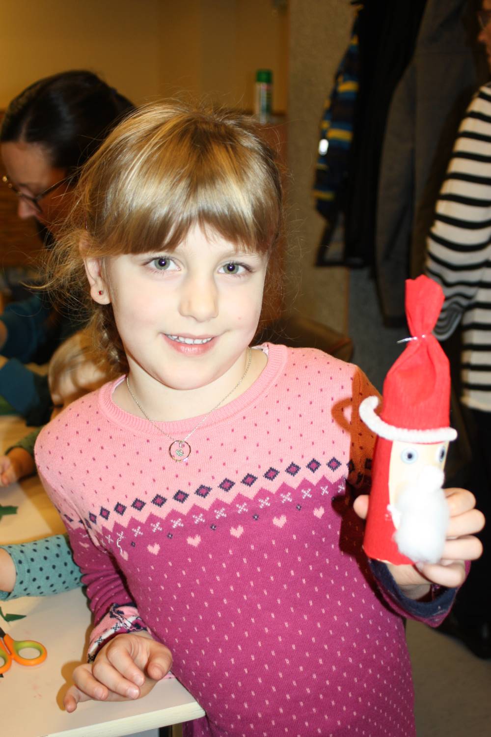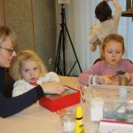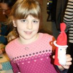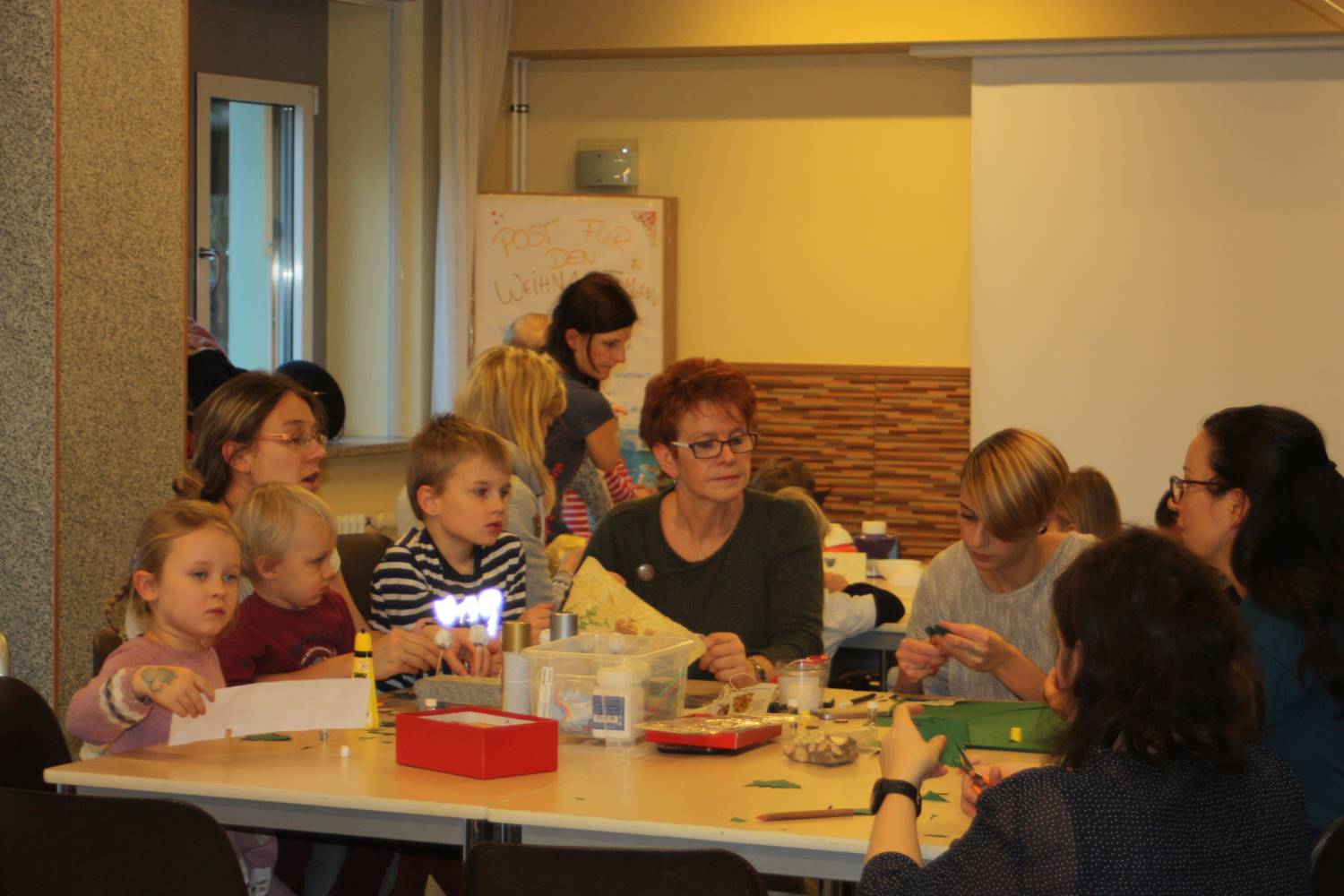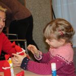 Die Eltern werden über Aushänge und Flyer über die Veranstaltungen des Netzwerkes informiert. Aber sie erfahren es auch über ihre Paten. Wie Jeanine Gotthardt. Sie war mit Töchterchen Johanna gekommen. Die Kleine ist erst wenige Monate alt und kann natürlich noch nicht selbst basteln. Also bepinselte Mama Jeanine kurzerhand das kleine Händchen mit grüner Farbe und drückte es auf eine Grußkarte für den Papa. An anderen Tischen wurde gemalt und gebastelt. Aus der Pappe leerer Toilettenpapierrollen entstanden kleine Weihnachtsmänner, aus Keksen und Lebkuchen kleine Häuschen und Figuren. Die Kinder waren begeistert bei der Sache.