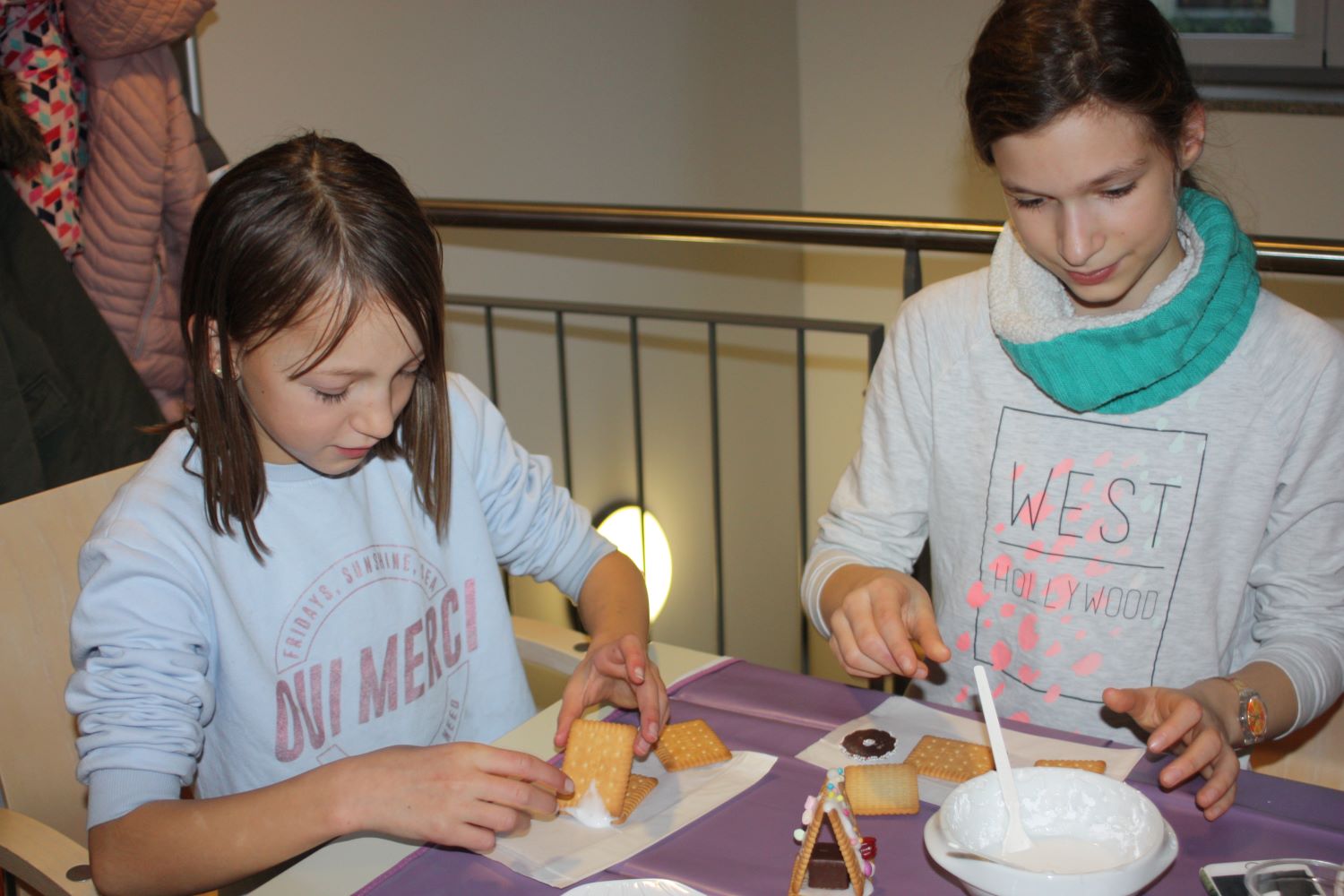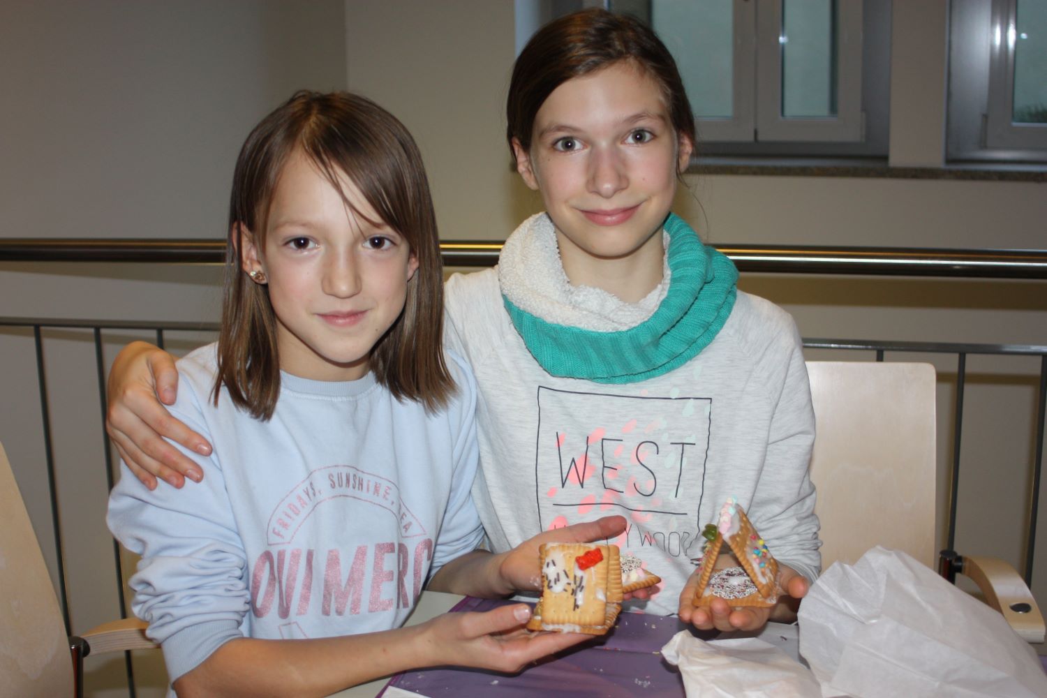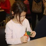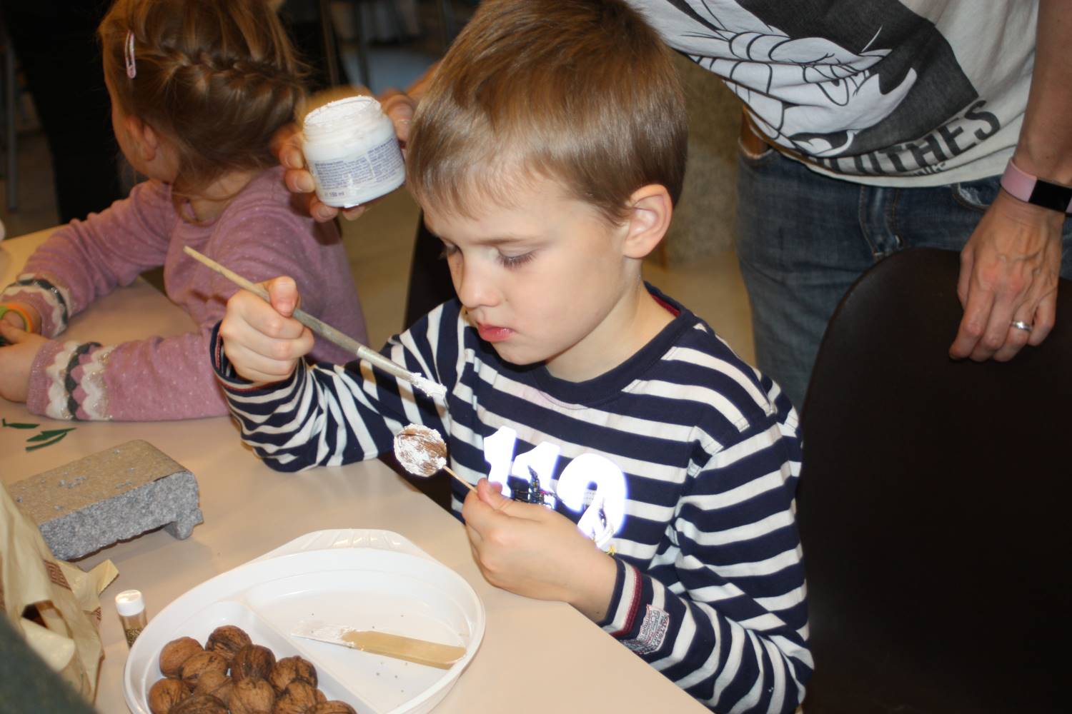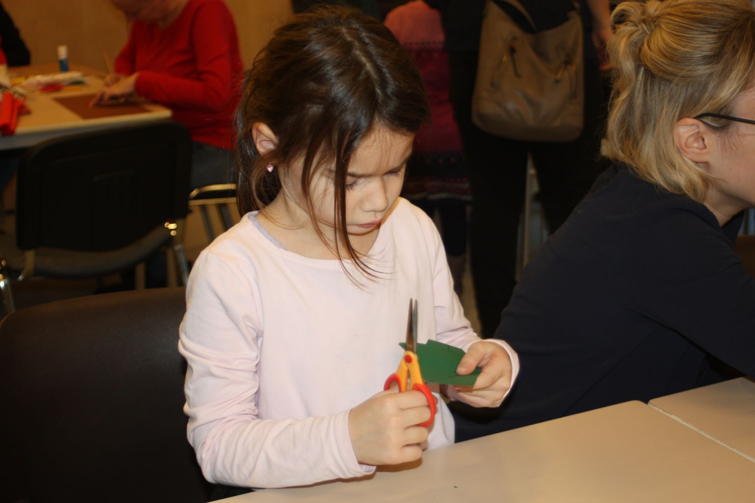 Die Eltern werden über Aushänge und Flyer über die Veranstaltungen des Netzwerkes informiert. Aber sie erfahren es auch über ihre Paten. Wie Jeanine Gotthardt. Sie war mit Töchterchen Johanna gekommen. Die Kleine ist erst wenige Monate alt und kann natürlich noch nicht selbst basteln. Also bepinselte Mama Jeanine kurzerhand das kleine Händchen mit grüner Farbe und drückte es auf eine Grußkarte für den Papa. An anderen Tischen wurde gemalt und gebastelt. Aus der Pappe leerer Toilettenpapierrollen entstanden kleine Weihnachtsmänner, aus Keksen und Lebkuchen kleine Häuschen und Figuren. Die Kinder waren begeistert bei der Sache.
