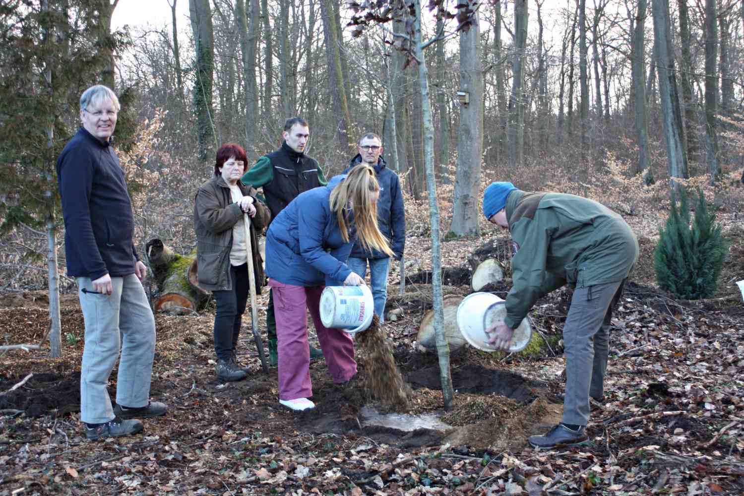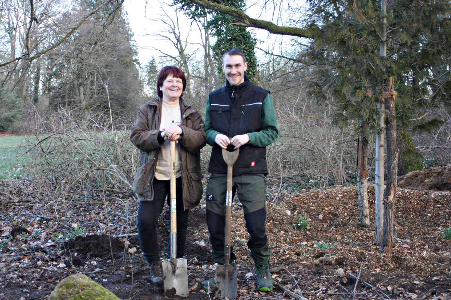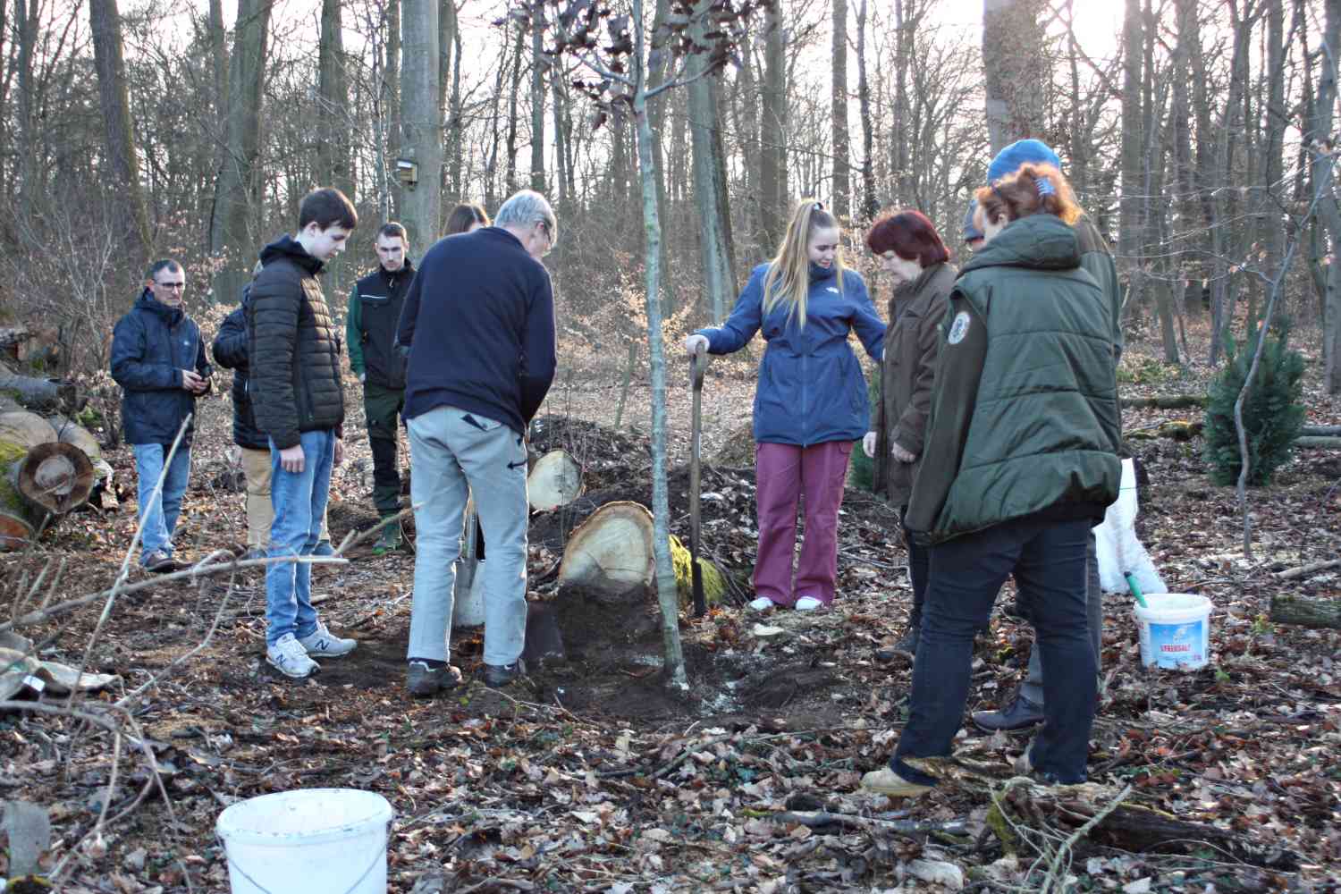 Den Baum hat Parkleiter Ulrich Jarke ausgesucht. Es ist eine Elsbeere. Gepflanzt wurde er in der Nähe des alten Forsthauses. Dort war eine große Buche umgekippt und hatte damit auch andere Bäume mitgerissen. Die Parkbrigade hatte schon begonnen, dort wieder aufzuforsten. Lebensbaum, Roteiche und Hainbuche stehen schon. Jetzt kam die Elsbeere dazu. „Da der Baum am Waldrand steht, musste einer ausgesucht werden, der Schatten verträgt und auch mit Trockenheit klarkommt“, erklärte Ulrich Jarke den Jugendlichen vor dem Pflanzen. Da die Elsbeere nur mittelgroß wird, können sich die Bäume dahinter entfalten. Aber sie kann immerhin bis zu 250 Jahre alt werden.
