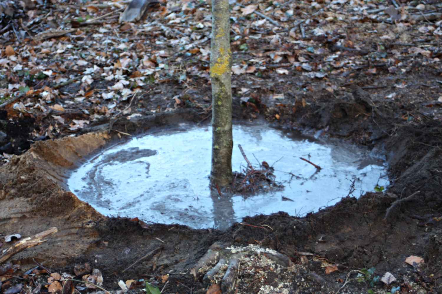 Vor dem Pflanzen wurde in das Pflanzloch noch einmal ein Tonmineral als Dünger eingebracht. Natürlich wurde der Baum gut angegossen. Schließlich brachten die Juniorranger eine Mulchschicht gegen das Austrocknen auf. Letztlich wurde noch ein Gießrand angelegt. Zukünftig wird noch ein Schild darauf hinweisen, wer diesen Baum warum gepflanzt hat. Das können die Juniorranger dann später ihren Enkeln zeigen.
