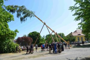Bereits am Donnerstag vor Pfingsten begannen die Vorbereitungsarbeiten am Sportplatz. „Da waren bestimmt 50 Leute“, berichtete Janine Haseloff stolz. Samstagvormittag ging es auf dem Dorfplatz und der Festwiese weiter. Nachmittags wurde die Pfingstmaie aufgestellt. Sie gehört mit 24,75 m wohl zu den größten rund um Bad Belzig und ist schon von weitem zu sehen. So war das Aufstellen auch nicht ganz so einfach, es dauerte immerhin fast zwei Stunden.
