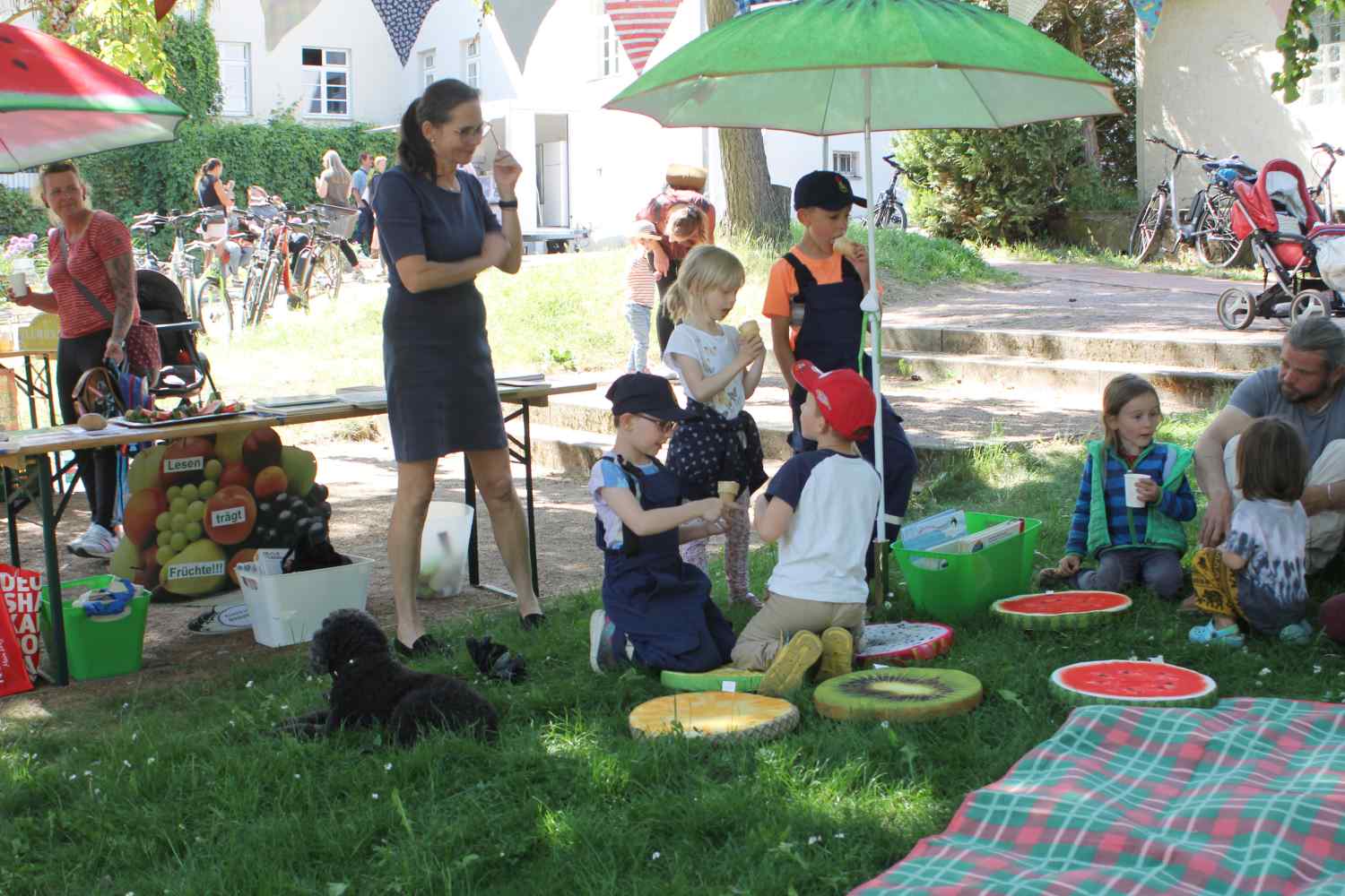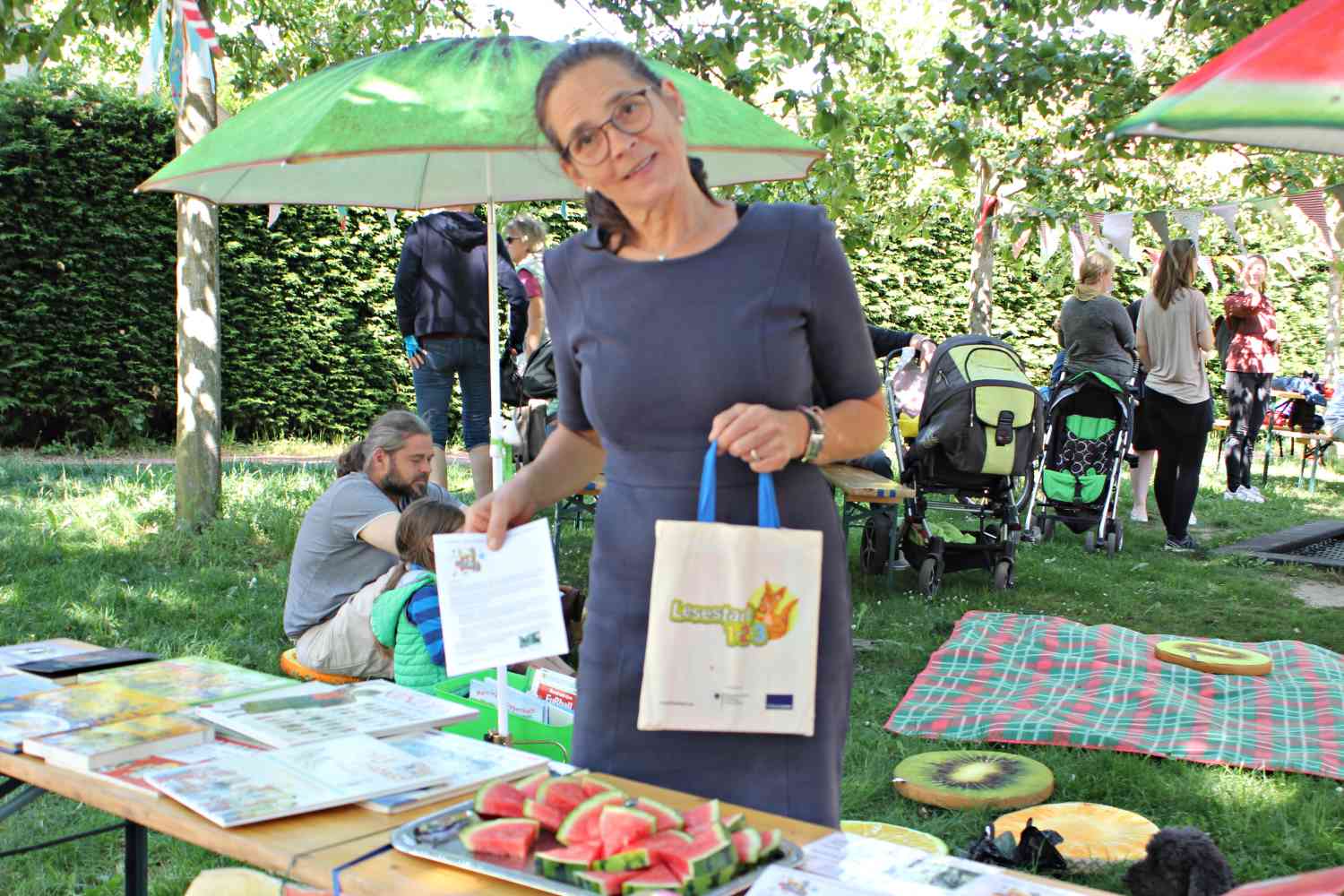 Irina Seege hatte Bücher aus dem Bestand der Bibliothek mitgebracht, in denen es um die Kinder aus aller Welt ging. So konnten die Kinder sehen, wie die Jüngsten in anderen Ländern leben. Ihr Motto „lesen trägt Früchte“ bestätigte sie mit einem großen Teller Melone. Mit den Büchern wollte Irina Seeger auch noch einmal die anwesenden Eltern darauf hinweisen, wie wichtig das Lesen für die Entwicklung ihrer Kinder ist. Mit dabei war auch Lesehund Tiffy.
