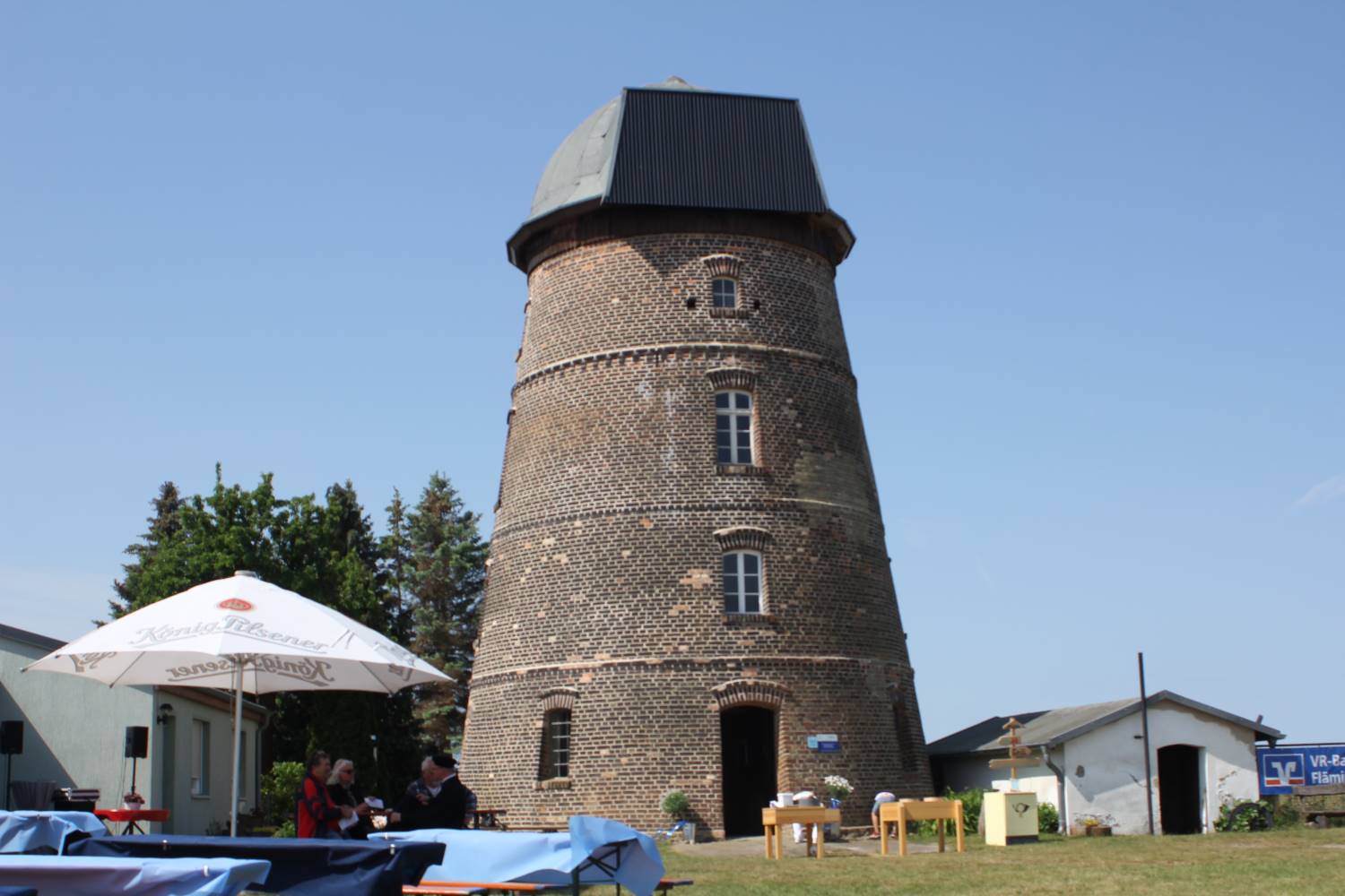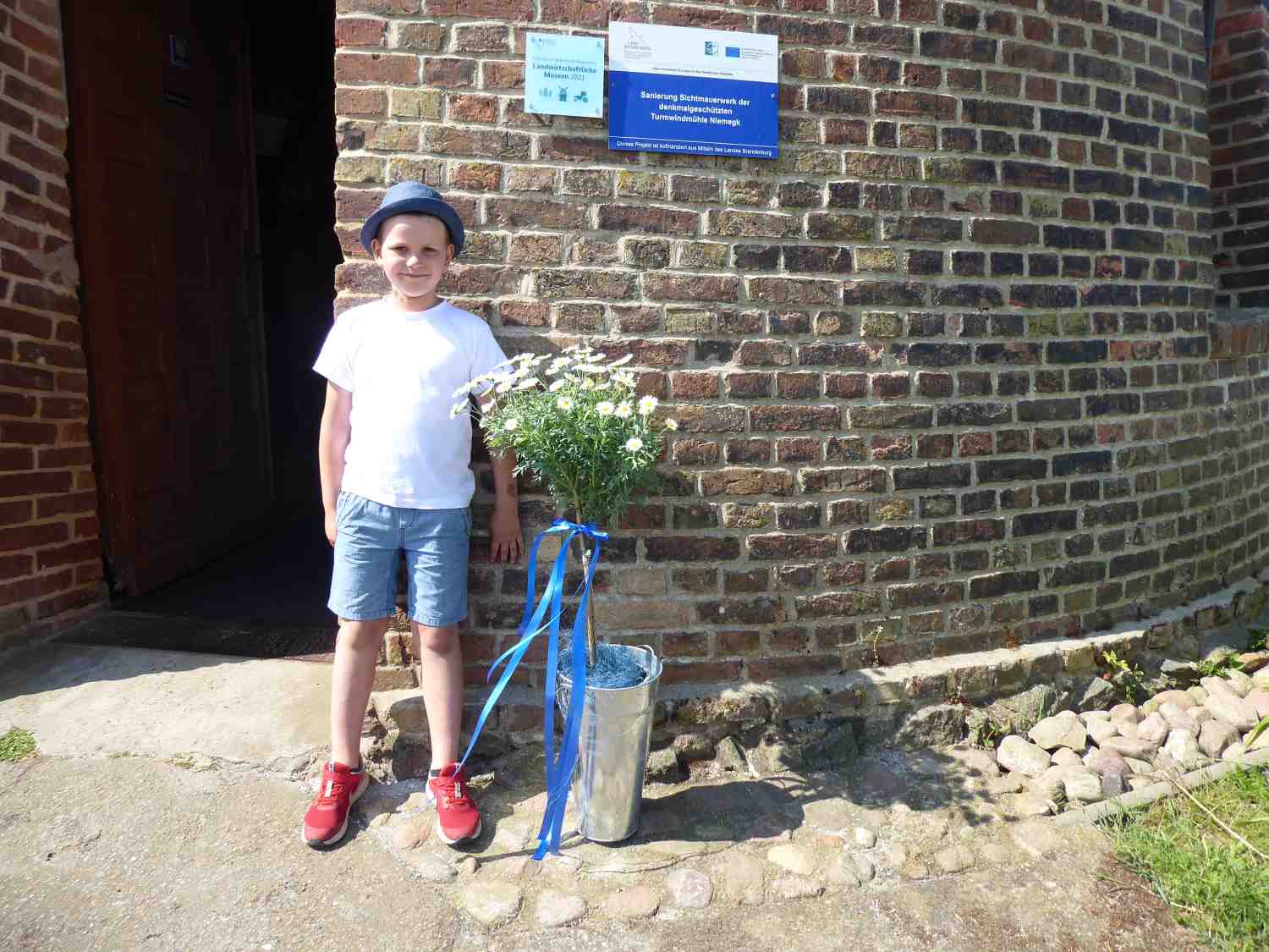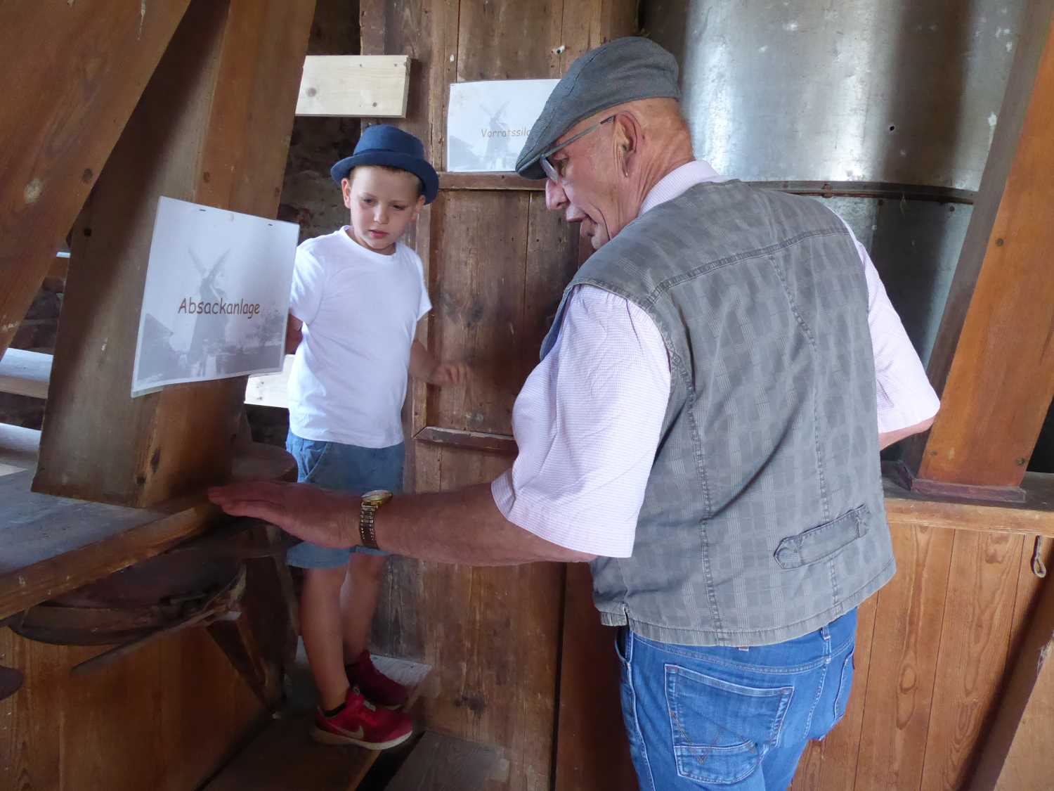 Aber Pfingsten finden in Brandenburg auch traditionell die Mühlenfeste statt. Auch die Niemegker Mühle, Großkopfs Turmwindmühle, konnte mit ihren alten Gerätschaften besichtigt werden. Und die Mühle hatte einen ganz besonderen Gästeführer, den sechsjährigen Linus. Er ist im Mühlenverein und dort hatte man ihm erklärt, wie die alte Mühle früher funktioniert hat. Völlig unaufgeregt begrüßte der Knirps jeden Neuankömmling und führte ihn über 3 Etagen bis ganz nach oben. Dabei erklärte er die verschiedenen alten Geräte und Maschinen. Auch die Schlafkoje des Müllers war zu sehen. Sie wirkte fast wie eine Puppenstube, ein Zeichen, dass die Menschen früher noch nicht so groß waren. Jetzt fühlt sich dort die Mühlenkatze heimisch.