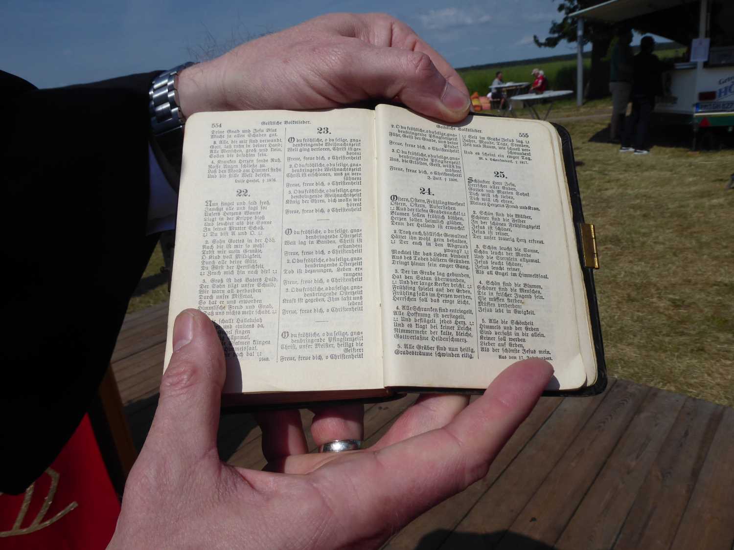Pfingsten ist das Fest des Heiligen Geistes, der dem christlichen Glauben zufolge alle Gläubigen weltweit erfüllt und verbindet und gilt als Geburtstag der Kirche. Und das wird auch mit Liedern gefeiert. Aber mit einem Weihnachtslied? „Oh Du fröhliche“ kennen die meisten nur aus der Weihnachtszeit. Weniger bekannt ist, dass das Lied eigentlich aus neun Strophen besteht, drei für Weihnachten, drei für Ostern und drei für Pfingsten. „Eine ehemalige Orgelschülerin hatte sich einmal geweigert, die Melodie bei 24 Grad zu spielen“, erinnert sich Daniel Geißler schmunzelnd. Und auch in den Liederbüchern stand selbst das Weihnachtslied früher nur im Anhang. Als geistliches Volkslied, aber nicht für den Gottesdienst geeignet. Als Beweis hatte er ein altes Gesangsbuch von 1912 dabei.