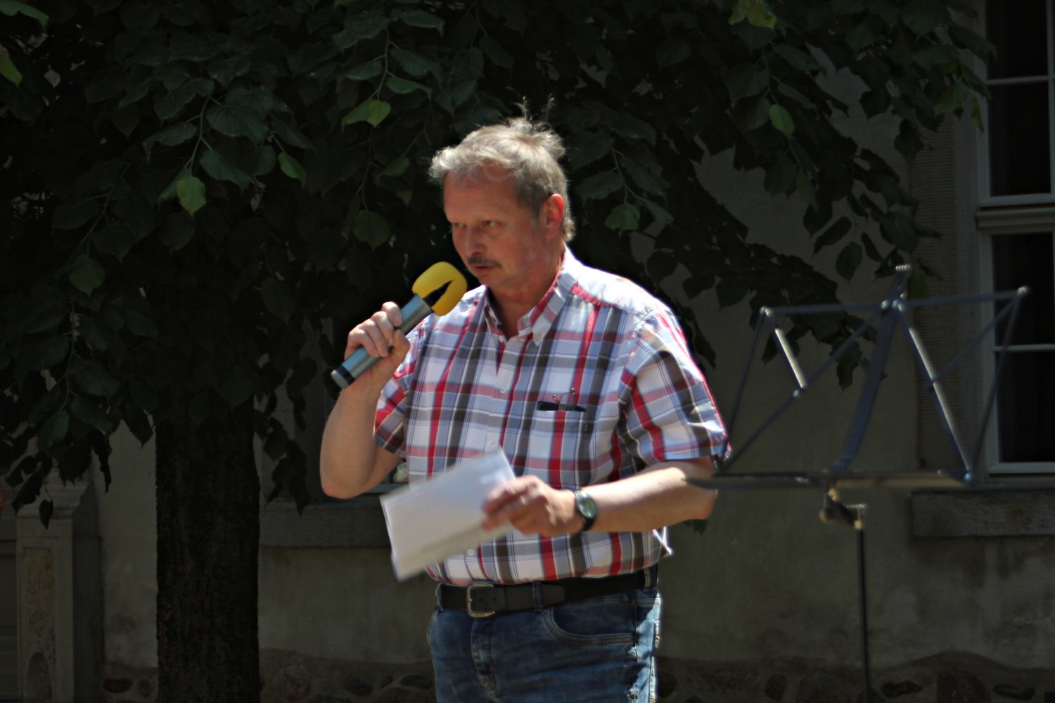 Moderator Frank Gericke hieß alle willkommen. Er wies aber auch darauf hin, dass das Chortreffen nicht von einem Verein oder Ähnlichem organisiert wurde, sondern eigentlich von einer einzigen Person: Barbara Klembt, zu Beginn der Veranstaltungsreihe noch gemeinsam mit Ilse Mansfeld als Mitglieder des Fremdenverkehrsvereins Wiesenburg/Mark. Inzwischen hat sich eine kleine überregionale Organisationsgruppe gebildet.