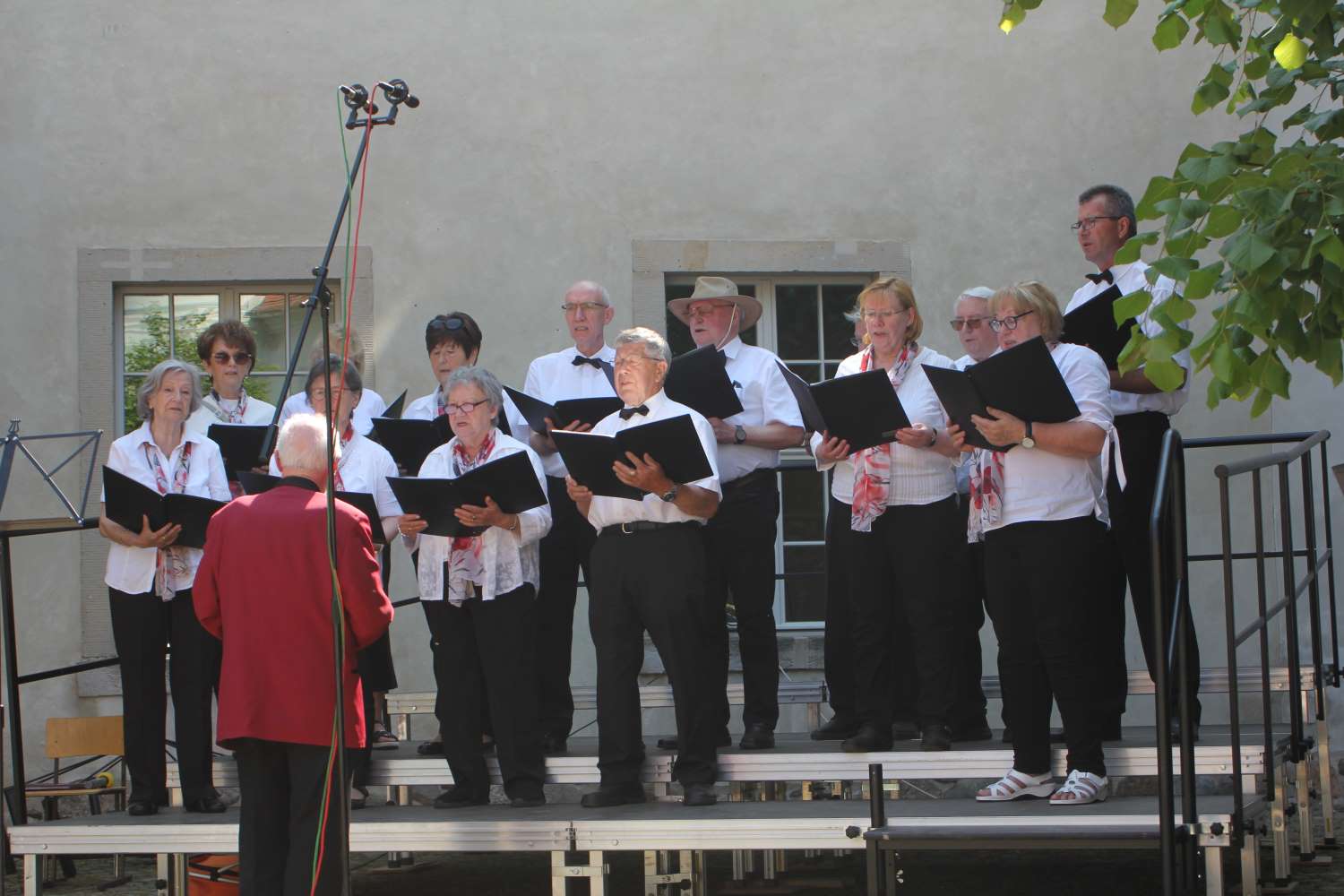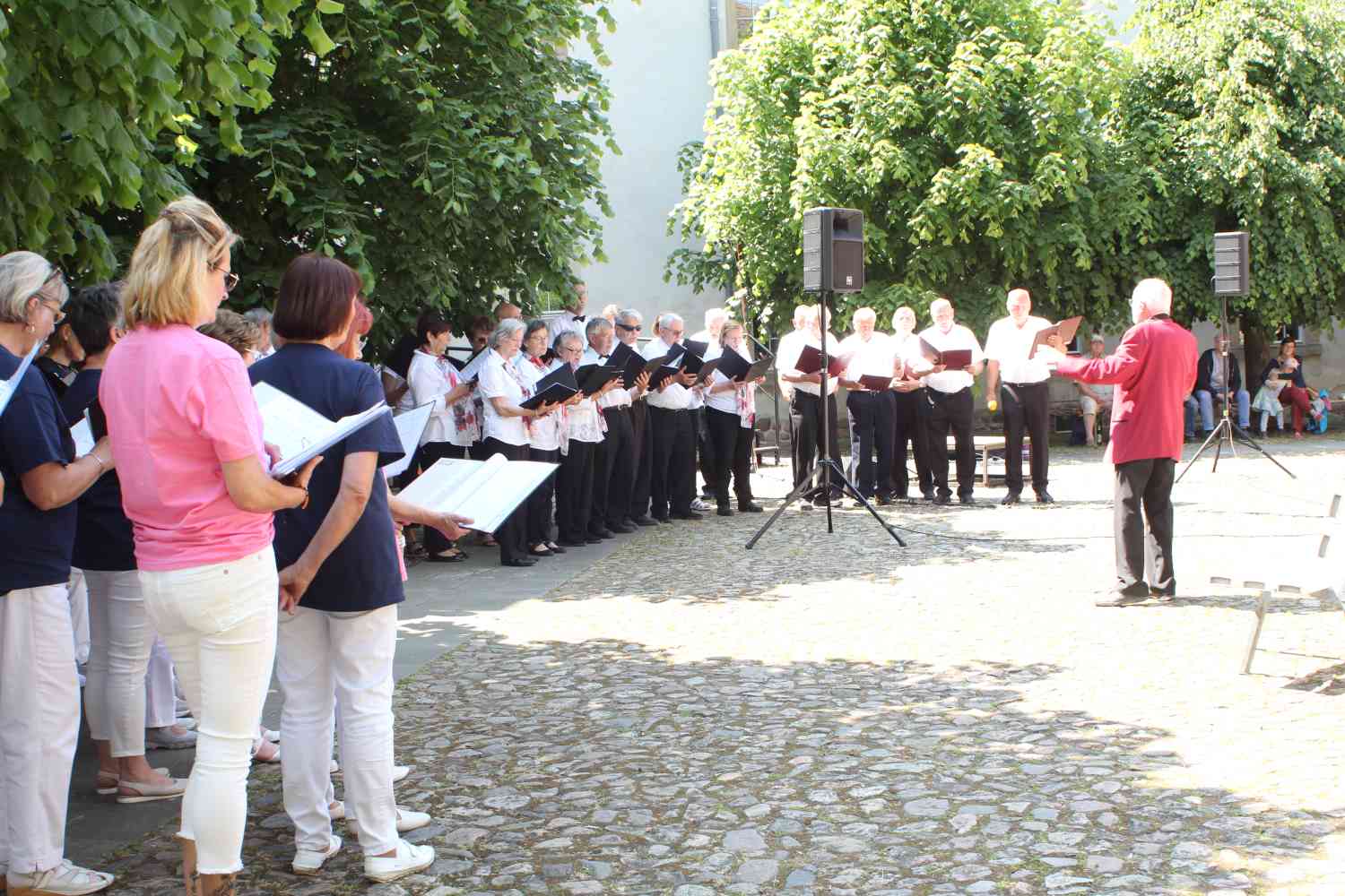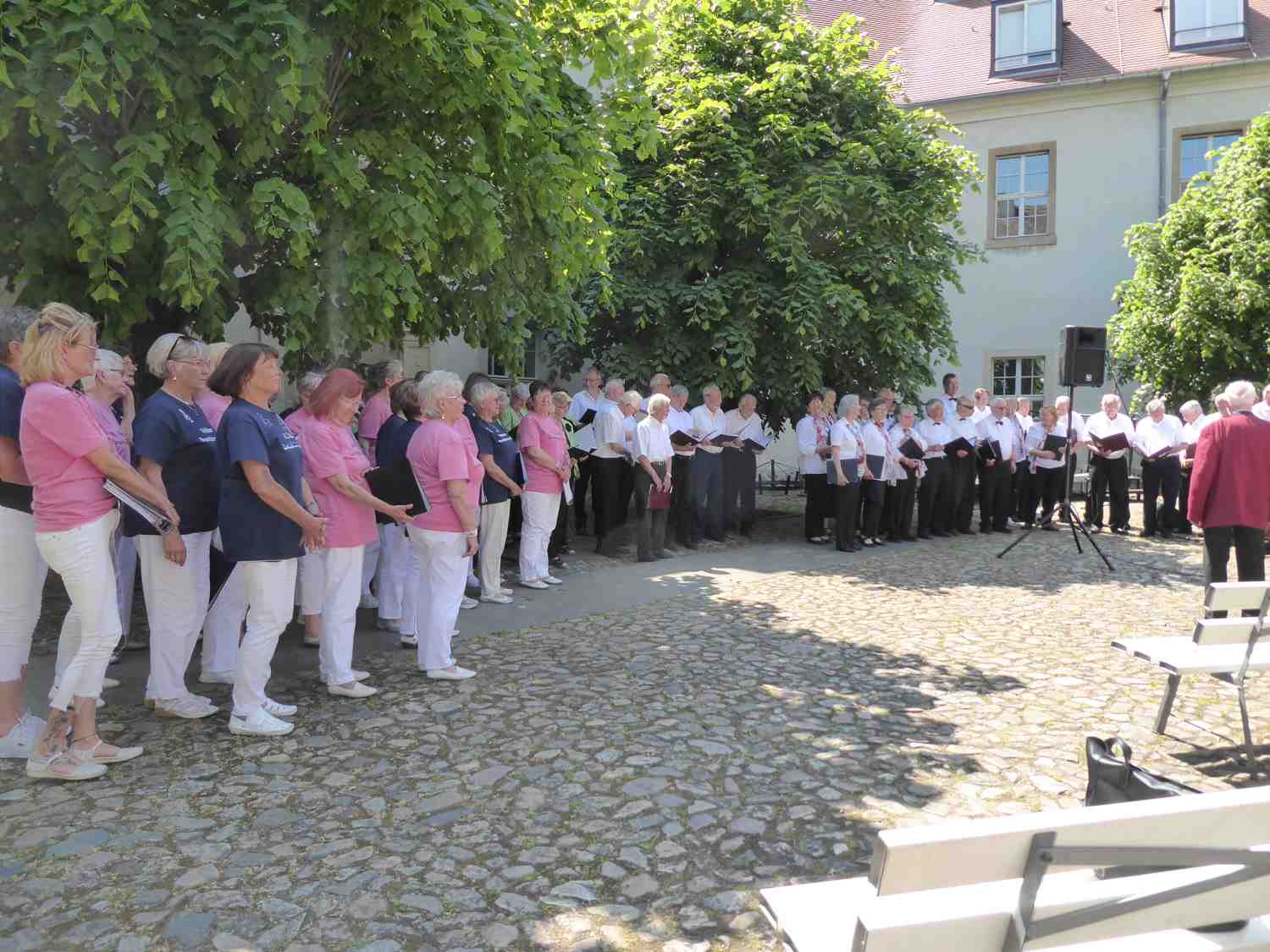 … da treffen sich fröhliche Leute. Wie zum 31. Chortreffen auf dem Schlosshof in Wiesenburg. Und es sangen nicht nur die Chöre aus nah und fern, auch das Publikum konnte viele bekannte Volkslieder mitsingen. Man brauchte nicht mal textsicher sein, jeder bekam ein Liedblatt in die Hand. Schon eine halbe Stunde vor der offiziellen Eröffnung durch Wiesenburgs Ortsvorsteher Norbert Hesse unterhielt das Jugendblasorchester mit Musik aller Genres. Das Startsignal gab dann die Jagdhornbläsergruppe mit Mitgliedern aus Wiesenburg und Reetz.