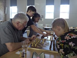 Die neunjährige Diana und der siebenjährige Nekruz stammen eigentlich aus Tadschikistan, lebten aber viele Jahre in der Ukraine. Vor dem Krieg flüchteten sie nach Deutschland. Beide haben schon wenige Grundkenntnisse im Schachspiel. Carlo ist da schon weiter. Der Elfjährige bekam das Schachspiel von einem Jungen in der Schule gezeigt. Das war schon in der 2. Klasse. Jetzt ist Carlo immer ganz traurig, wenn sein Schachpartner nicht da ist. Mama und Papa können es nicht besonders gut, deshalb spielt Carlo mit einer APP auf dem Handy. Der einzige ebenbürtige Gegner ist der Opa. Auch der zwölfjährige Florian ist kein Anfänger mehr.