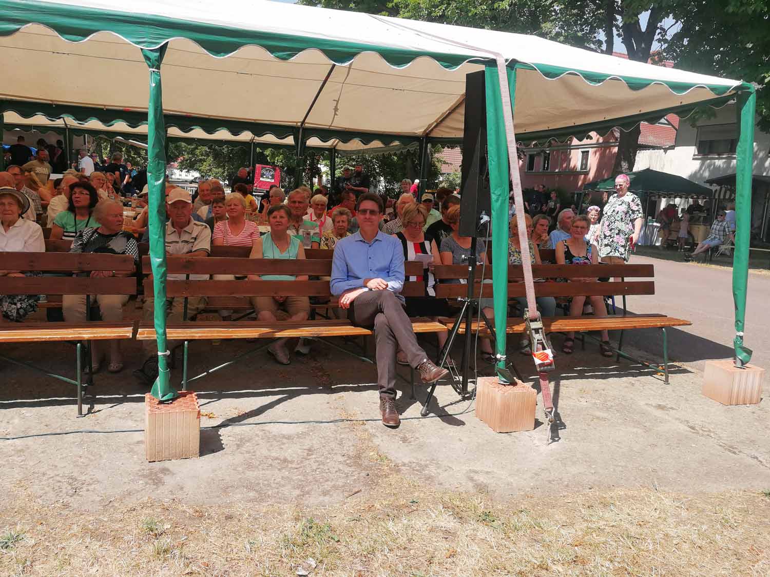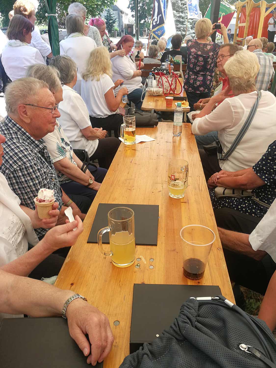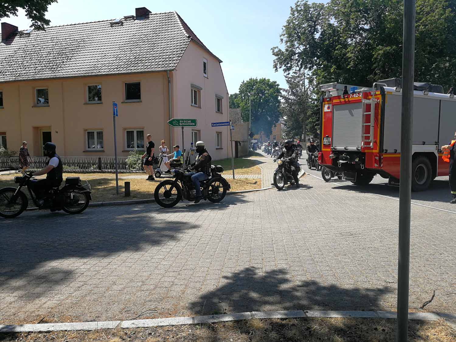 Der Festtag am Sonntagnachmittag (11.06.2023) begann mit einem Umzug von der Feldstraße zum Kastanienwinkel. Als die Straße dafür gesperrt wurde, entschloss sich ein Zweirad-Oldtimer-Club aus Mecklenburg- Vorpommern zu einem Zwischenhalt. Die 50 Männer und Frauen genossen den Gesang und vor allem die kalten Getränke und die Bratwurst.