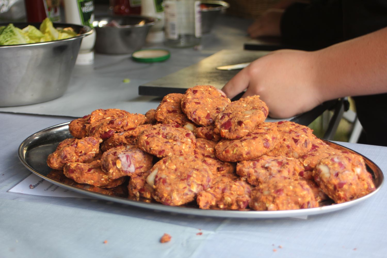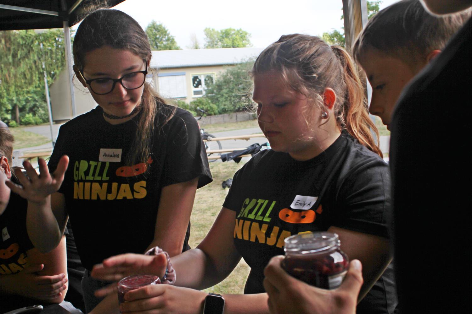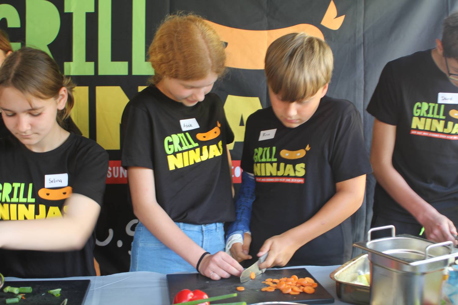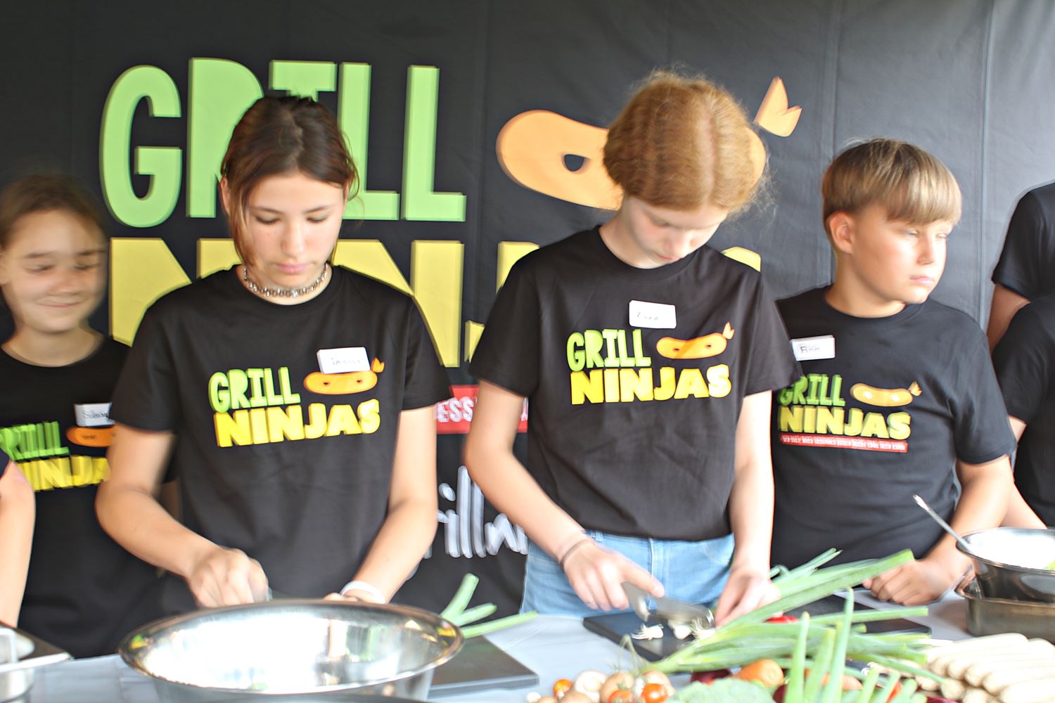 Zu Beginn bekamen alle erst mal ein Grillninja-T-Shirt. Grillmeister Philipe erklärte allen, wie welches Gemüse zu schneiden ist. Immerhin haben die Gemüsesorten unterschiedliche Garzeiten. Dann hieß es für alle: Hände waschen. Man arbeitete schließlich mit Lebensmitteln. Die Kinder wurden in Gruppen unterteilt und konnten drei Rezepte zubereiten. Diese haben sich die Grillninjas selbst ausgedacht, aber eine Ärztin hat sie gegengelesen, ob sie geeignet sind. Auf dem Plan standen Flammkuchen, Kidneybohnenburger und als Nachtisch ein Obstcrumble. Die Kinder wechselten sich beim Schnibbeln ab. Ehe dann wirklich der Grill angeworfen wurde hieß es aber auch – Abwaschen. Am Ende der Veranstaltung ließen es sich alle schmecken und kamen zu dem Schluss – es muss nicht immer Fleisch sein, auch aus Obst und Gemüse kann man leckere Grillgerichte zaubern.