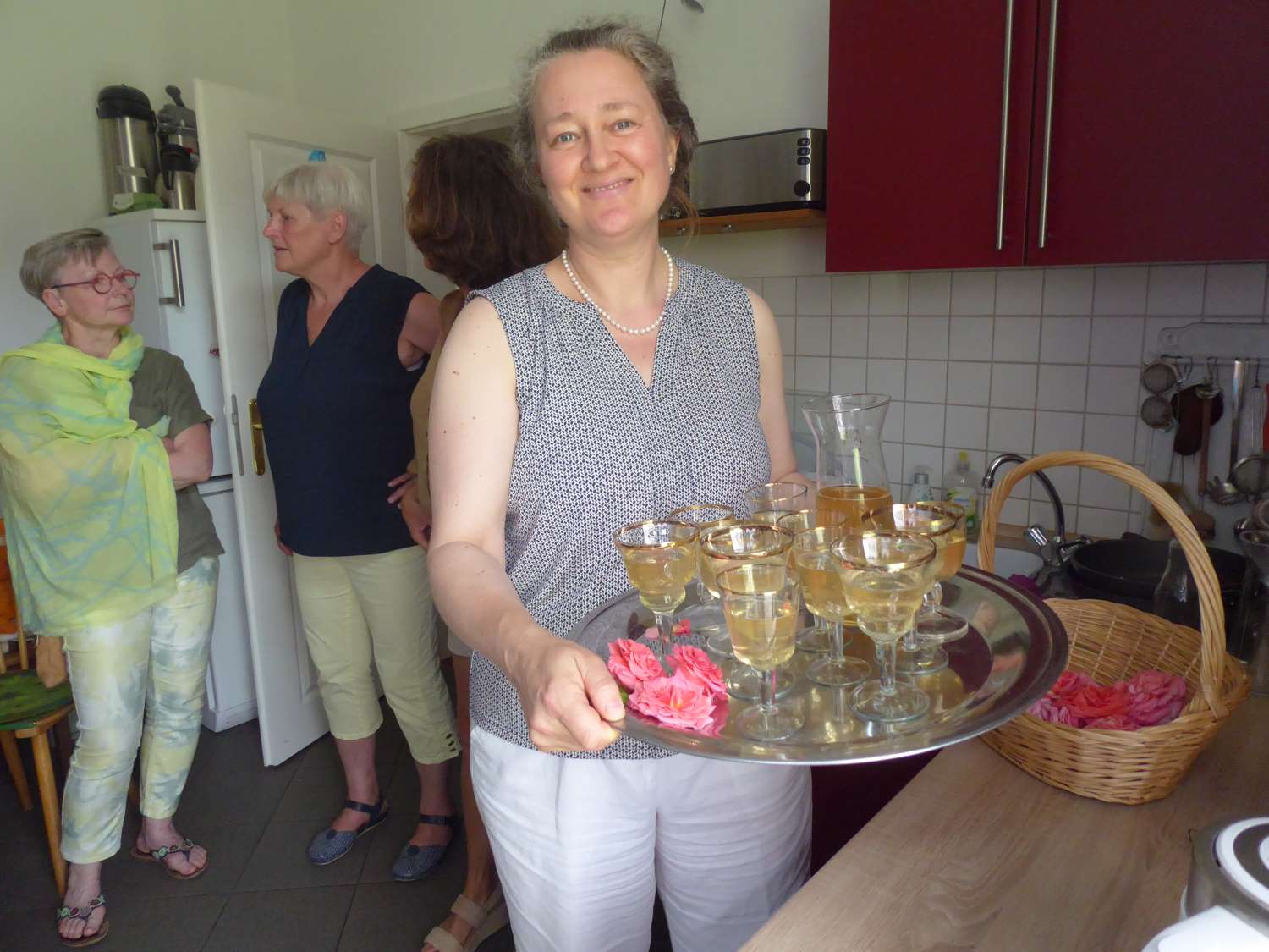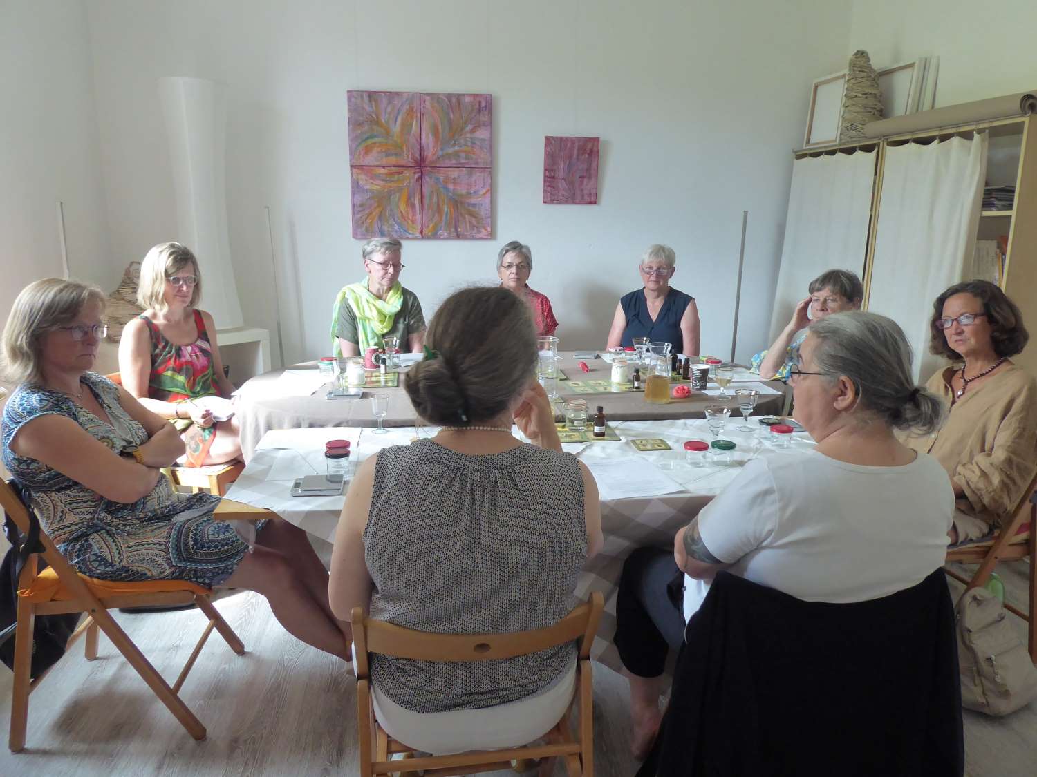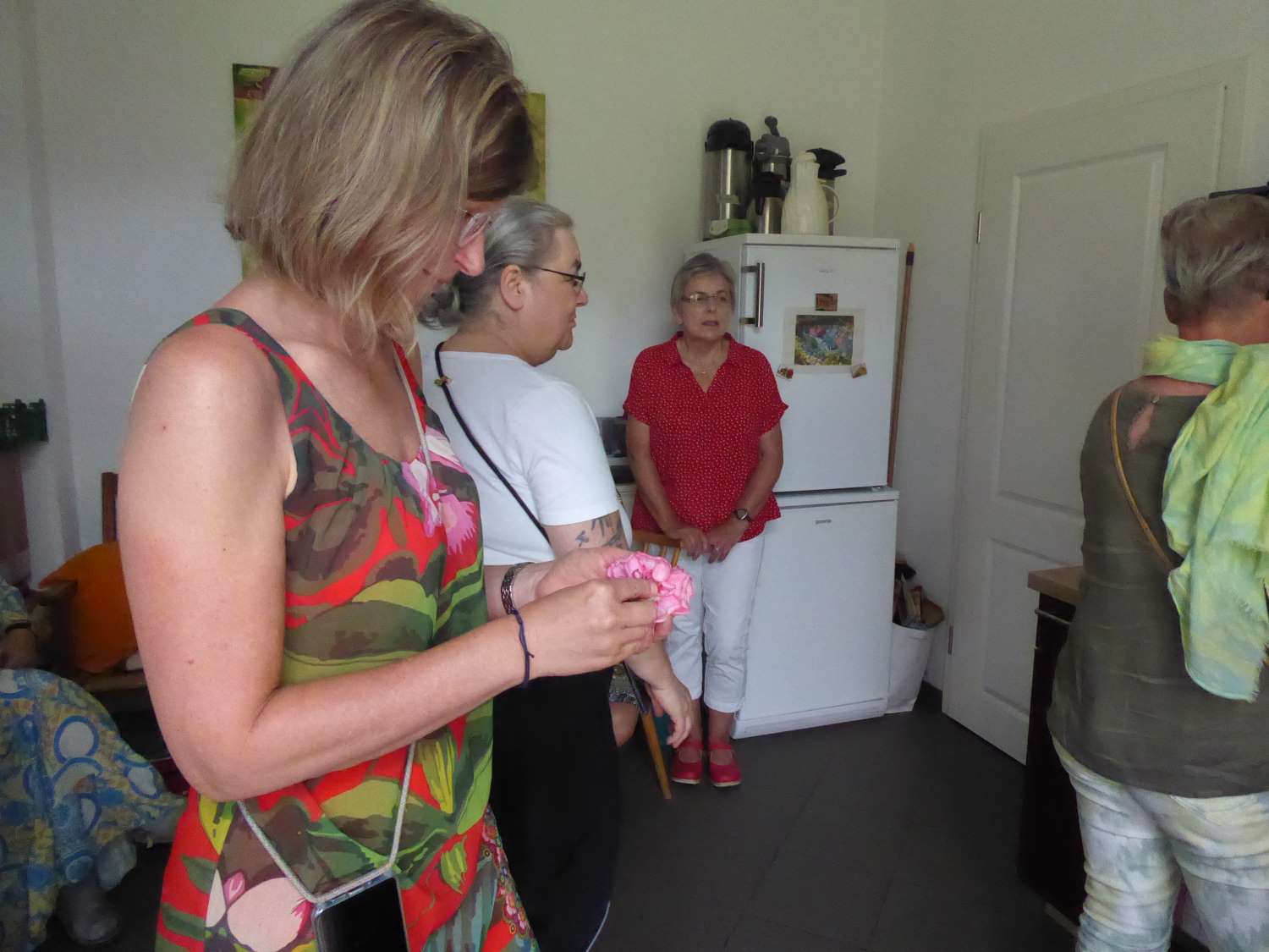Die Teilnehmerinnen hatten auf verschiedenen Wegen von dem Kurst erfahren, über Social Media, über den Flämingverteiler, durch Veranstaltungen, wie den „Offene Höfe Tag“ in der Nuthe-Nieplitz-Region, den Gabi Sußdorf auf ihrem früheren Standort in Tremsdorf, im nördlichen Teil der Reiseregion Fläming, veranstaltet und über Zeitungsmitteilungen. Sie kamen aus Berlin, Beelitz, aus dem Landkreis Teltow-Fläming und auch aus Sachsen-Anhalt. Gespannt warteten alle auf den fertigen Rosenextrakt, damit sie endlich ihre ganz persönliche Hautcreme herstellen konnten. Diese Art des Workshops sollte Gabi Sußdorf unbedingt wiederholen.