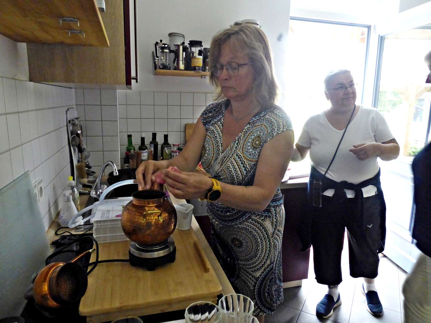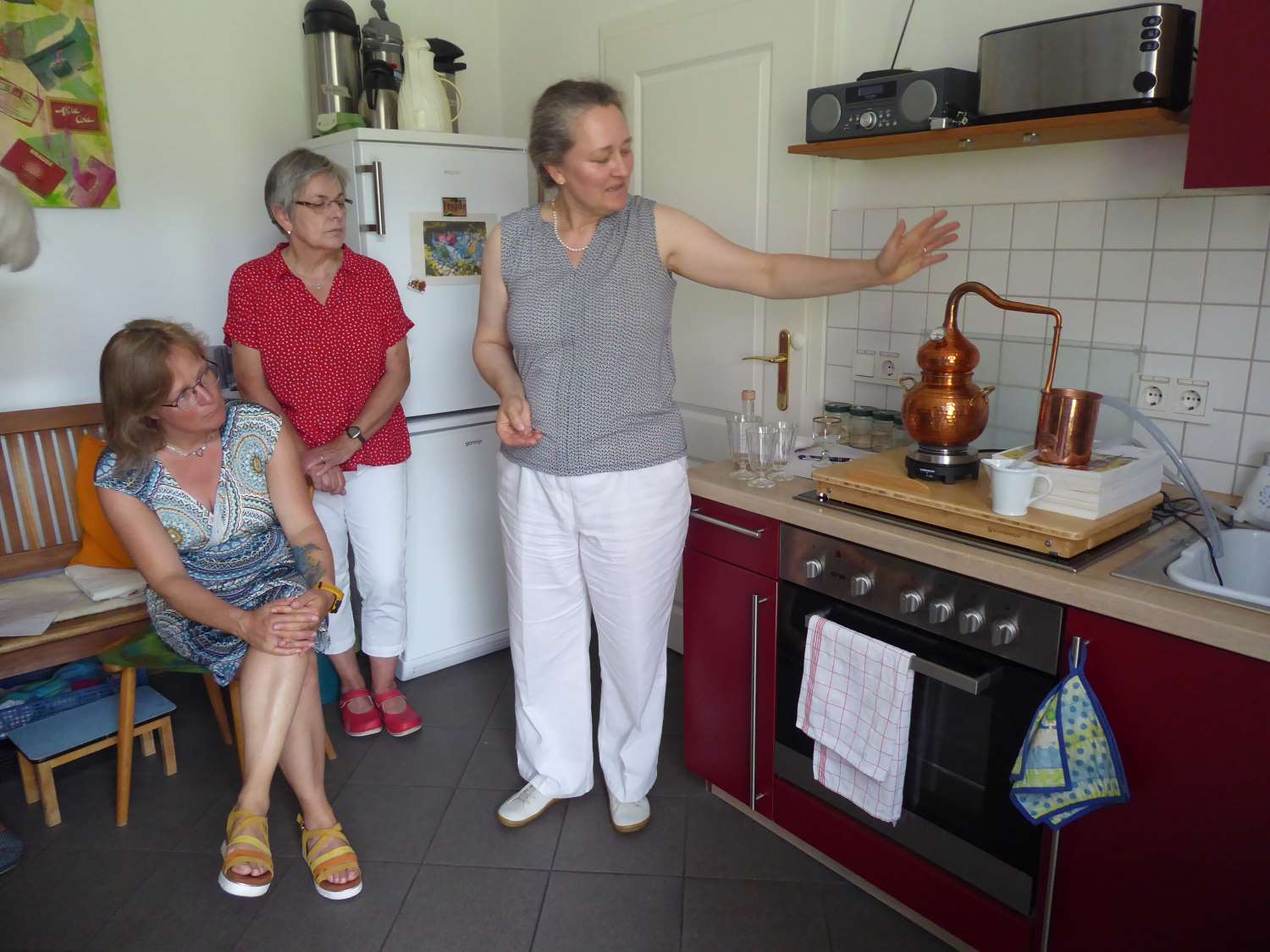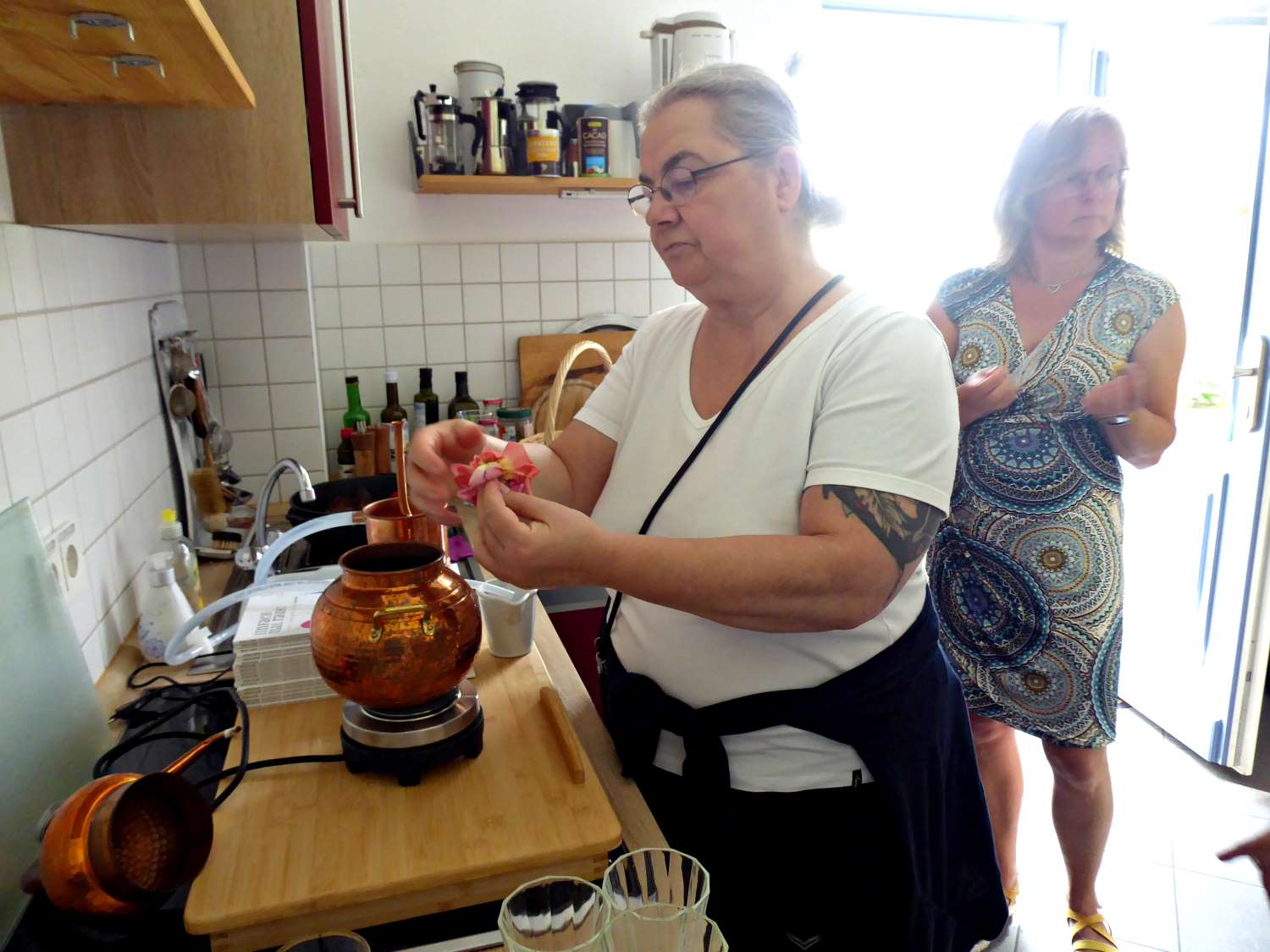 Schinken hatte aber im Rosencreme-Workshop natürlich nichts zu suchen – hier drehte sich alles um Wiesenburgs Parkprinzesschen. Bei der Rosenhydrolat-Gewinnung handelt es sich um eine Destillation direkt aus dem Wasserkessel heraus. Andere Pflanzenextrakte werden eher im Wasserdampf – in einem Aromakorb – extrahiert, was bei der Rose aufgrund von Rosenwachs-Anteilen nicht der optimale Weg ist. Solche und noch weitere Informationen bekamen die Teilnehmerinnen an beiden Tagen, denn es wurde gemeinsam destilliert. Die Destille wird mit Wasser gefüllt, hinein kommen die vielen Rosenblätter oder eben auch andere Natursubstanzen. Über eine Heizplatte wird das Wasser erhitzt und nimmt im Wasserdampf die unterschiedlichen Duftbestandteile der Rosenblätter mit. Über das sogenannte Geistrohr wird der Wasserdampf wieder flüssig und es entsteht das Destillat. Gabi Sußdorf fing das Hydrolat in drei Phasen der Destillation getrennt voneinander auf. Der Grund dafür ist, dass unterschiedliche Duftbestandteile der Rosen zu verschiedenen Zeiten der Destillation in den Wasserdampf übertreten. So riechen die ersten 100 ml ganz anders als die letzten 100 ml. Die Teilnehmerinnen konnten ihre Nasen beim Erschnuppern der unterschiedlichsten Aromen üben und dann entscheiden, welche Fraktion sie in ihre eigene Creme einarbeiten wollten.