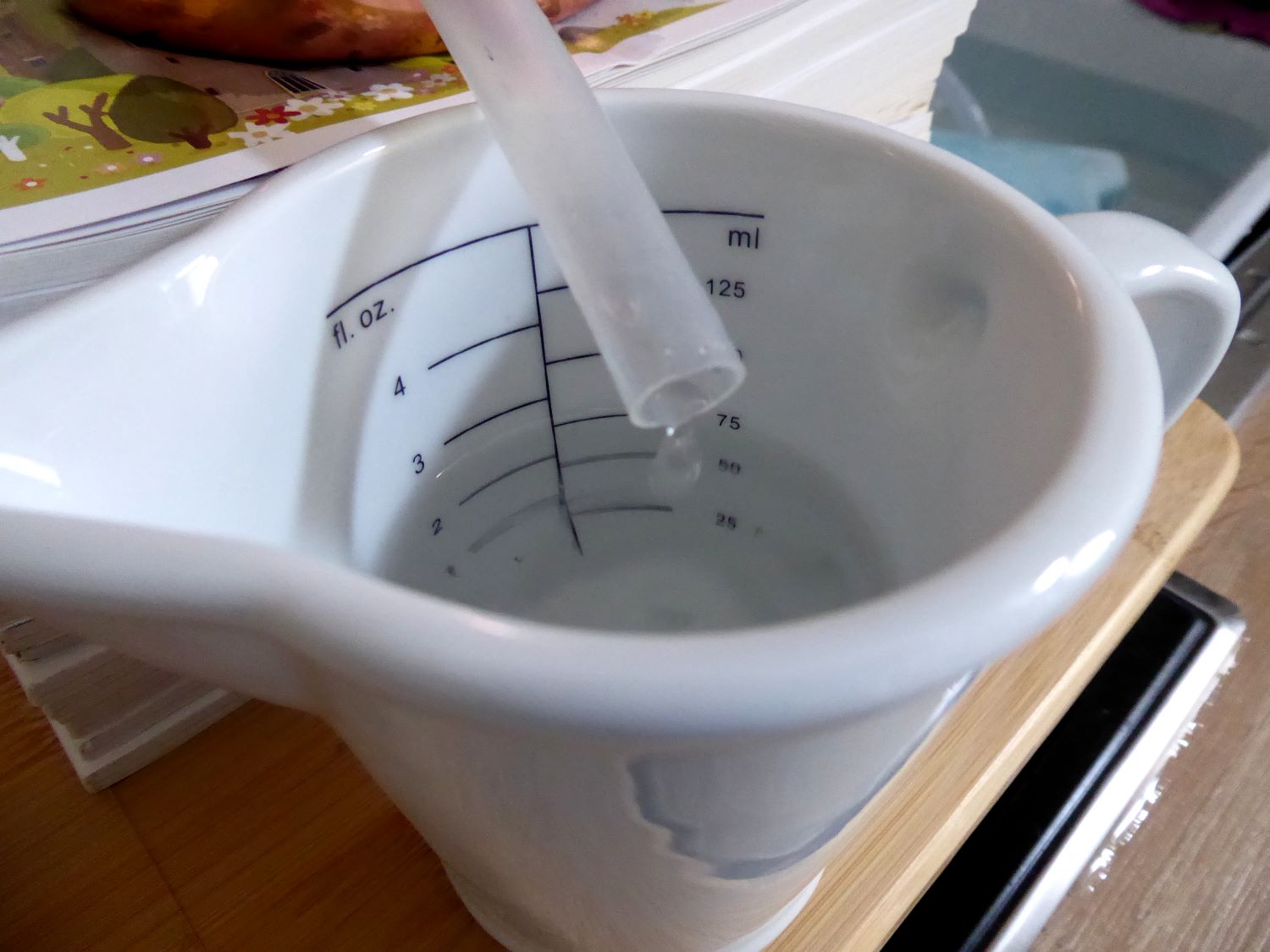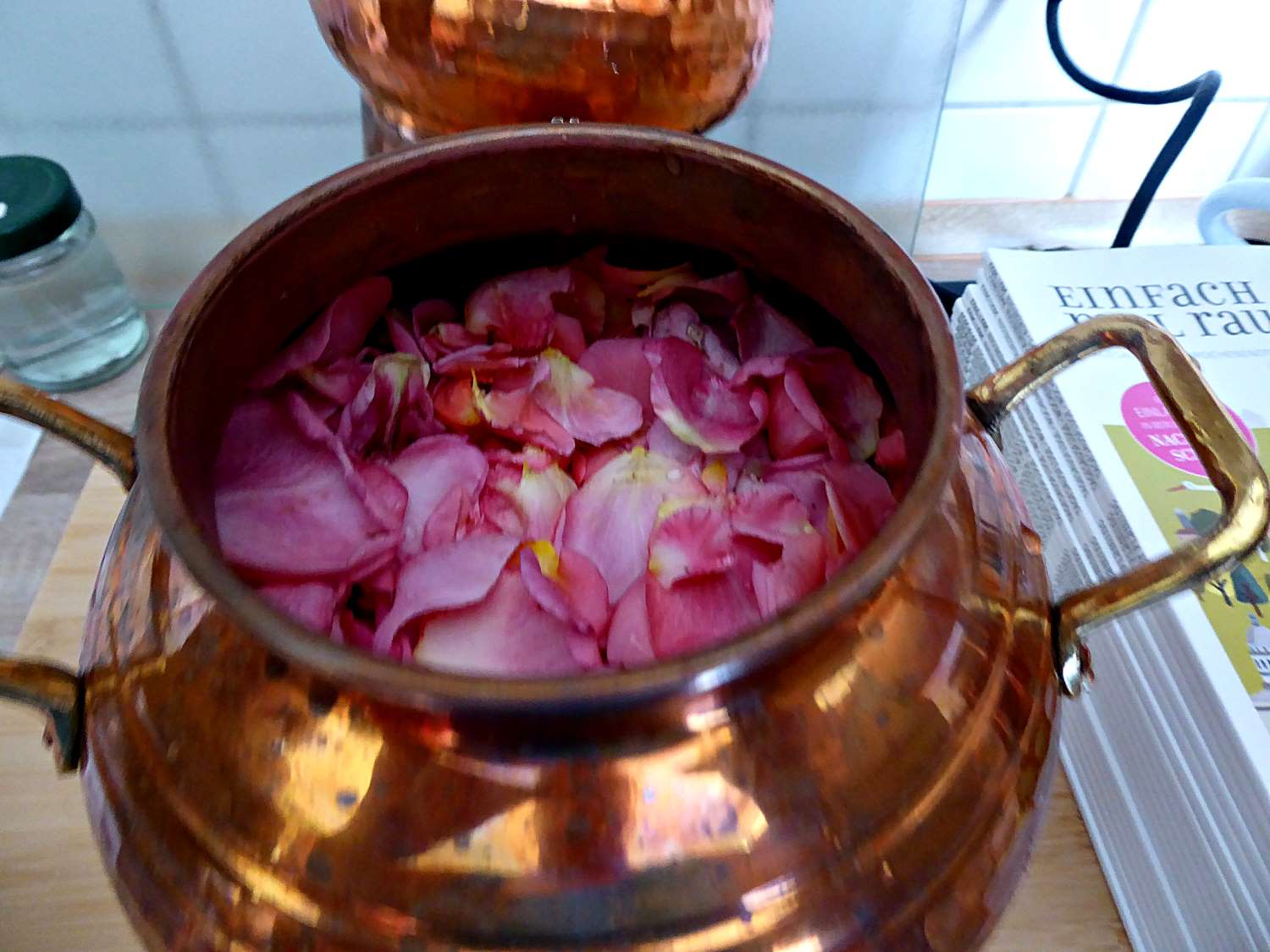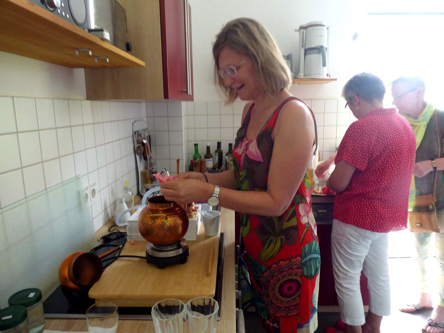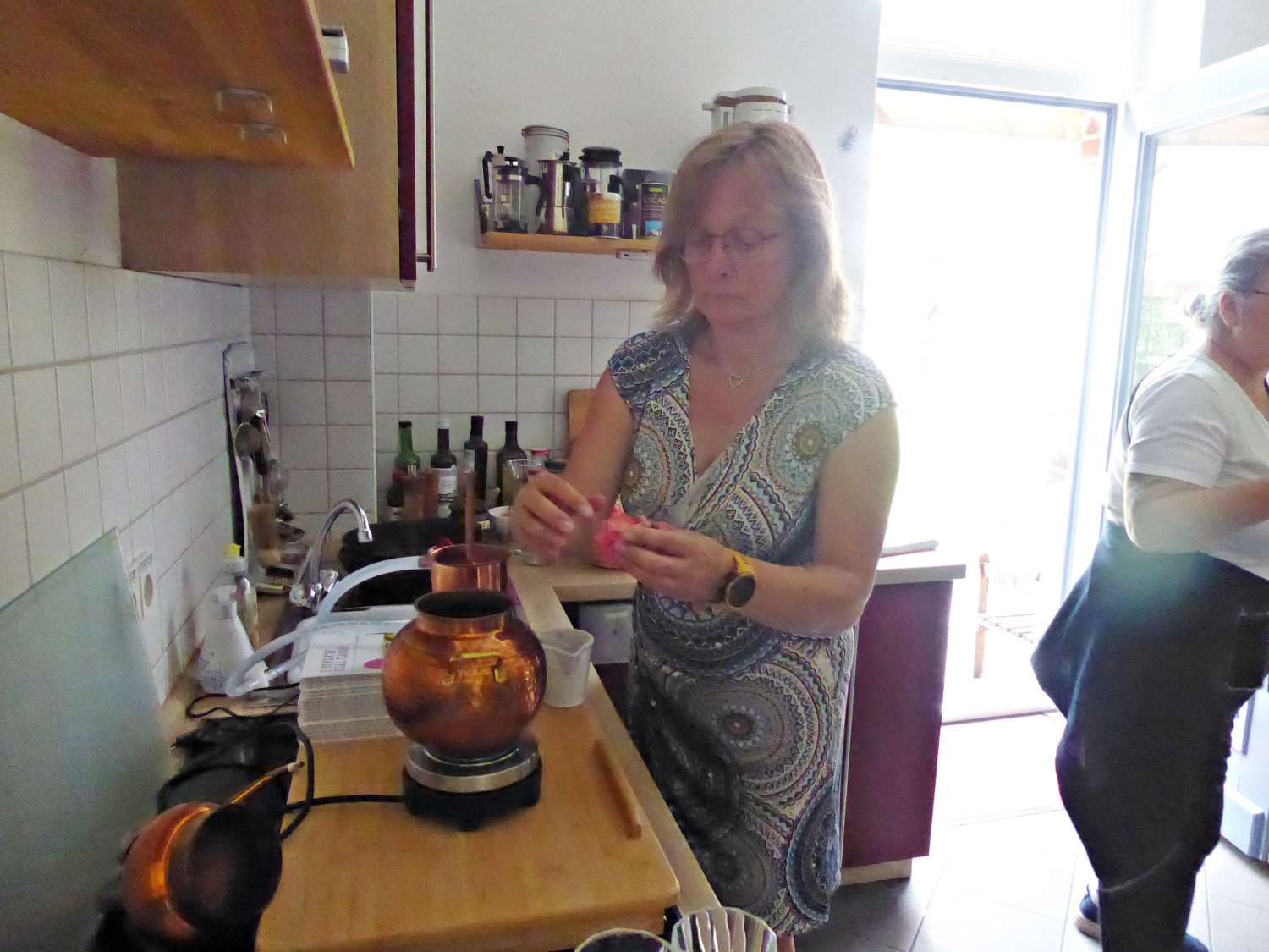 Schinken hatte aber im Rosencreme-Workshop natürlich nichts zu suchen – hier drehte sich alles um Wiesenburgs Parkprinzesschen. Bei der Rosenhydrolat-Gewinnung handelt es sich um eine Destillation direkt aus dem Wasserkessel heraus. Andere Pflanzenextrakte werden eher im Wasserdampf – in einem Aromakorb – extrahiert, was bei der Rose aufgrund von Rosenwachs-Anteilen nicht der optimale Weg ist. Solche und noch weitere Informationen bekamen die Teilnehmerinnen an beiden Tagen, denn es wurde gemeinsam destilliert. Die Destille wird mit Wasser gefüllt, hinein kommen die vielen Rosenblätter oder eben auch andere Natursubstanzen. Über eine Heizplatte wird das Wasser erhitzt und nimmt im Wasserdampf die unterschiedlichen Duftbestandteile der Rosenblätter mit. Über das sogenannte Geistrohr wird der Wasserdampf wieder flüssig und es entsteht das Destillat. Gabi Sußdorf fing das Hydrolat in drei Phasen der Destillation getrennt voneinander auf. Der Grund dafür ist, dass unterschiedliche Duftbestandteile der Rosen zu verschiedenen Zeiten der Destillation in den Wasserdampf übertreten. So riechen die ersten 100 ml ganz anders als die letzten 100 ml. Die Teilnehmerinnen konnten ihre Nasen beim Erschnuppern der unterschiedlichsten Aromen üben und dann entscheiden, welche Fraktion sie in ihre eigene Creme einarbeiten wollten.