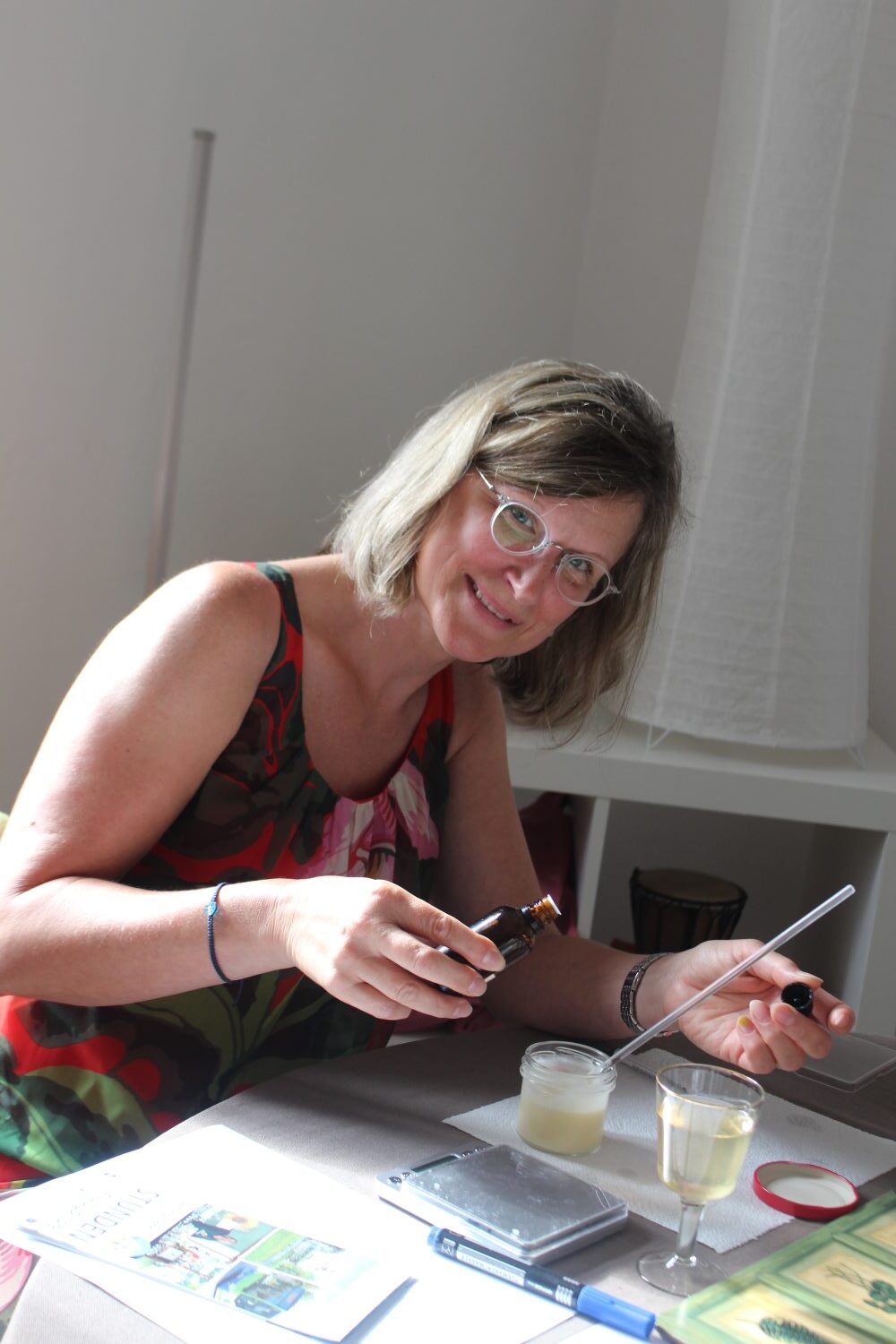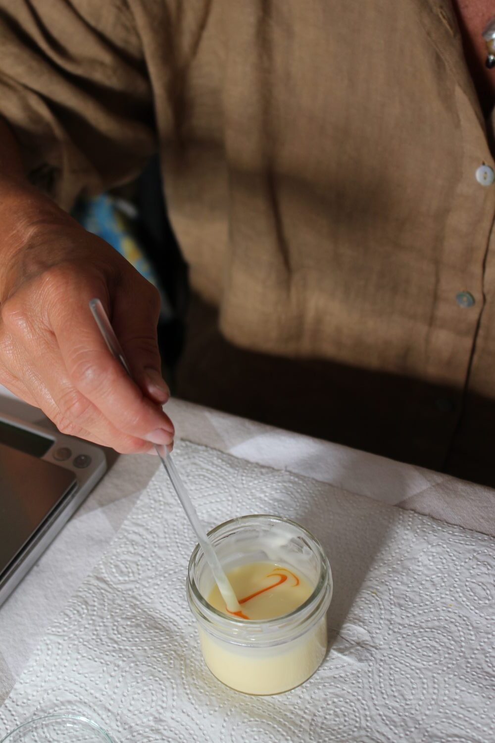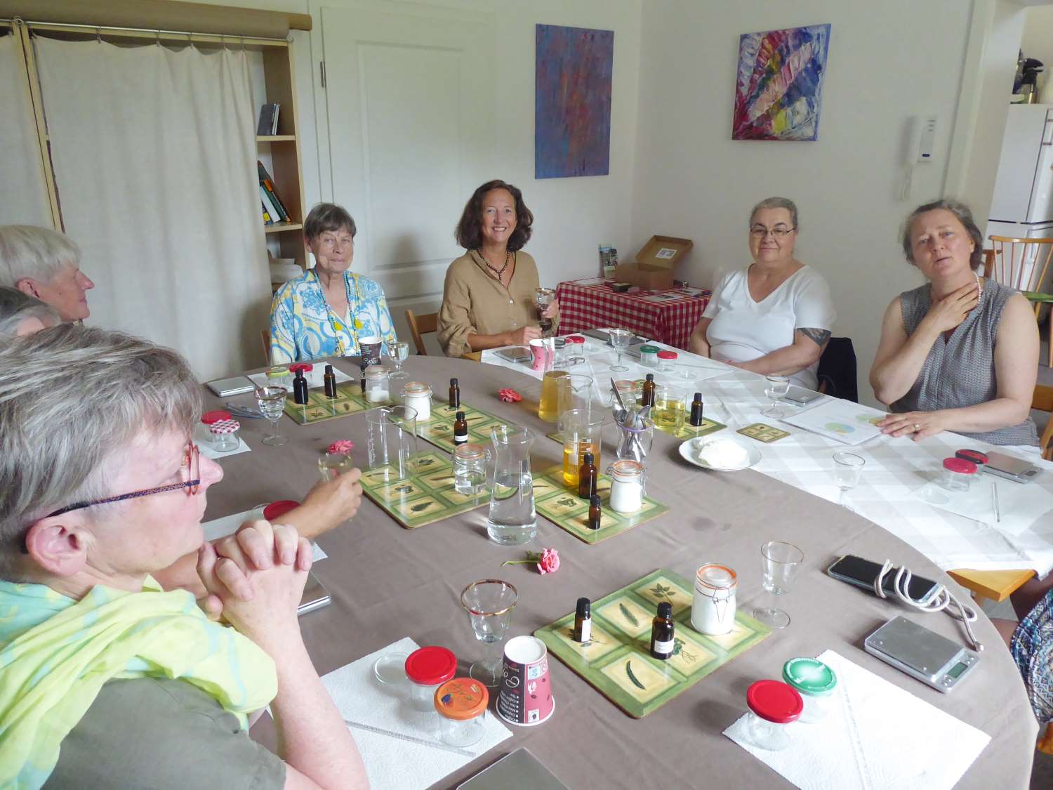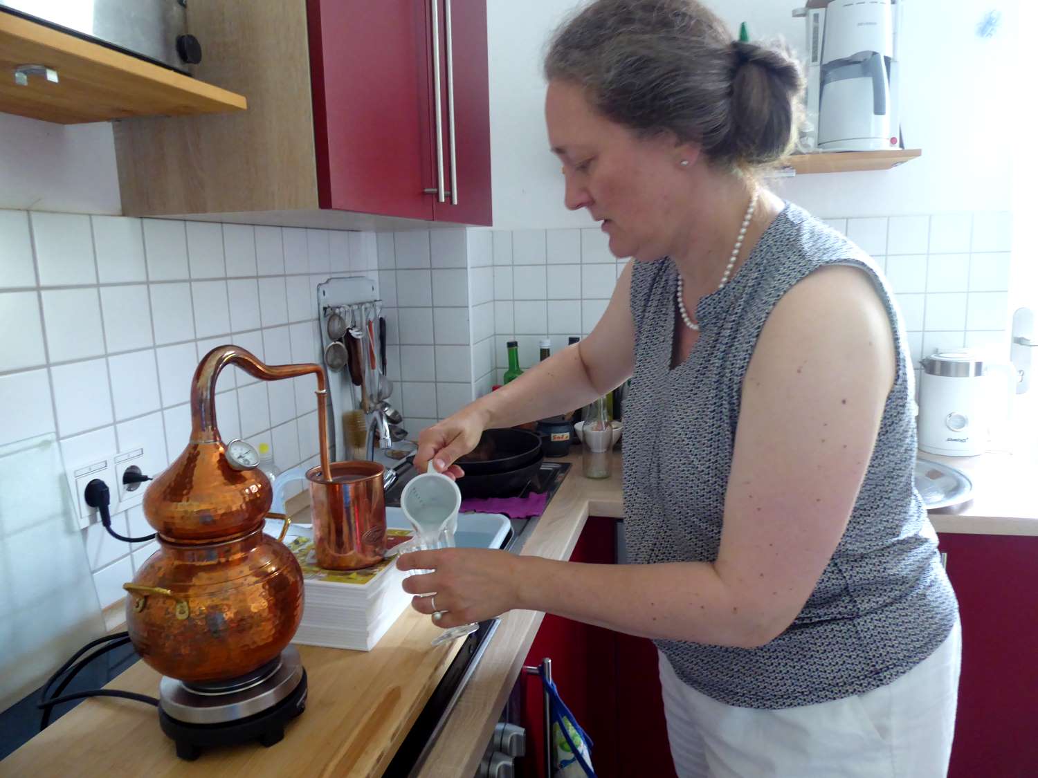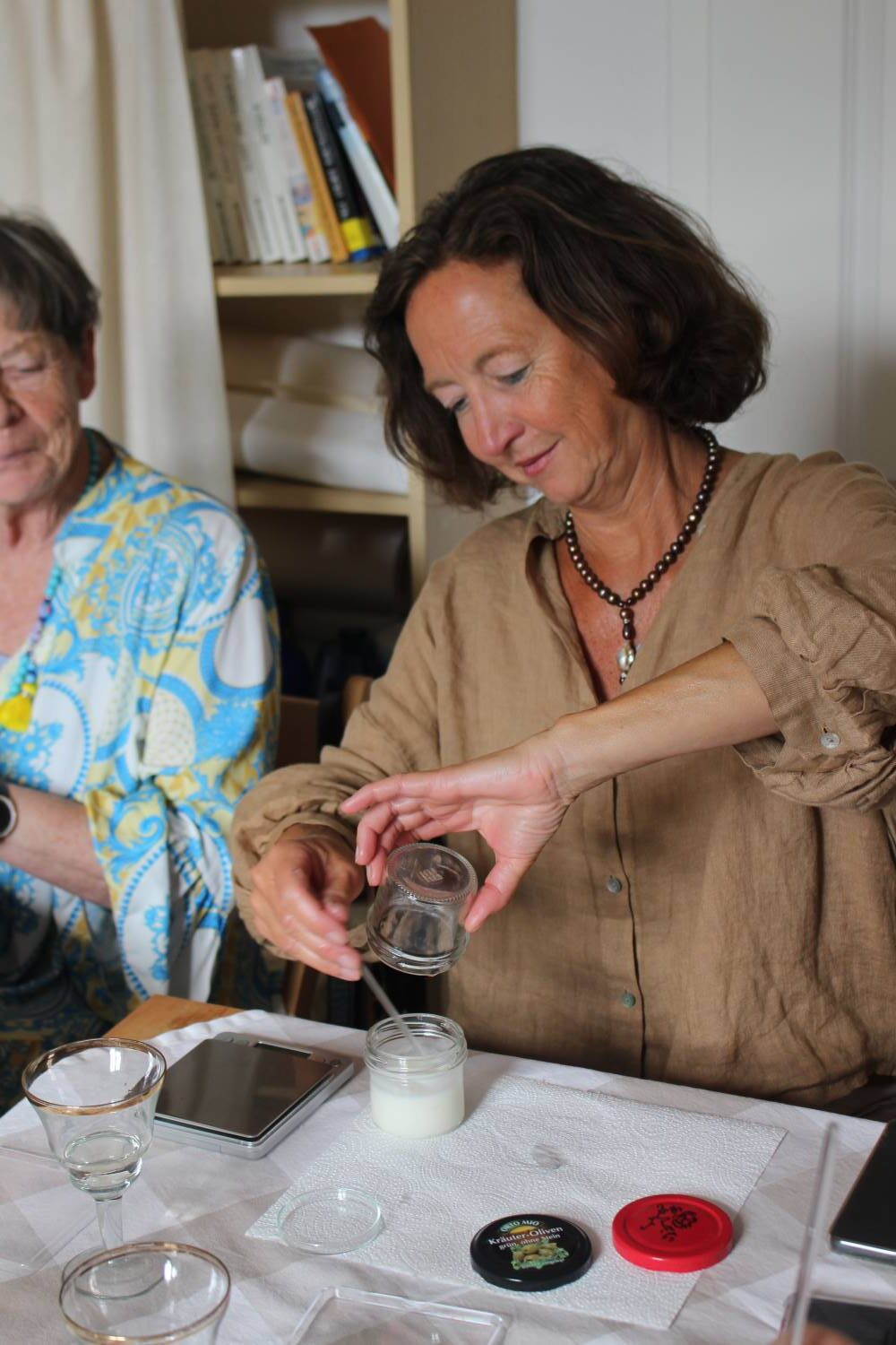 Während die Destille vor sich hin köchelte, besprach Gabi Sußdorf mit den Gästen die Theorie der Cremeherstellung. Dabei erklärte sie genau, welche Rohstoffe für die Haut gut und welche unvorteilhaft sind. Unsere Haut „produziert“ viele eigene Pflegesubstanzen durch hydrolytische enzymatische Prozesse in den Hautzellen selber. Diesen Prozess möchte die gelernte Laborantin durch eine kluge Zusammenstellung der Cremerezeptur unterstützen. In den Gläsern und Flaschen, die auf dem Workshoptisch standen, fanden sich etliche Rohstoffe wieder, die unsere Haut durch eben diese eigene Arbeit kennt und auf die sie entsprechend positiv reagiert. Natürlich fanden keine mineralölhaltigen Zutaten Einzug in die Creme.