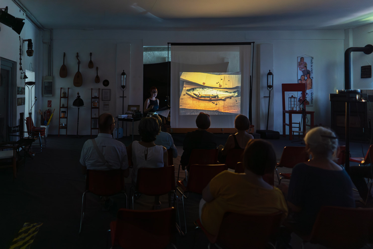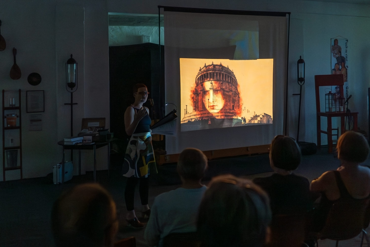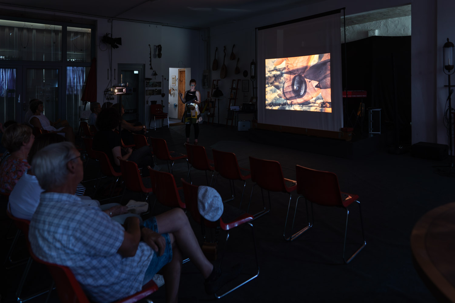 Im KleinKunstWerk wartete auf die über 50 Interessierten eine besondere künstlerische Idee. Shakti Paqué sammelt alte Dias und sucht nach Paaren, die übereinandergelegt zu einer neuen Geschichte einladen. Zu lösen galt es ein wahres Puzzle, denn natürlich passten nicht einfach zwei Bilder zusammen. Beschneiden oder Bearbeiten mit Photoshop ging auch nicht. Die gefundenen Kombinationen zeigte Paqué anderen Personen, die dazu spontan eine Geschichte erfinden sollten. Im KleinKunstWerk präsentierte sie den begeisterten Besuchern dann einige der Bildkompositionen und die zugehörigen Geschichten. Wie in der Ankündigung versprochen wurde es „märchenhaft, skurril, witzig, machchmal gruselig und immer wunderlich“. Die Künstlerin hatte alten Bildern von Profis und von Laien ein neues Leben eingehaucht.