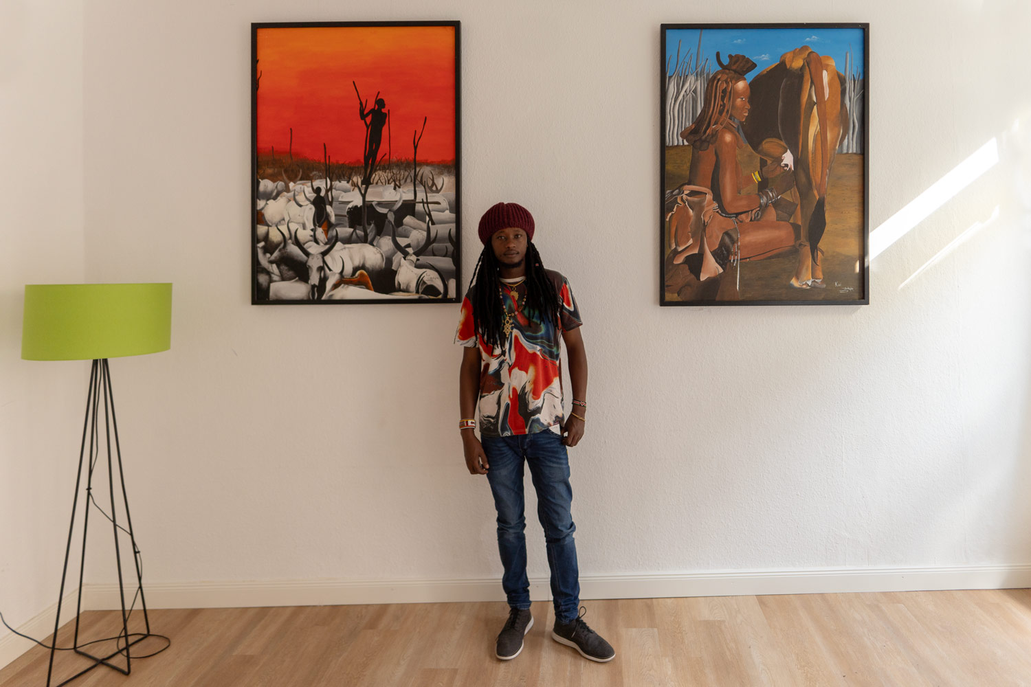 Im Sandberger Kreativstudio gab es gleich eine doppelte Premiere zu erleben. Nicht nur nahm das Studio selbst zum ersten Mal daran teil, sondern auch der ausstellende Künstler, der Kenianer Kelvin Kior Nganga. Der junge Künstler präsentiert ein reifes Werk und gehört damit sicher zu den großen Entdeckungen dieses Kunstbummels. Er lebt im Übergangswohnheim am Weitzgrunder Weg in Bad Belzig. In seiner Heimatstadt Nairobi hatte er die Kunstakademie besucht. Er arbeitet nicht nur als Maler, sondern produziert auch Grifiken und Videos. Aktuell gibt er im Infocafé „Der Winkel“ Workshops „Express Yourself – Free Art Workshop“. Seine Arbeiten präsentiert er auch auf Instagram.