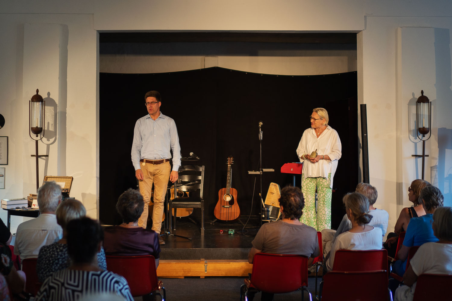 Am Abend konnte man sie gemeinsam mit ihrem Mann Mathias im KleinKunstWerk bei einem Liederabend als Duo „MON MARRI ET MOI“ erleben. Zu diesem kam überraschend auch Bürgermeister Robert Pulz, der auf die angesprochenen Terminprobleme einging und versprach, dass das im nächsten Jahr besser laufen soll. „So oder so oder so“, hieß dann passend auch gleich das erste Lied von Shakti und Mathias Paqué. Ihre „Lieder aus der tiefsten Provinz“ begeisterten mit auf die Spitze getriebenen Alltagsbeobachtungen. Sie nahmen Wortungetüme wie „7-Zonen-Tonnentaschen-Federkern-Matratze“ ebenso aufs Korn wie Klatsch und Tratsch und endlose Handygespräche in der Bahn. Die unterhaltsamen Chansons kamen an, eine Zugabe war Pflicht.