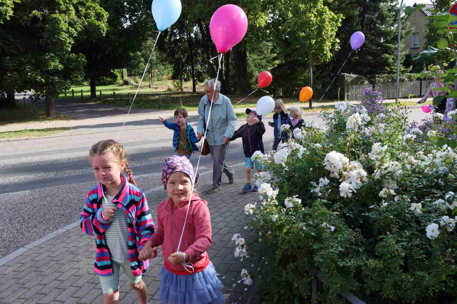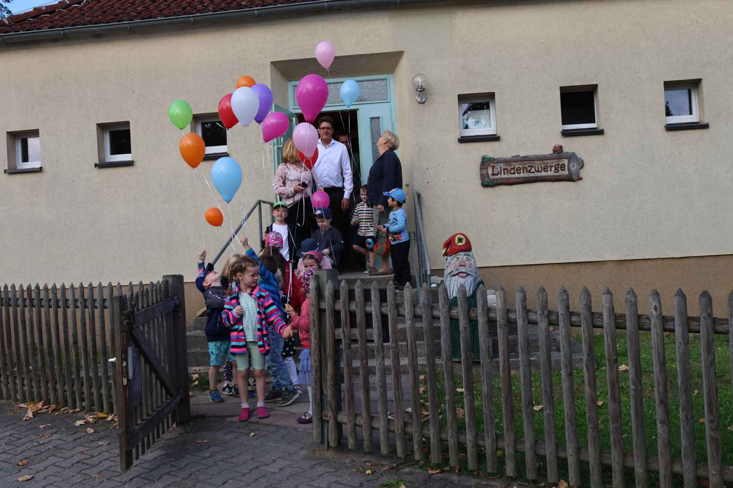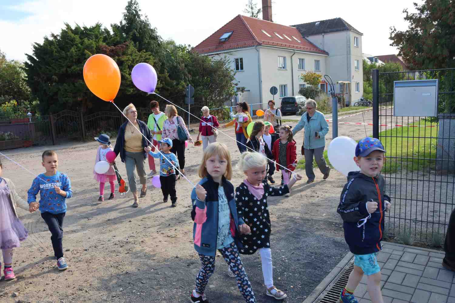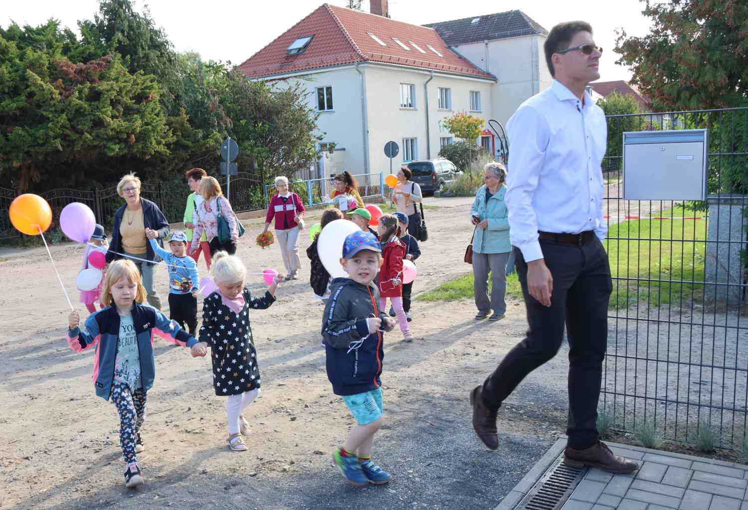 Ausgestattet mit vielen bunten Luftballons machte sich der bunte Zug auf den Weg in die Ernst-Thälmann-Straße. Dort wurden sie mit großem Hallo auf dem Spielplatz von den anderen Kindern empfangen. Diese begrüßten sie mit einem lustigen Lied. Anschließend ließen alle ihre Luftballons in den Himmel steigen. Dann ging es für die Kinder auf den Spielplatz, während sich alle anderen Gäste in der Kita umsahen. Die Begeisterung war allen anzusehen, besonders der große Sportraum faszinierte. Dieser kann außerhalb der Kita-Zeiten auch für kleine Sportgruppen oder andere Aktivitäten genutzt werden. Das Highlight ist jedoch der Wasserspielplatz, der jedoch noch nicht ganz fertig ist. „Der Erzieher, der mit den Kindern dort hinein geht, sollte Wechselsachen dabei haben“, schmunzelte Steven Baltot. Denn das wird wohl der Lieblingsort der Kinder werden.