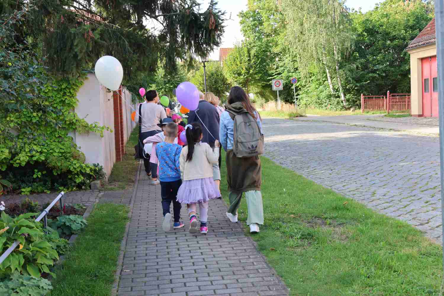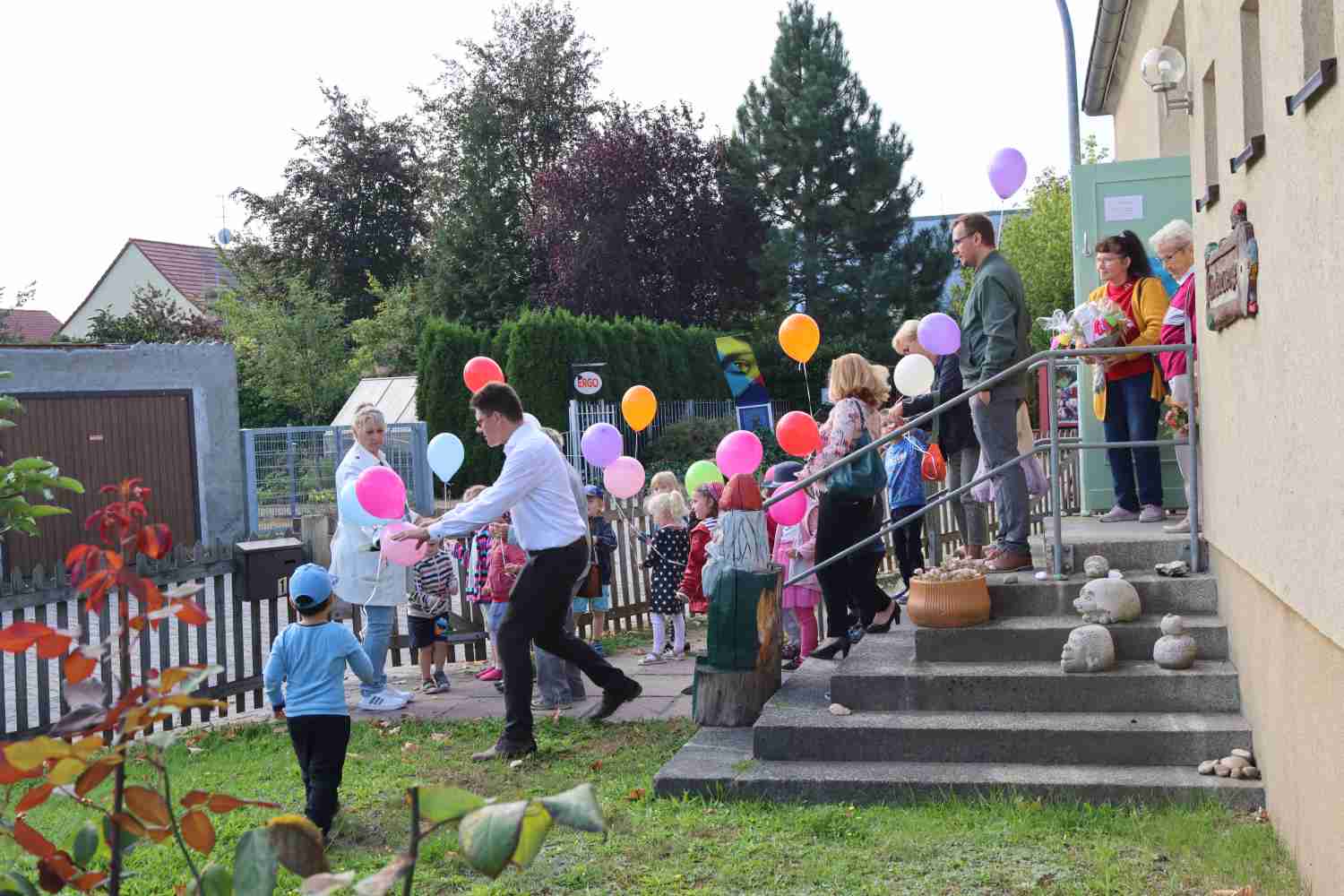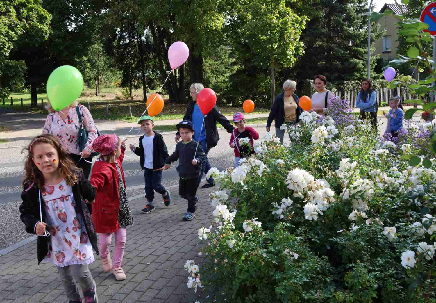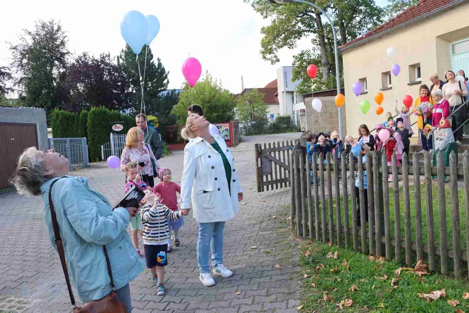 Ausgestattet mit vielen bunten Luftballons machte sich der bunte Zug auf den Weg in die Ernst-Thälmann-Straße. Dort wurden sie mit großem Hallo auf dem Spielplatz von den anderen Kindern empfangen. Diese begrüßten sie mit einem lustigen Lied. Anschließend ließen alle ihre Luftballons in den Himmel steigen. Dann ging es für die Kinder auf den Spielplatz, während sich alle anderen Gäste in der Kita umsahen. Die Begeisterung war allen anzusehen, besonders der große Sportraum faszinierte. Dieser kann außerhalb der Kita-Zeiten auch für kleine Sportgruppen oder andere Aktivitäten genutzt werden. Das Highlight ist jedoch der Wasserspielplatz, der jedoch noch nicht ganz fertig ist. „Der Erzieher, der mit den Kindern dort hinein geht, sollte Wechselsachen dabei haben“, schmunzelte Steven Baltot. Denn das wird wohl der Lieblingsort der Kinder werden.
