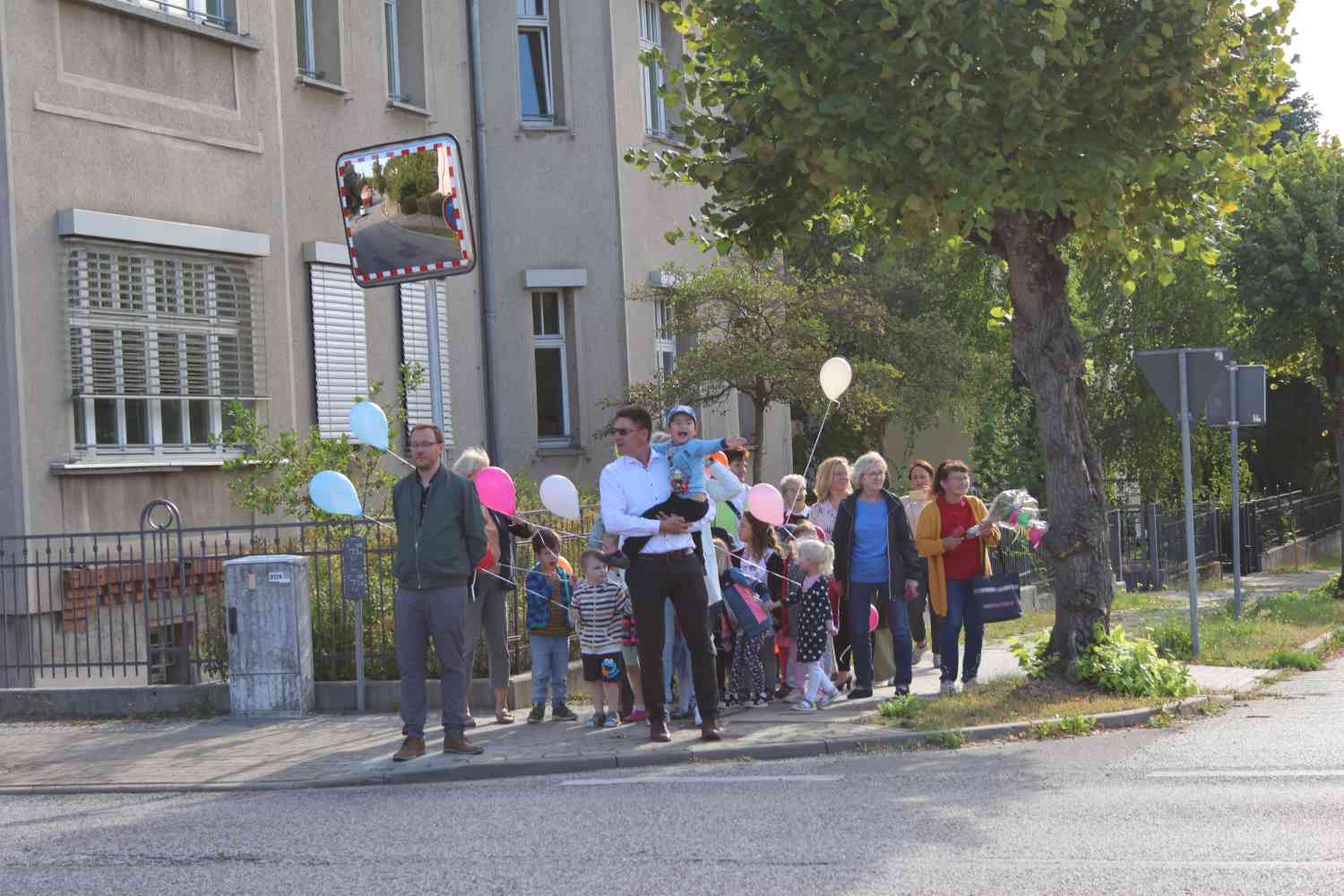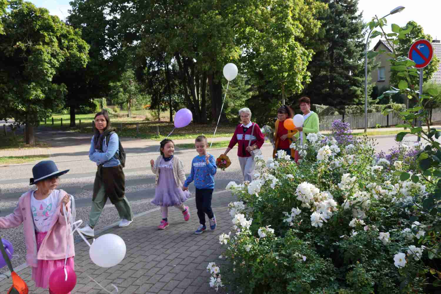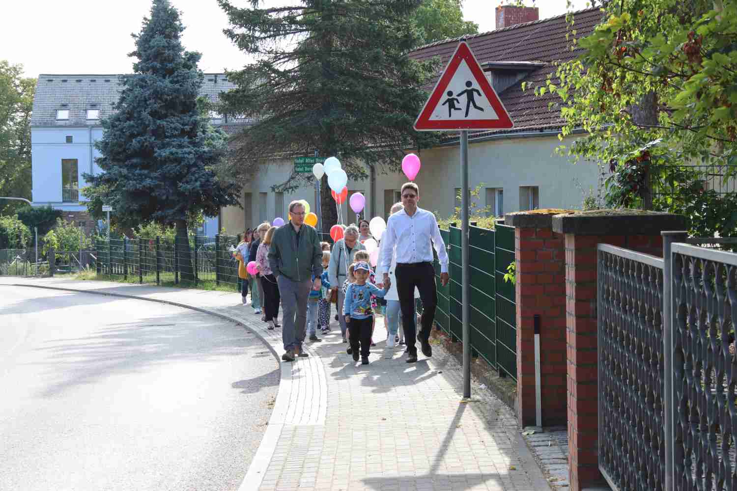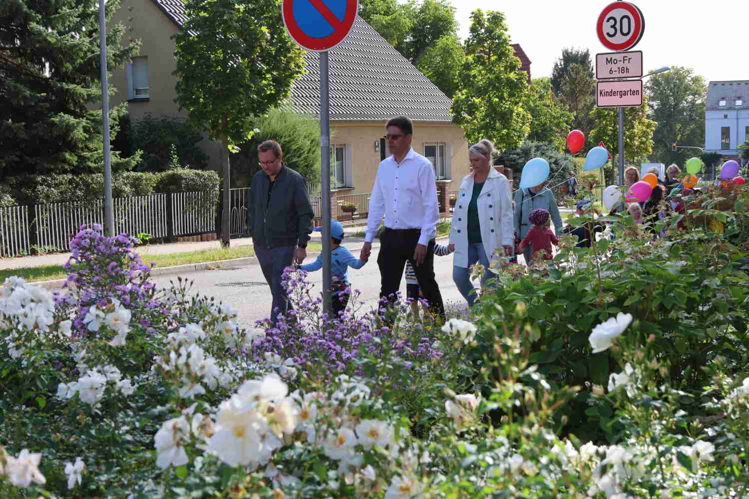Ausgestattet mit vielen bunten Luftballons machte sich der bunte Zug auf den Weg in die Ernst-Thälmann-Straße. Dort wurden sie mit großem Hallo auf dem Spielplatz von den anderen Kindern empfangen. Diese begrüßten sie mit einem lustigen Lied. Anschließend ließen alle ihre Luftballons in den Himmel steigen. Dann ging es für die Kinder auf den Spielplatz, während sich alle anderen Gäste in der Kita umsahen. Die Begeisterung war allen anzusehen, besonders der große Sportraum faszinierte. Dieser kann außerhalb der Kita-Zeiten auch für kleine Sportgruppen oder andere Aktivitäten genutzt werden. Das Highlight ist jedoch der Wasserspielplatz, der jedoch noch nicht ganz fertig ist. „Der Erzieher, der mit den Kindern dort hinein geht, sollte Wechselsachen dabei haben“, schmunzelte Steven Baltot. Denn das wird wohl der Lieblingsort der Kinder werden.