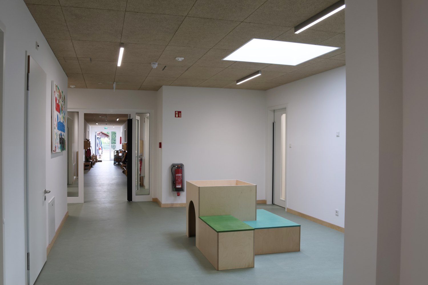Mit nur einem Monat Verspätung ging die Kita in Betrieb. Das lag vor allem am Fachkräftemangel der beauftragten Firmen. Diese erledigen gerade die Restarbeiten. So waren Handwerker am Besuchstag der „Lindenzwerge“ gerade dabei, die Photovoltaikanlage anzuschließen. „Wir haben schon sehr nachhaltig geplant“, bestätigt Steven Baltot, „so können wir sehr autark sein.“ Dass es überhaupt so schnell ging mit dem Bau, liegt an der Modulbauweise. Stein auf Stein wäre der Bau in so kurzer Zeit nicht möglich gewesen.