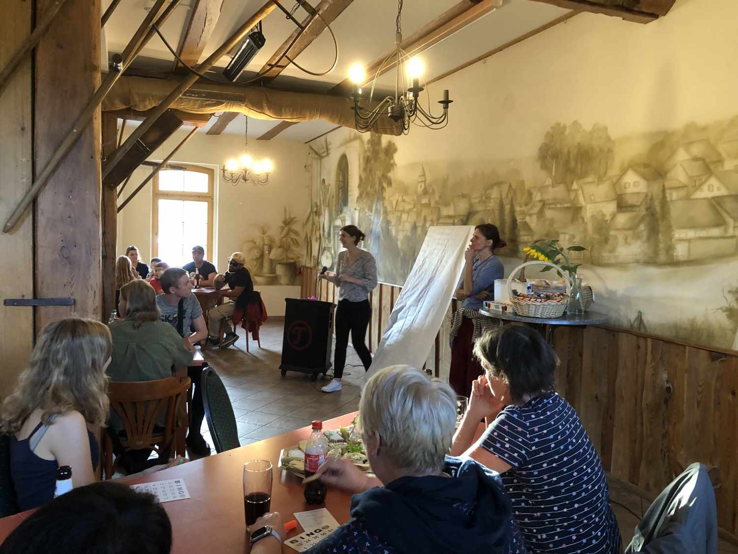 Während einer kleinen Pause konnten spannende Gespräche geführt werden. Und….ein kleines Rätsel zu Görzke konnte von den der Gruppe an den Tischen gelöst werden. So wurden auch Sagen und schöne Fakten aus dem Ort in Erinnerung gerufen. Der Gewinnertisch wurde mit einem Gläschen Sekt zum Anstoßen auf die gelungene Gemeinschaftsarbeit belohnt.