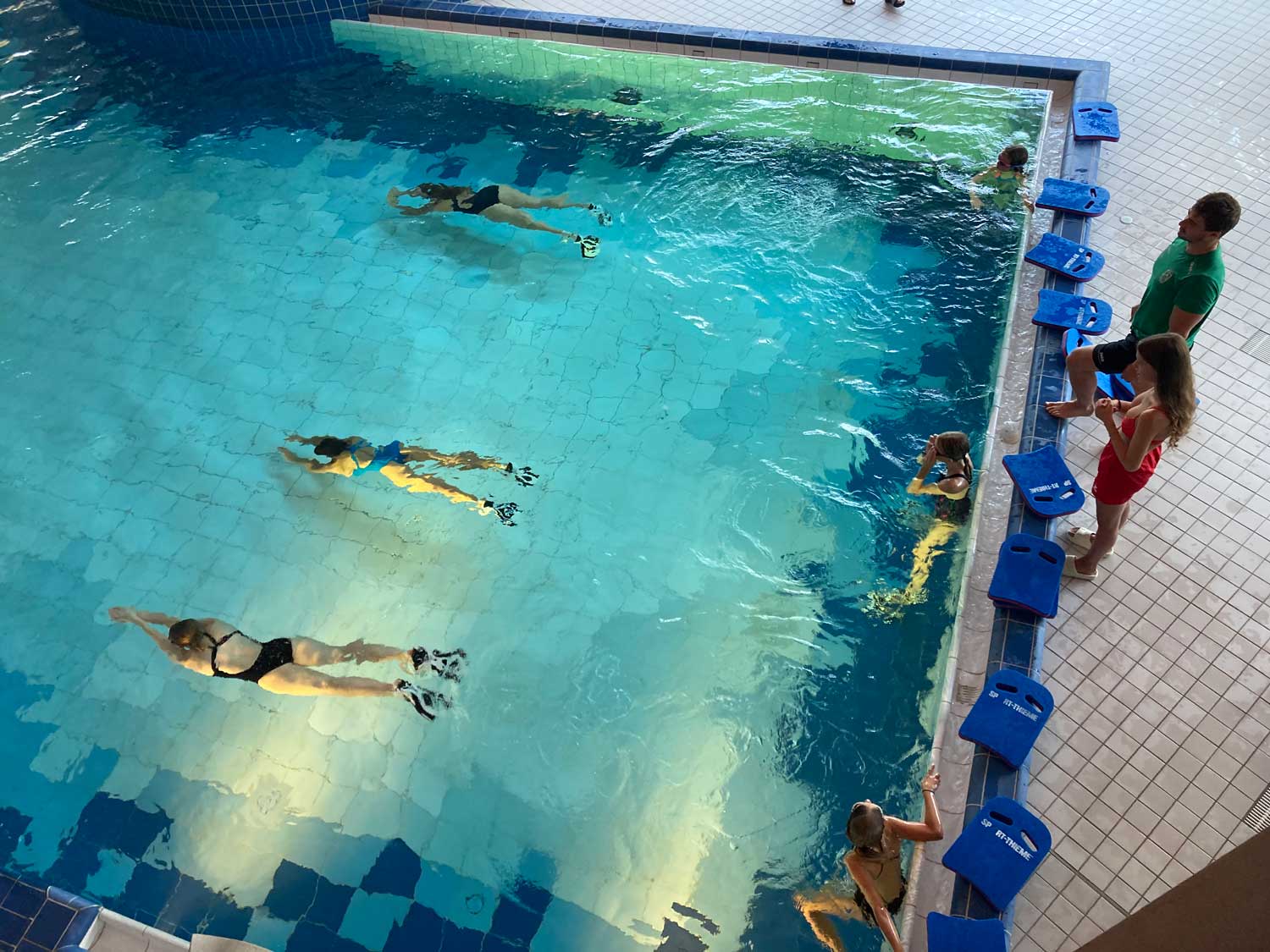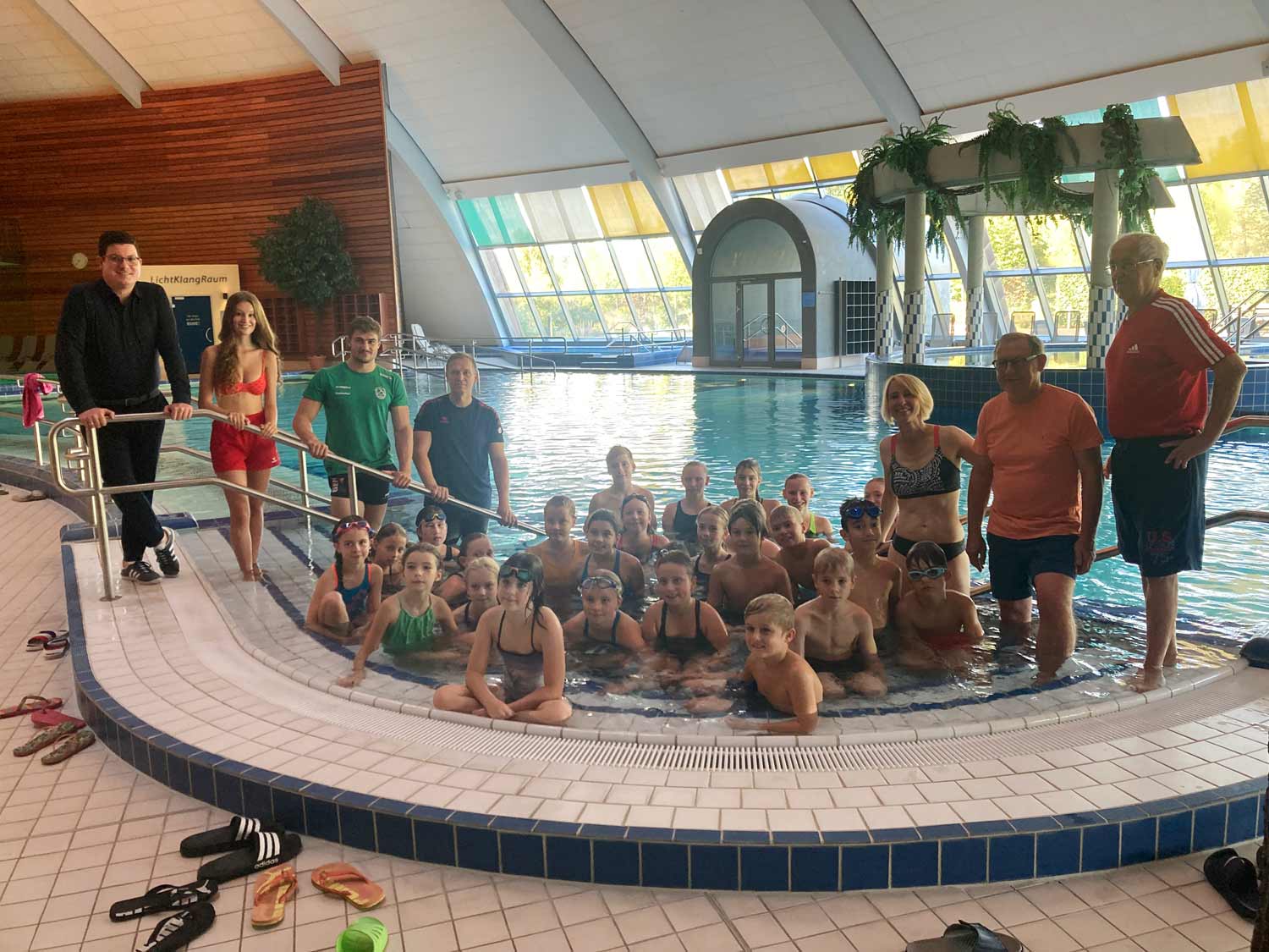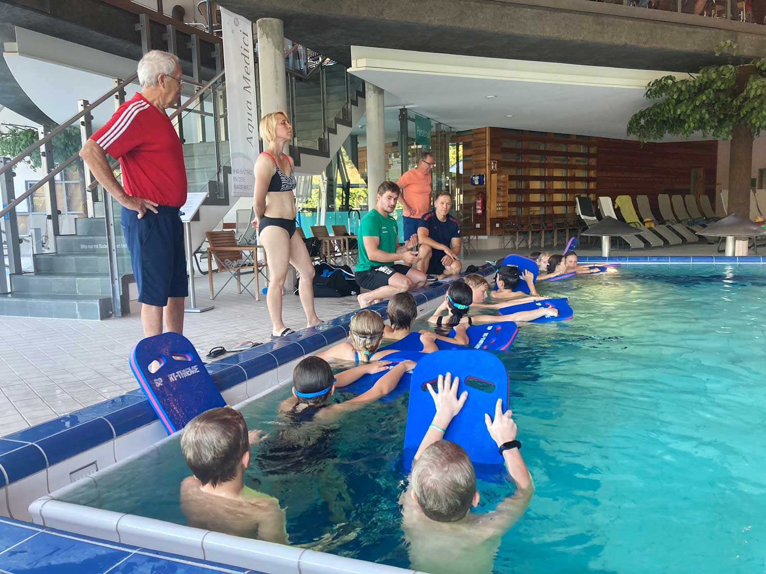 Mit großen Augen und erwartungsvollen Blicken horchten die Kids den Worten des Weltrekordlers. Nach einer kurzen Begrüßung konzentrierten sich alle Kinder sowie Trainer und Trainerinnen auf die Sporteinheit. Nach dem Einschwimmen mit unterschiedlichsten Schwimmarten wurde geübt, an den Techniken gefeilt, Verbesserungsvorschläge gemacht, Hilfestellungen gegeben und mit Brettern und Flossen geschwommen.