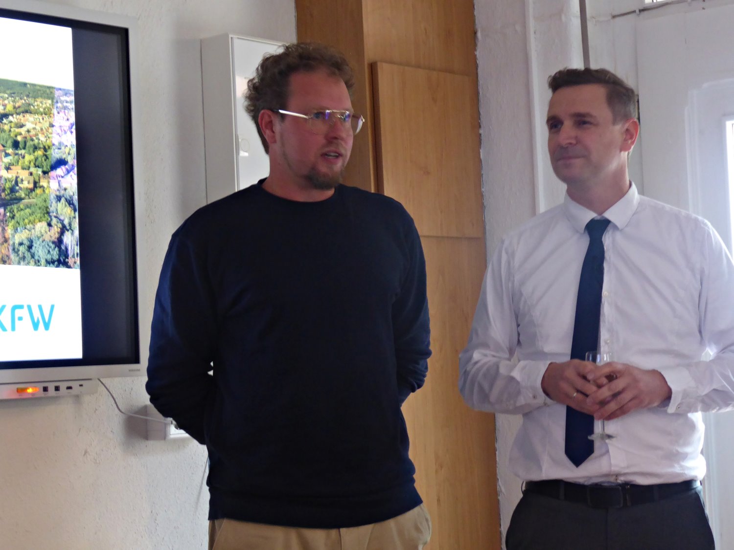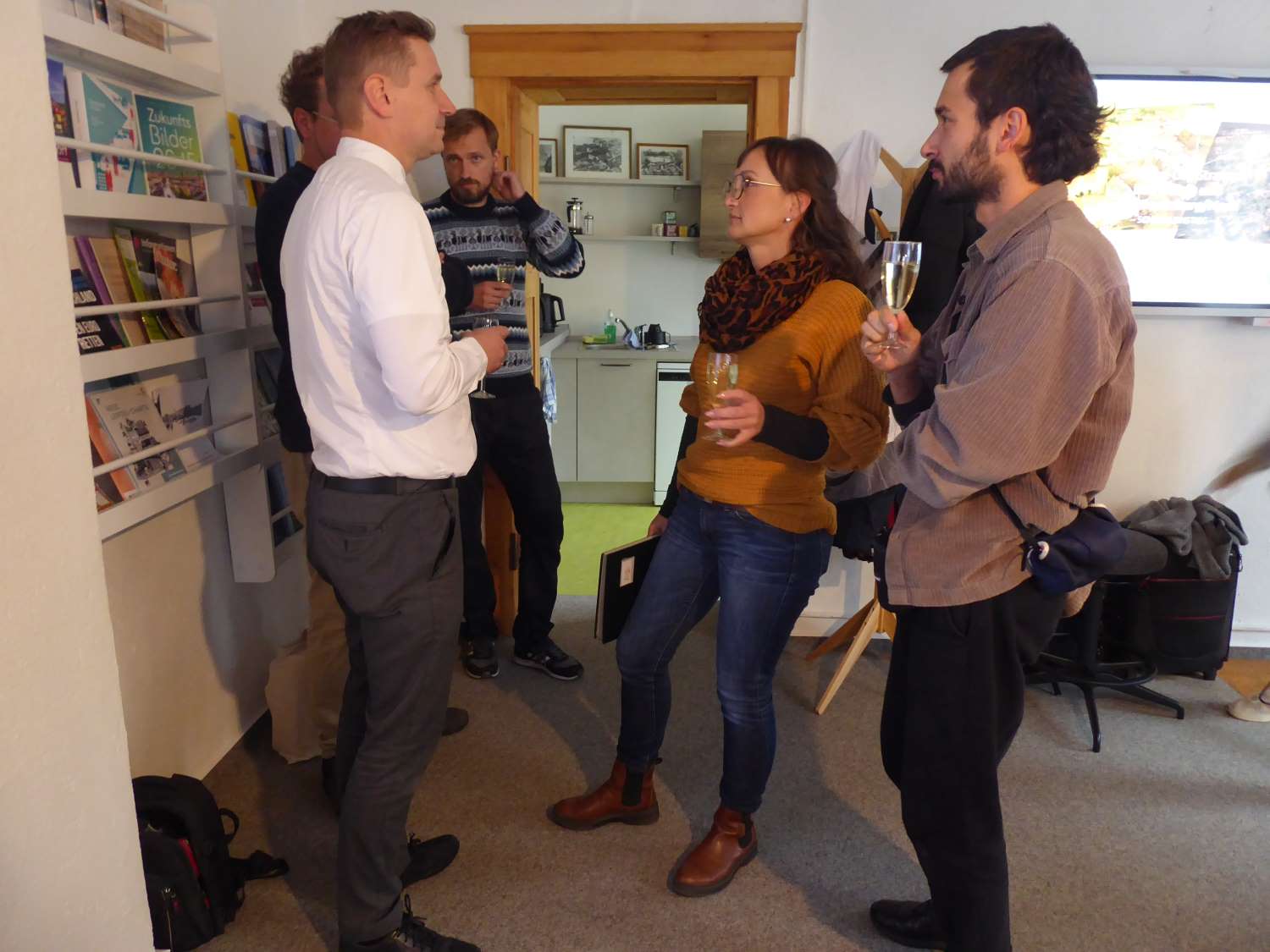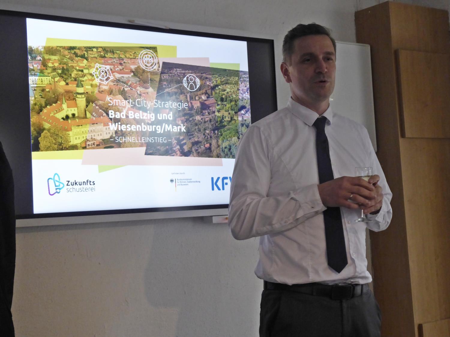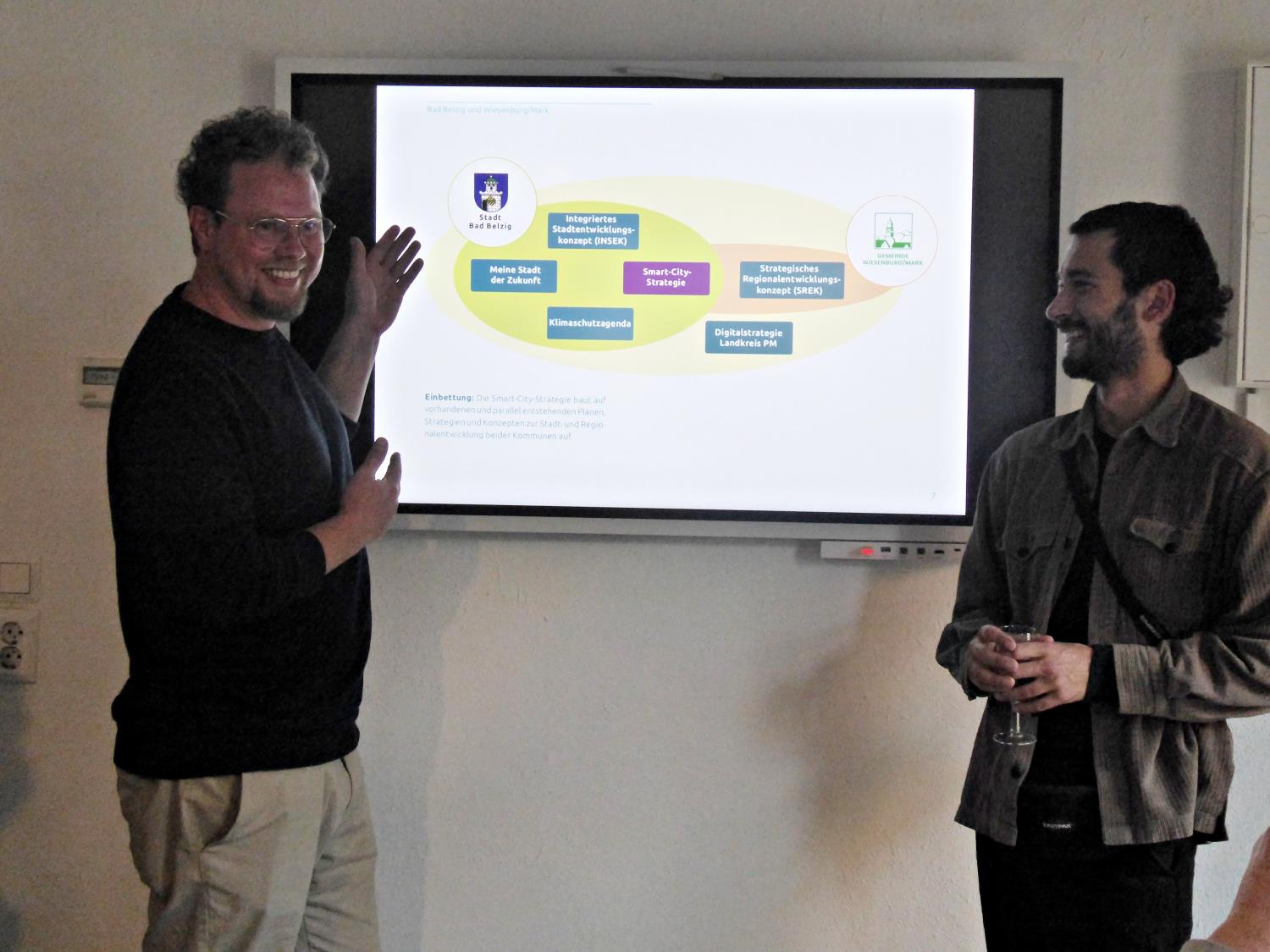 Wer steckt dahinter? So ein Raum muss ja auch gefüllt werden. Da haben wir verschiedene Ideen. Es gibt ein festes Projektteam und das muss man jetzt erst einmal vorstellen. Wir sind jetzt seit 2 Jahren die Zukunft in Bad Belzig und jetzt auch hier. Wir freuen uns total, dass es jetzt hier auch losgehen kann und wir hier vor Ort mitarbeiten können. Ich selber bin jetzt seit 1. Oktober der Projektleiter von der Zukunftswerkstatt. Von dem Modellprojekt, das vom Bundesministerium für Verkehr, Wohnungsbau, Bauwesen und Stadtentwicklung gefördert wird. Und wir haben jetzt in den letzten 2 Jahren in Rücksprache mit den Bürgerinnen und Bürgern, aber auch mit vielen Expertinnen und Experten in der Stadt, die Smart City Strategie für beide Kommunen entwickelt, also eine gemeinsame Strategie. Die wurde Ende Juli in der Gemeindevertretung hier und davor auch in der Stadtverordnetenversammlung im April verabschiedet und für gut befunden. Und deswegen konnten wir sie dann quasi aus der Rohversion in eine geordnete Version bringen und auch Bilder und Schaubilder usw. entwickeln, die man jetzt in der Öffentlichkeit präsentieren kann. Leider ist die Druckversion noch nicht soweit. Wir hoffen, dass wir in den nächsten Tagen loslegen können.