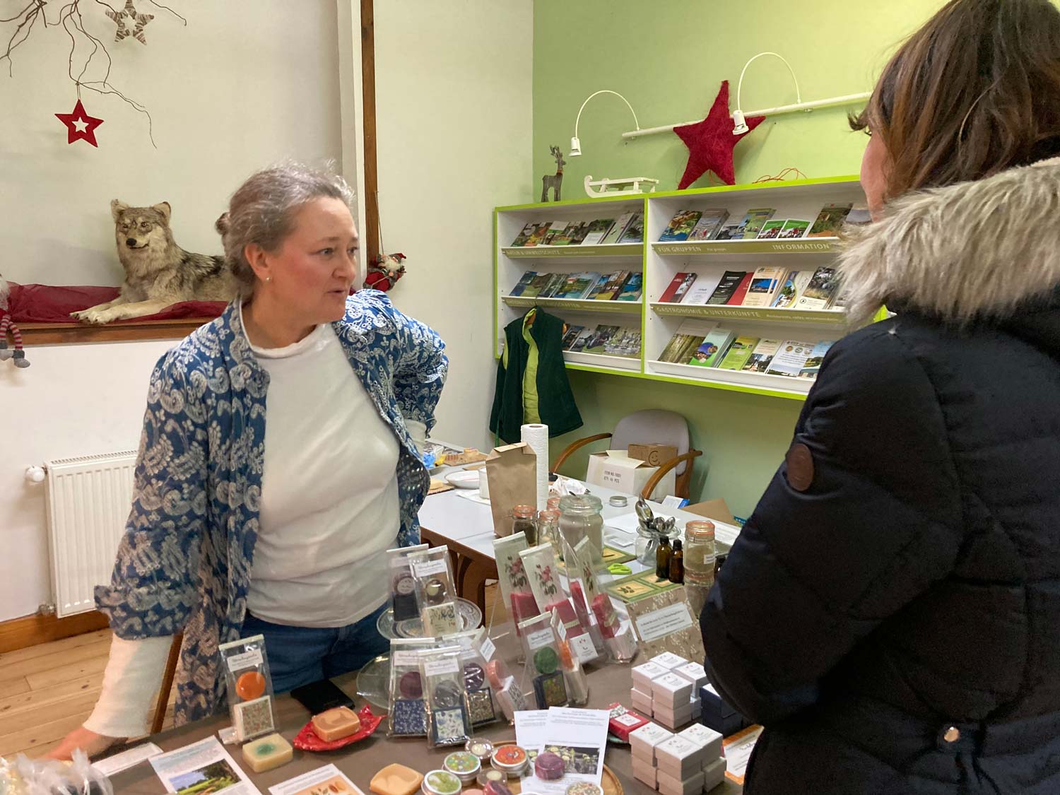 Der Familien-Weihnachtsmarkt vor, im und hinter dem Naturparkzentrum lud Groß und Klein ein, nicht nur kulinarische Köstlichkeiten zu genießen, sondern auch aktiv mitzumachen, wie zum Beispiel beim Bau eines Kekshauses, zu filzen oder selbst Kerzen herzustellen.