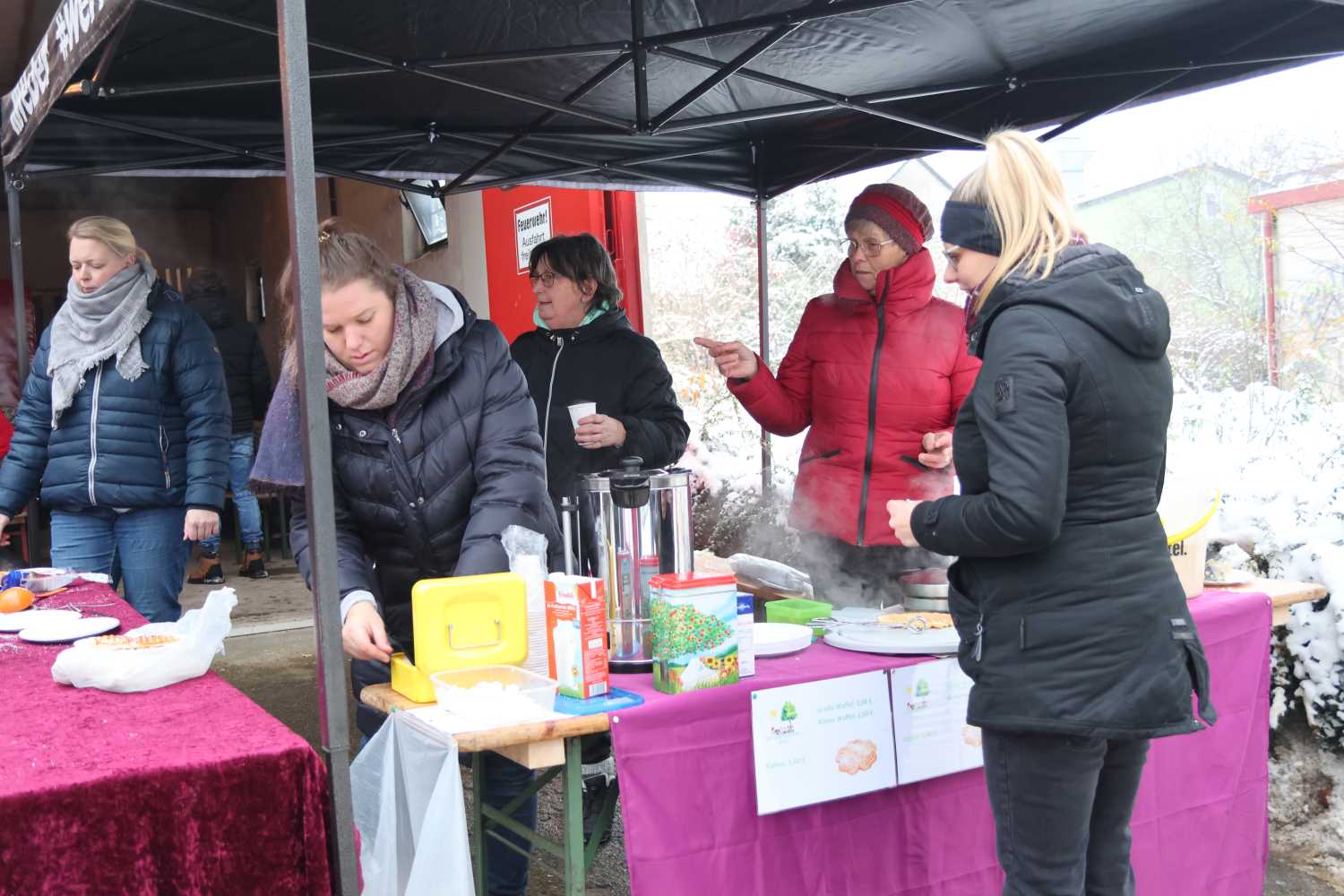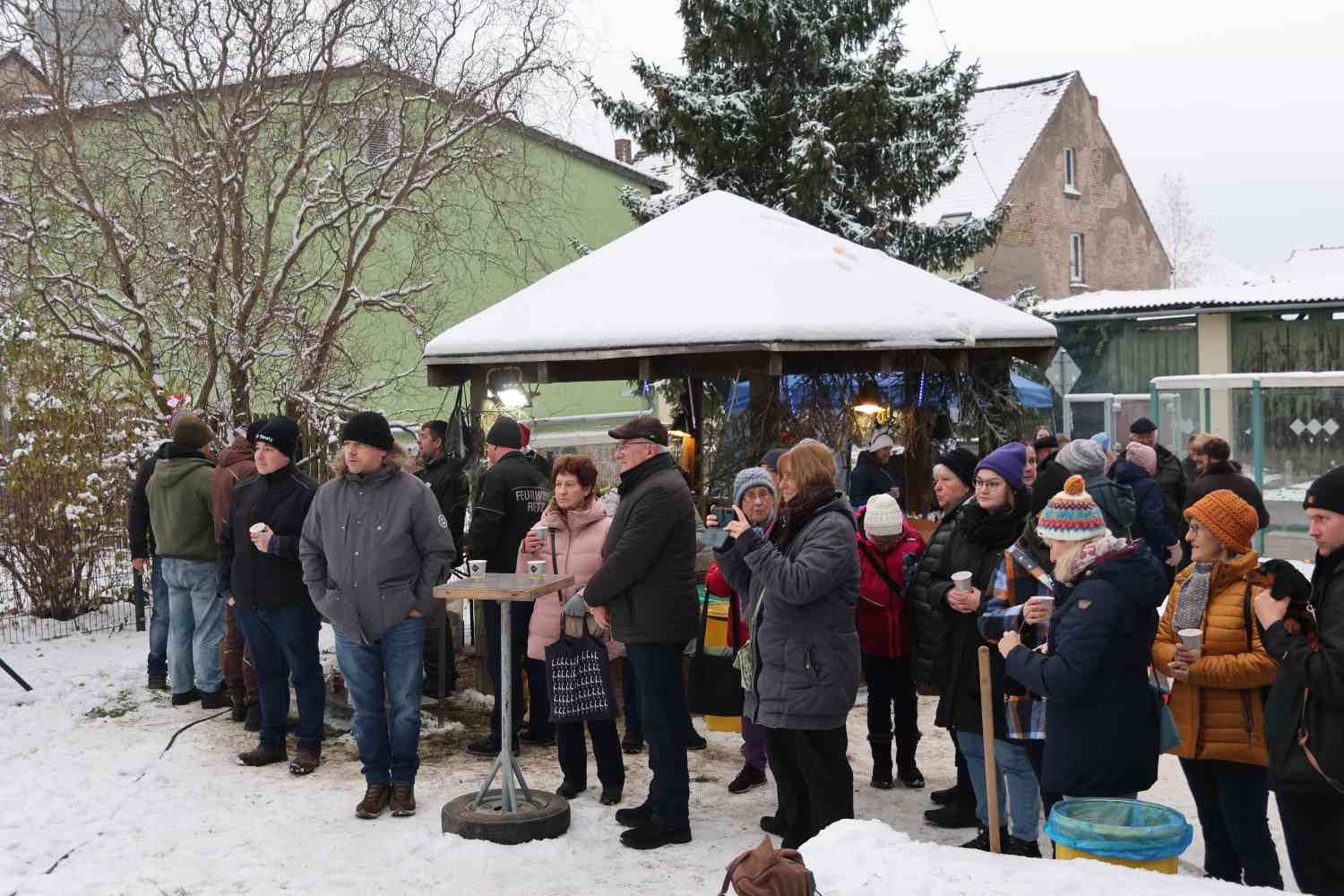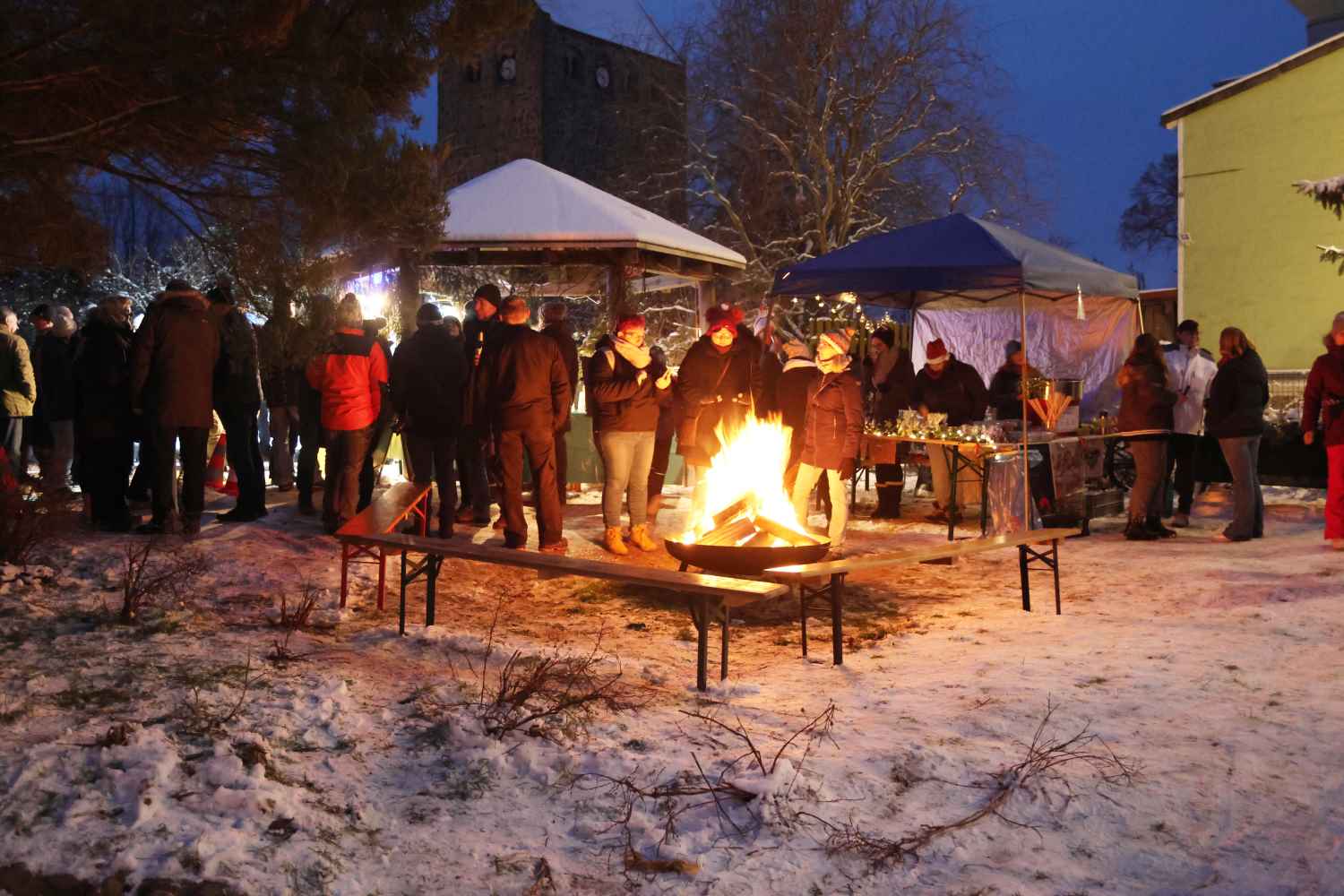 Der Adventsmarkt fand nun schon zum 14. Mal statt, seit einigen Jahren auf dem Lindenplatz in der Dorfmitte. Feuerwehr, Dorfverein und Ortsbeirat arbeiten jedes Jahr gut zusammen, so dass alles wunderbar klappt. Während die Feuerwehr sich um Versorgung und Licht kümmert, organisieren Dorfverein und Ortsbeirat das „Drumherum“. Die Straße war durch die Gemeinde abgesperrt, Wolfgang Eilert, Leiter des Bauhofs, kam sogar am Sonntagvormittag, um Stromverteiler zu bringen. Schon einige Tage vorher hatte der Bauhof die Lichterkette an der großen Tanne angebracht.