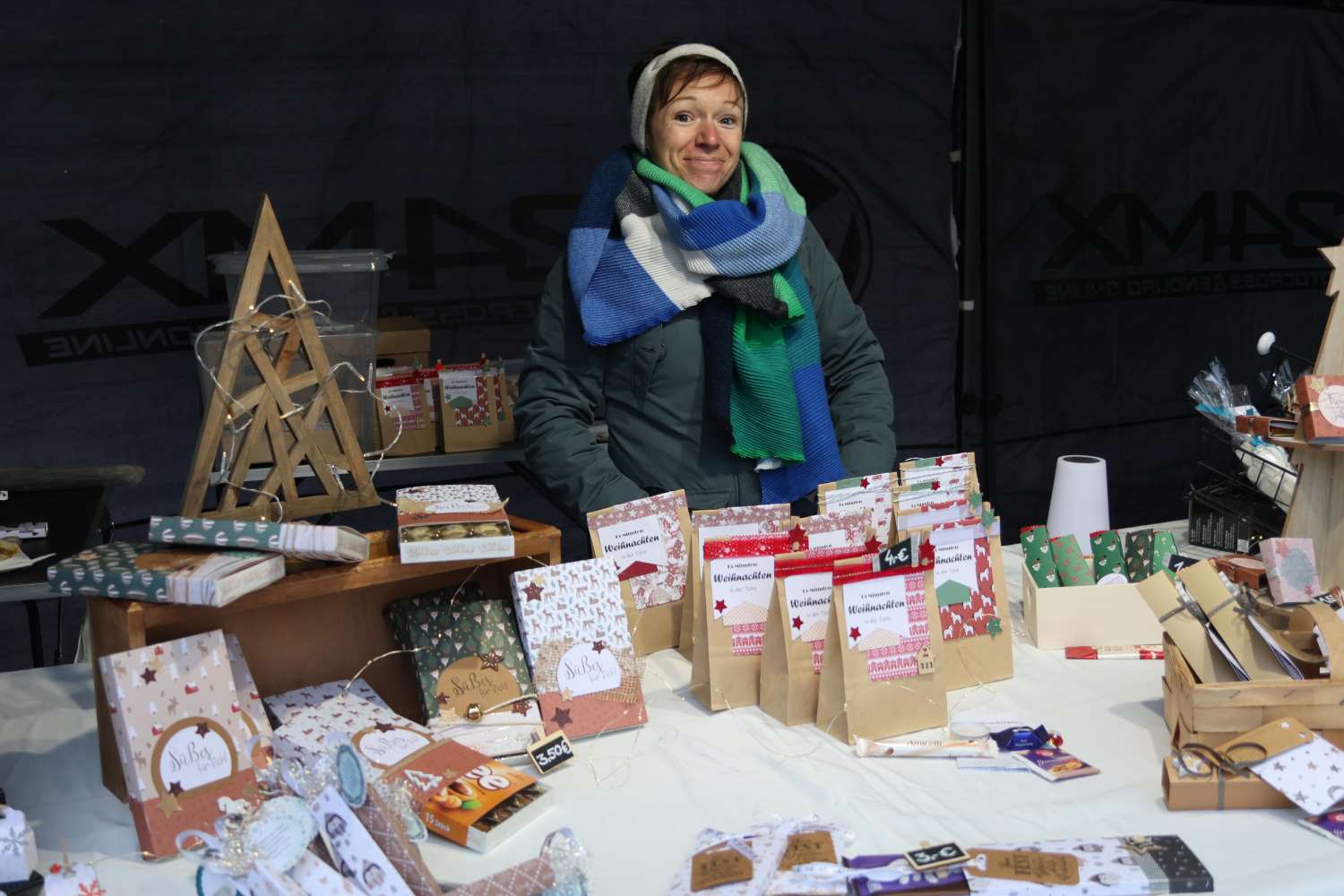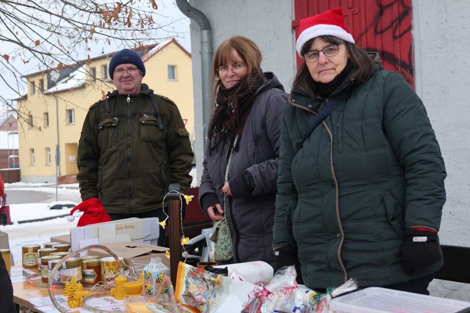 Offiziell eröffnet wurde der Adventsmarkt dann von den Jagdhornbläsern. Inzwischen buken die Kita und Ronny Herbke bereits die ersten Waffeln. Immerhin acht Kilo Mehl wurden dafür verarbeitet und es wurde auch alles ratzekahl leer. Im Feuerwehrhaus konnten wieder mit Unterstützung von Anett Blasche, Inhaberin der Gärtnerei Köhler, Weihnachtsgestecke gebastelt werden. Auch wenn es in diesem Jahr nicht ganz so viele Stände waren – es waren durch die verkürzte Adventszeit überall Weihnachtsmärkte – die Standbetreiber waren zufrieden. „Strickfee“ Marion Herrmann hatte in weiser Voraussicht viele Mützen und Schals dabei, die reißenden Absatz fanden. „Dafür gingen Socken in diesem Jahr nicht“, schmunzelte sie. Auch Familie Binte konnte einen Großteil ihres Honigs an den Mann bzw. an die Frau bringen. Bei dieser Witterung ist ein Glas heiße Milch mit Honig ein optimales Getränk. Es gab gebrannte Mandeln, Plätzchen, Schokofrüchte und viele kleine Geschenkideen. adventsmarkt,reetz,weihnachten,kirche,weihnachtsmannUnd auch der Weihnachtsmann kam natürlich. Felix Opitz schlüpft seit Jahren in das Kostüm. Am späten Nachmittag gab es jedoch ein Raunen auf dem Platz. Felix spazierte in Zivil über den Platz, aber trotzdem war ein Weihnachtsmann da. Alles rätselte, wer das wohl ist. Die Erklärung war einfach – Papa Dieter Glinke wollte auch mal den Weihnachtsmann spielen.