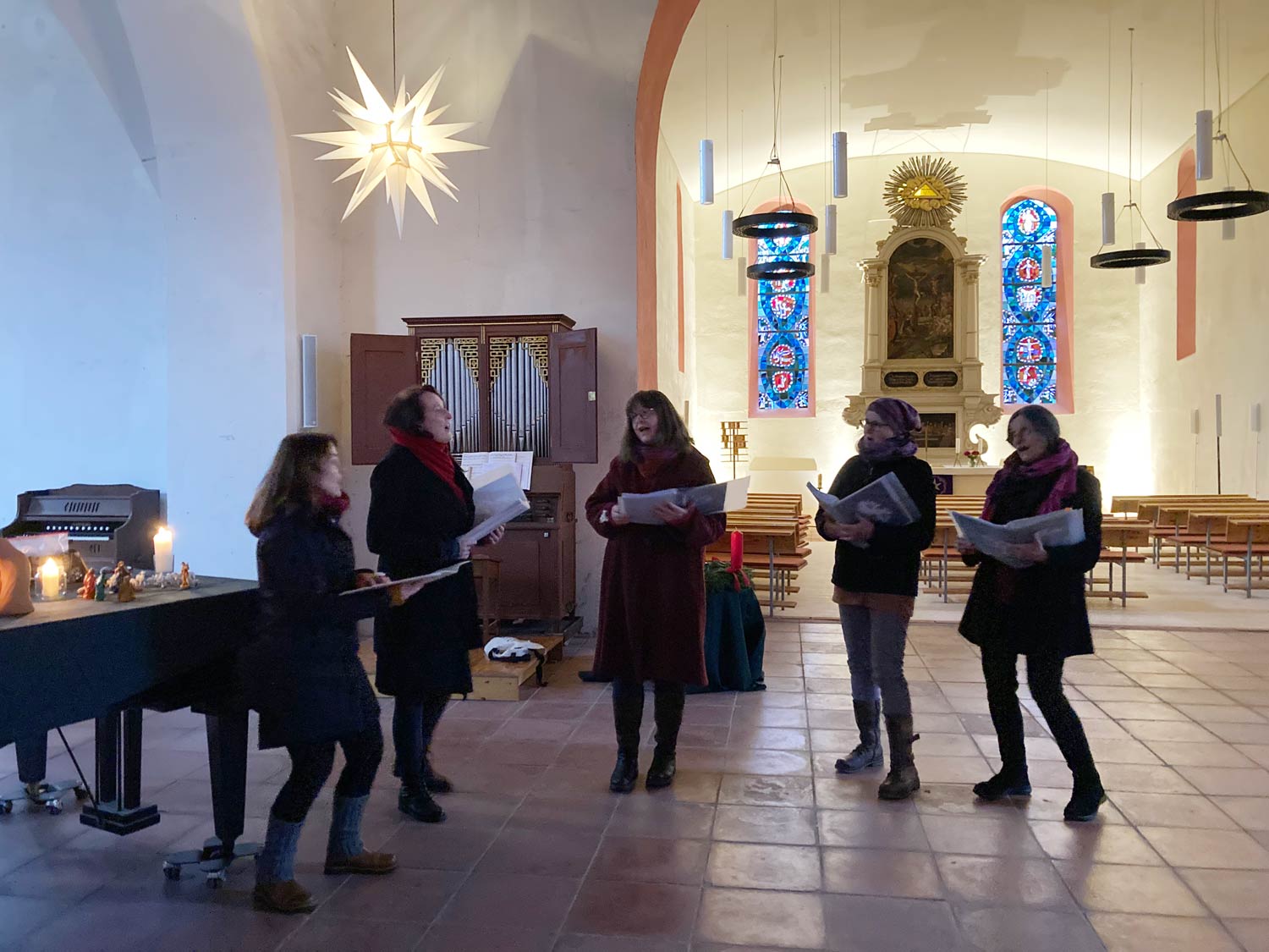 Die Krippenausstellung in der St.-Marien-Kirche zeigte verschiedene Interpretationen in unterschiedlichen Größen, Farben und Materialien. Durch einen Aufruf in der Gemeinde kamen viele Leihgaben von Anwohnern und Anwohnerinnen zusammen. Anheimelnd mit Lichtern und Kerzen präsentiert, rückte die wahre Bedeutung des Weihnachtsfestes in den Vordergrund. Die weihnachtlichen Klänge der Gesangsgruppe Bellis verzauberten die Gäste. In besinnlicher Stimmung lauschten die Besuchenden bei Kaffee und selbst gebackenen Kuchen den Tönen des Quintetts unter dem Weihnachtsstern.
