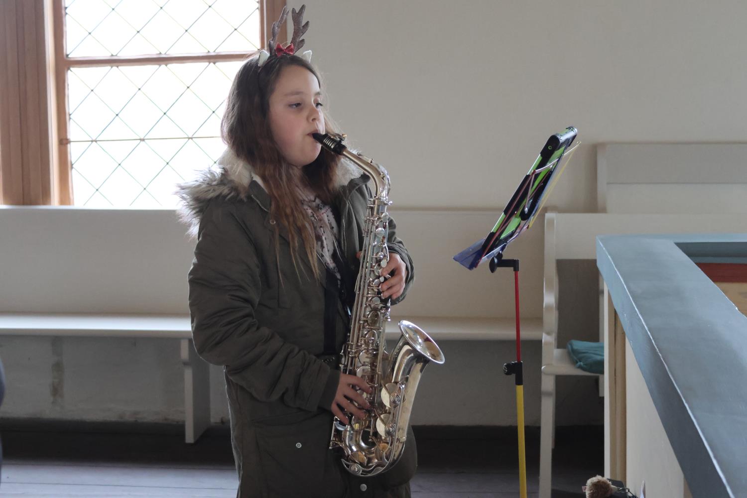 Zu Beginn gab es gleich ein besonderes Schmankerl, denn Johanna durfte das Konzert mit ihrem Saxophon eröffnen. Begleitet wurde sie dabei von Ingo Wagner an der Orgel. Auch für sie war es sehr aufregend. „Was ist, wenn ich mich verspiele“, fragte sie ihren Musiklehrer. „Nur nichts anmerken lassen“, schmunzelte dieser, „einfach weiter spielen.“ Ein wenig später begeisterte sie die Anwesenden auch noch mit ihrer Stimme. Gemeinsam mit Ingo Wagner sang sie den Kanon „Dona nobis pacem“, was bedeutet – gib und Frieden. Aber auch alle anderen Darbietungen bekamen viel Applaus. Mit Weihnachtsliedern und Gedichten und einer witzigen Moderation begeisterten die Kinder Eltern, Großeltern und Gäste.
