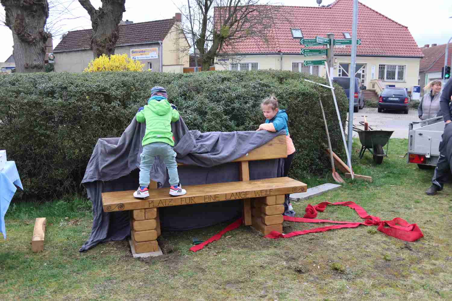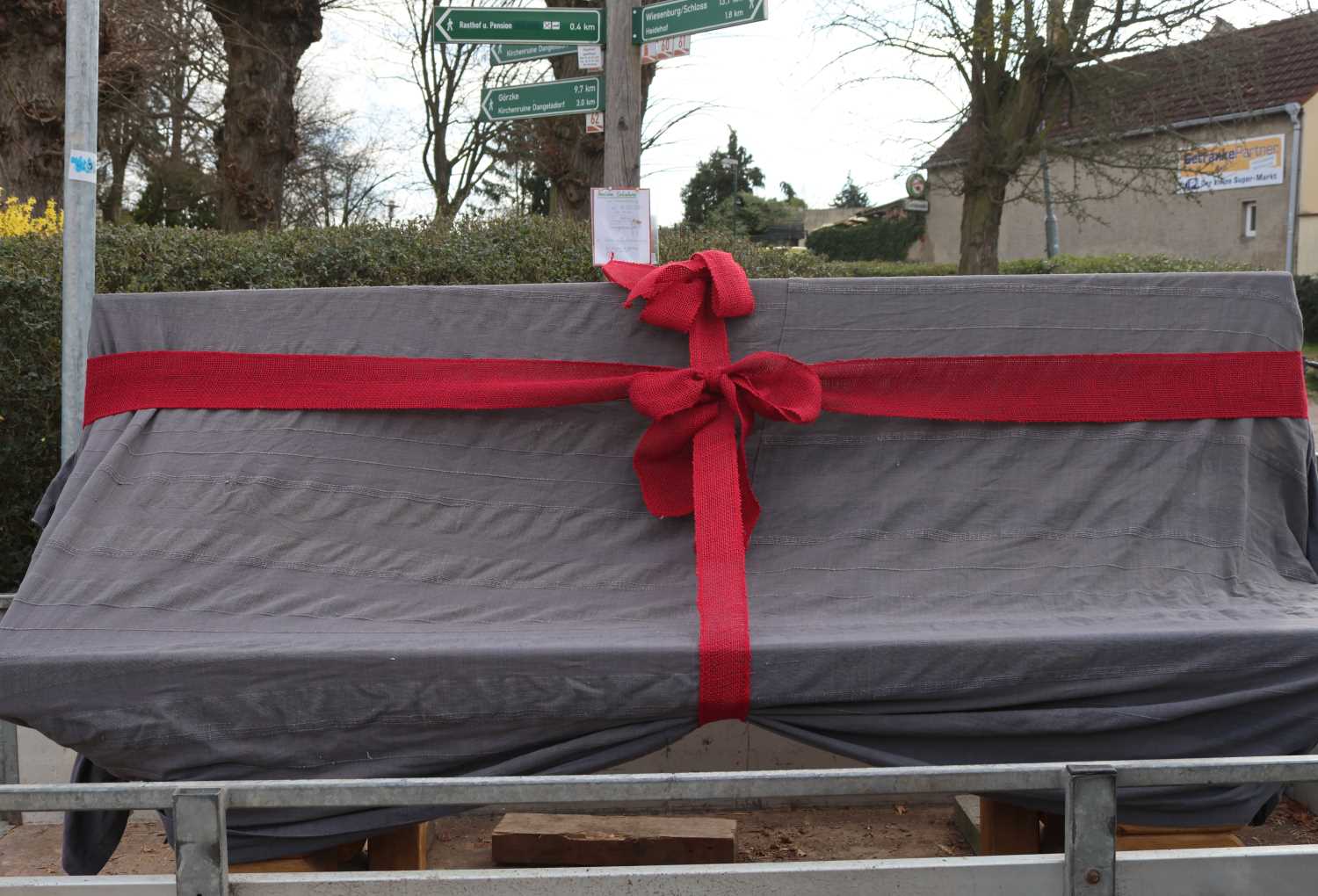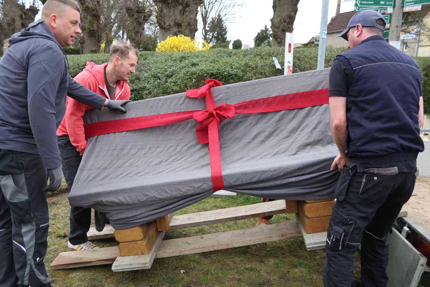 Am vergangenen Samstag war es dann endlich soweit. Verpackt wie ein Geschenk mit einer großen roten Schleife kam die erste Bank auf einem Hänger und wurde am Friedhof aufgestellt. „Dort ist sie gut sichtbar und lädt zu einer Pause ein“, sagte Sabine Hensky. Um die Bank abzuladen, brauchte es einige kräftige Männer. Gleichzeitig standen die Frauen auf der Achse des Hängers, damit dieser nicht kippt – ein lustiges Bild.