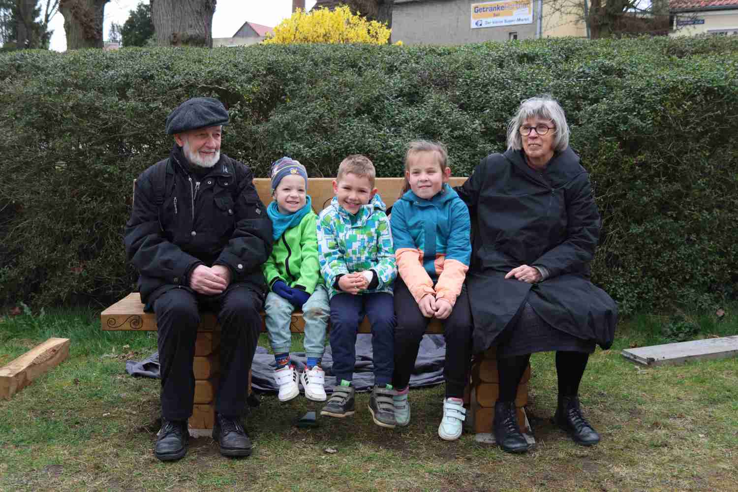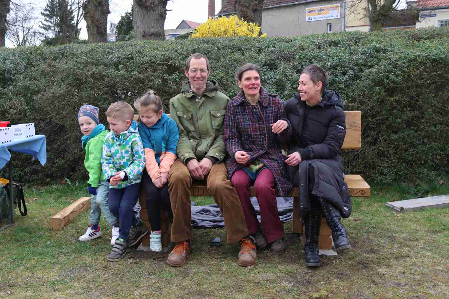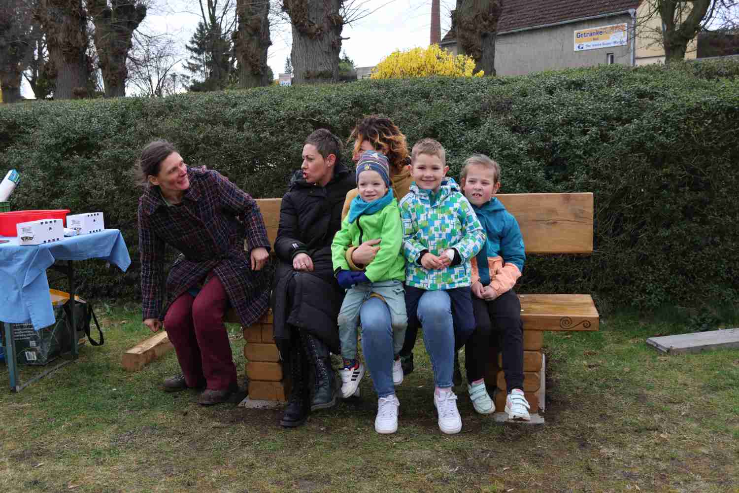 Die Bänke sollten durchaus ein gewisses Gewicht haben, zusätzlich wurden sie auf Rasenplatten geschraubt, um Diebstahl vorzubeugen. Mit Begeisterung konnten die Kinder dann das Geschenk auspacken und enthüllen. Und dann ging es die Reihe rum zum Probesitzen. Passt – stellten alle fest.