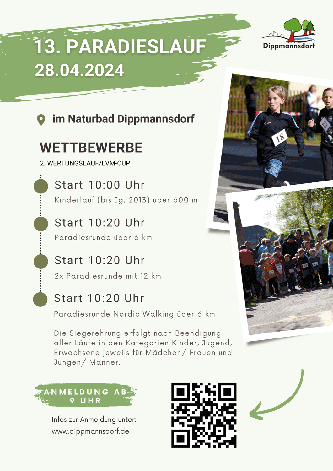Die Veranstalter weisen ausdrücklich auf die Möglichkeit der Online-Anmeldung unter www.dippmannsdorf.de in der Rubrik ‚Termine‘ hin und bitten um rege Nutzung des Online-Formulars. Bei rechtzeitiger Voranmeldung sichern sich die Läufer eine vergünstigte Startgebühr in Höhe von nur 3 Euro und ermöglichen den Organisatoren zudem eine optimale Vorbereitung. Um die sportliche Betätigung von Kindern und Jugendlichen zu fördern, wird für alle Starter aus dem Jahrgang 2008 und jünger keine Startgebühr erhoben. Für diese Altersgruppe wird es diesem Jahr auch wieder eine separate Jugendwertung auf der 6-km-Strecke geben. Um das leibliche Wohl werden sich die Mitglieder des Feuerwehrvereins kümmern, sodass einem Sonntags-Familienausflug nach Dippmannsdorf nichts im Wege steht. Also ran ans Training und auf nach Dippmannsdorf.