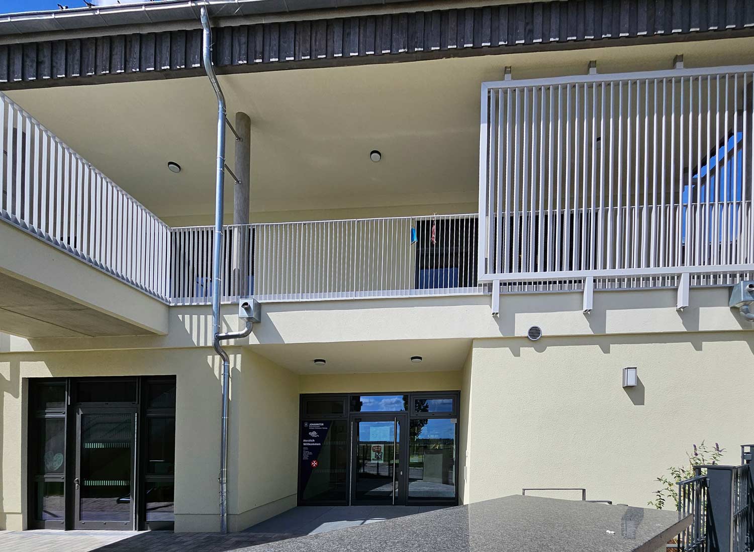 „Der zweigeschossige Neubau mit Doppelsatteldach bietet im Erdgeschoss den U3-Bereich, mit Sanitäreinheiten sowie die Ausgabeküche und die große Cafeteria mit Außenterrasse. Im Nebengebäude sind sowohl ein Außen-WC als auch ein Abstell- und Kinderwagenraum verortet. Im Obergeschoss befindet sich der Elementarbereich mit Funktionsräumen, wie der Kinderküche, dem Bewegungs- und Entspannungsraum. Unsere Kinder können das Außengelände vom Laubengang aus entweder über die Tunnelrutsche oder der Treppe erreichen“, beschreibt der Betreiber die Einrichtung.