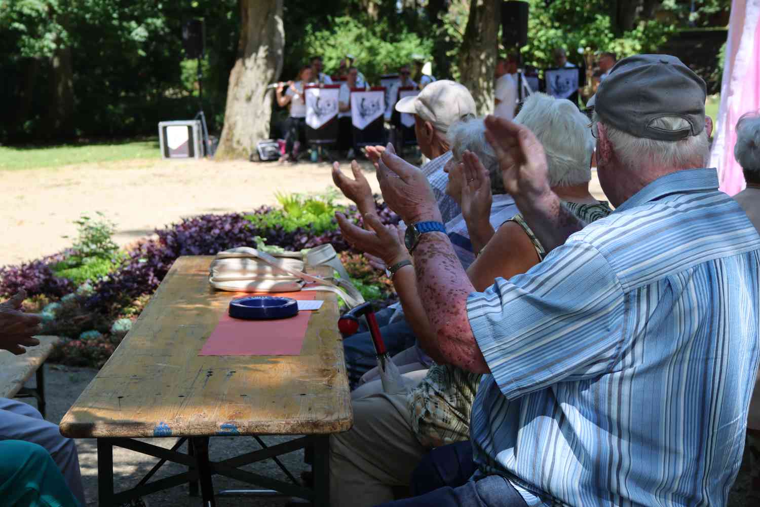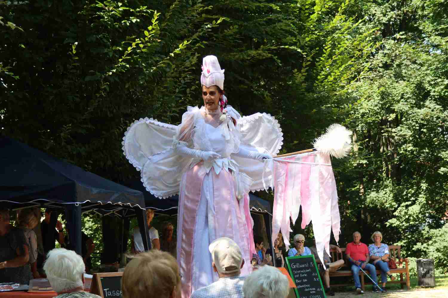 Am Teehäuschen sorgte das Jugendblasorchester Wiesenburg für Stimmung unter den meist älteren Besuchern. Diese hatten es sich im Schatten auf den Bänken bequem gemacht. Bei Kaffee und Kuchen aus Simones Café ließen sie es sich gut gehen und spendeten den Musikern kräftigen Applaus. Erstaunt, verwundert und begeistert nahmen die Gäste die Fee Ambrosia van Serpens auf. Auf Stelzen und mit dem sicher besten Überblick animierte sie die Gäste und zog anschließend mit Feenstaub und auf Stelzen quer durch den Park. Viele kannten sie bereits vom Blumenmarkt.