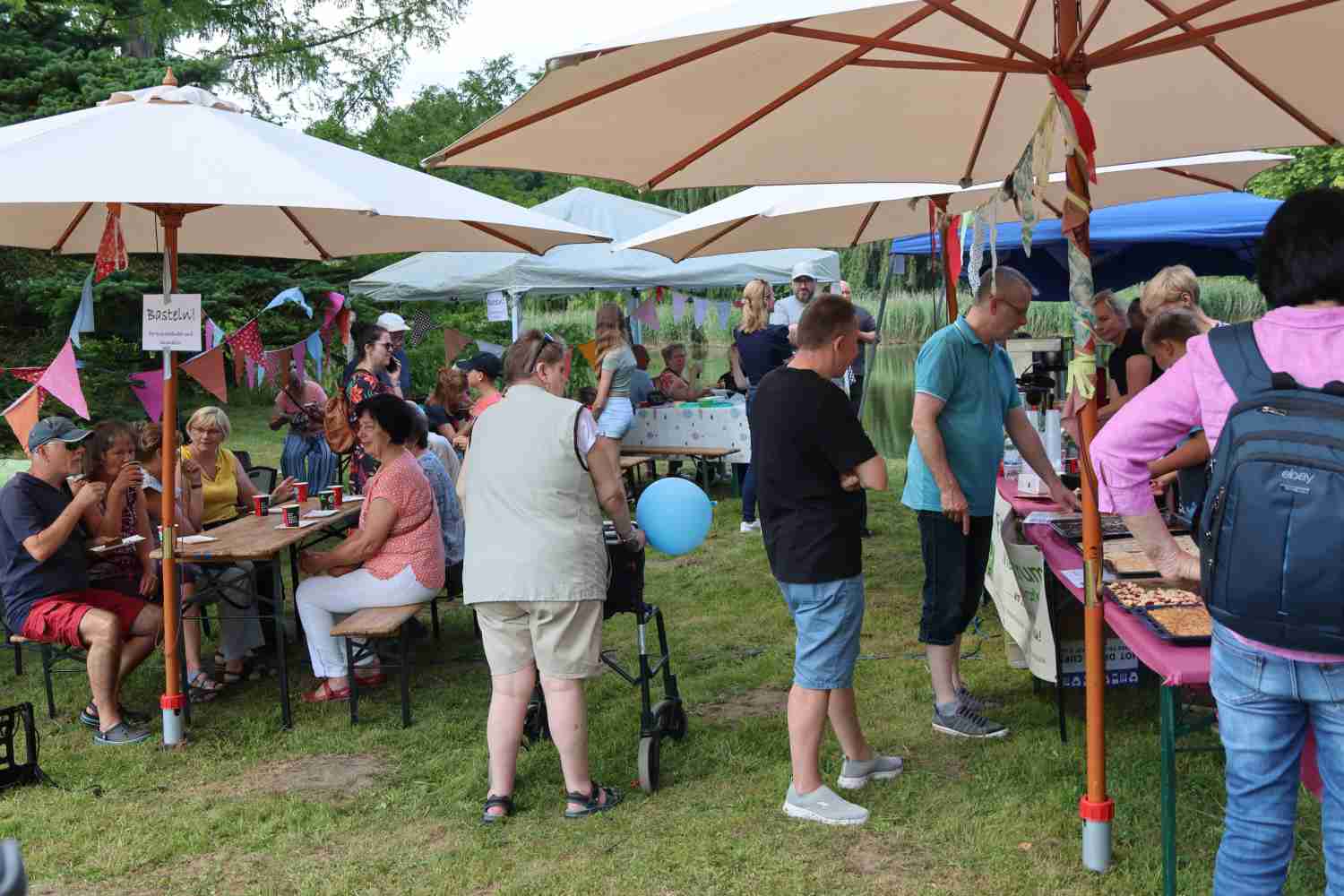 Das Ponyreiten mit Familie Bergmann aus Schlamau kam besonders bei den Kleinsten gut an. Auch gab es wieder einen Flohmarkt von Kindern für Kinder. Neben Bekleidung konnten die Besucher auch viel Spielzeug erwerben. Eine Kugel Eis von „Elmar“ war bei den sommerlichen Temperaturen Pflicht. Auch die Angler präsentierten sich. Schon aus einiger Entfernung stieg den Besuchern der Duft von Räucherfisch in die Nase. Die geräucherten Forellen fanden reißenden Absatz. Interessant für viele war das aufgestellte Aquarium. Hier zeigten die Angelfreunde, welche Fische in den Parkteichen heimisch sind. Sogar ein kleiner Hecht war dabei. Alle wurden am Ende natürlich wieder in die Freiheit entlassen.
