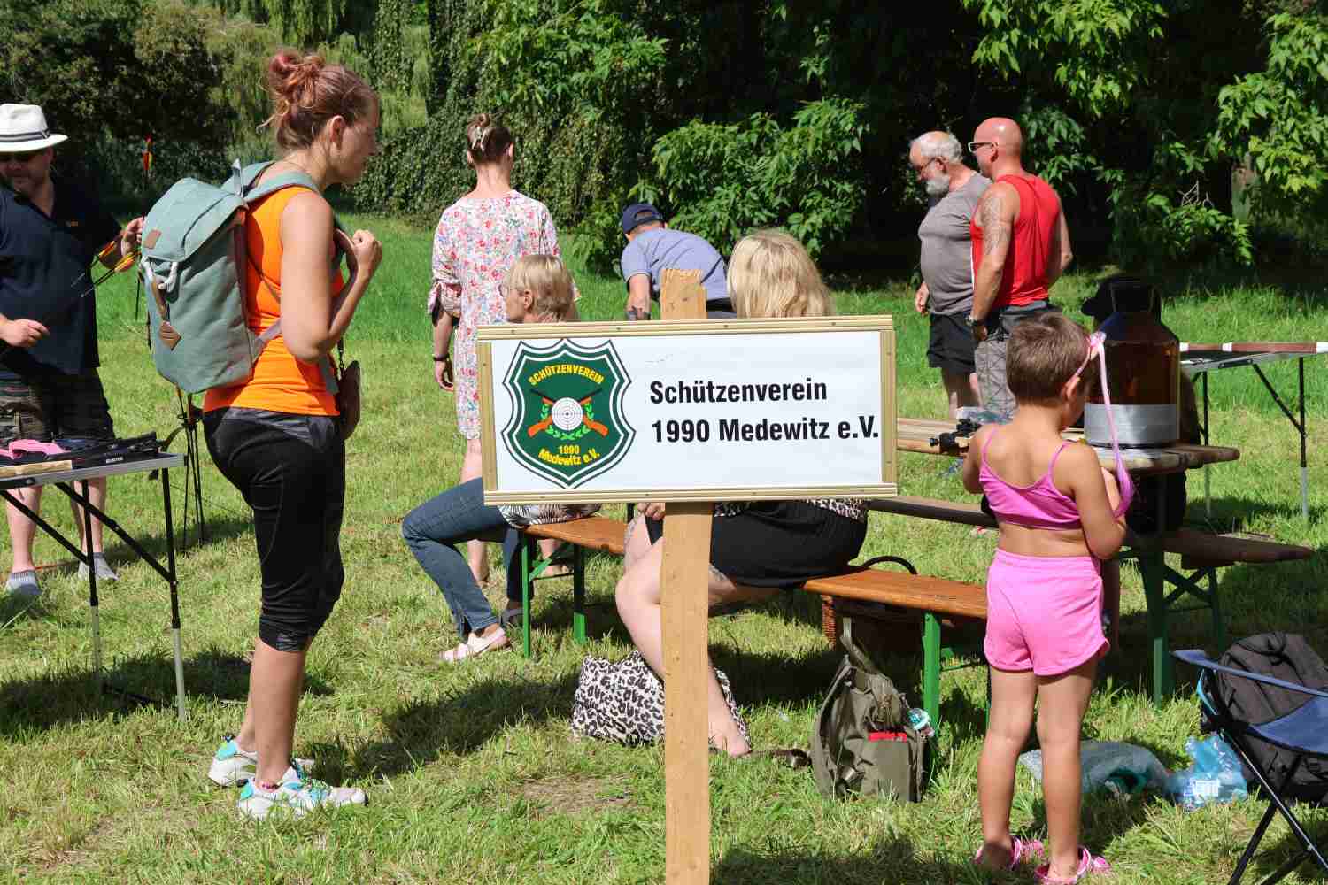 Um den großen Teich herum gab es besonders für die Kinder viel zu entdecken. Mehrere Hüpfburgen luden zum Toben ein. Vereine wie der Schulförderverein sorgten auch im Park für Kaffee und Kuchen. Beim Medewitzer Schützenverein konnte man sich im Bogenschießen ausprobieren. Einige hatten dabei zum Erstaunen der Betreuer ein sehr gutes Händchen.
