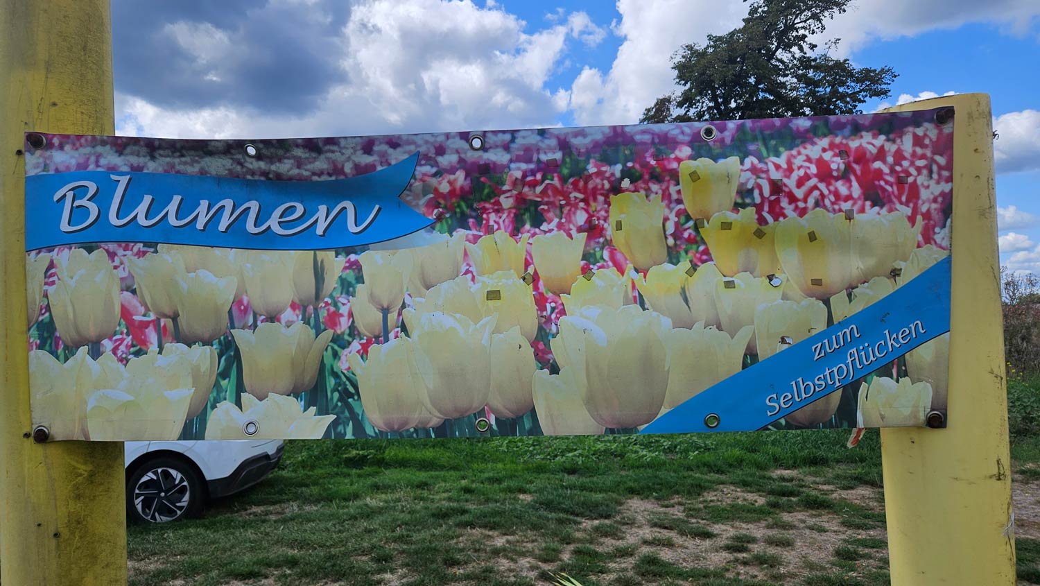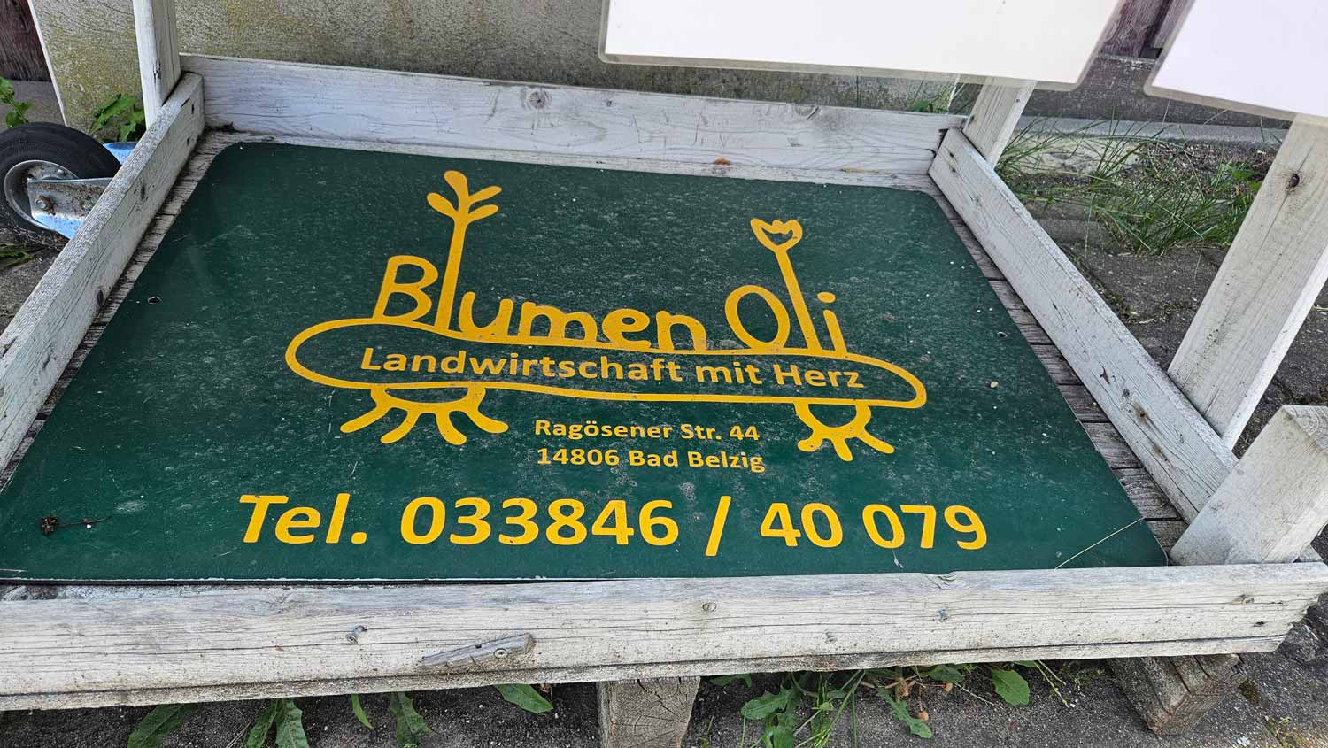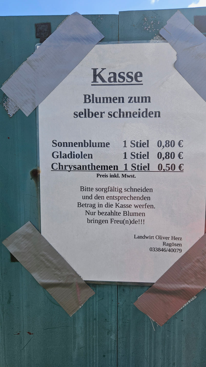 Schräg gegenüber dem Banner findet man ein Regal mit frisch abgepackten Kartoffeln. „Hier bei uns frische Kartoffeln“, verheißt ein weiteres Banner auf dem Scheunentor. Und wer noch nicht genug hat, der sollte sich das nächste Banner am Ortsende in Richtung Golzow anschauen. „Blumen zum Selbstpflücken“, steht darauf. In Ragösen kann der Kunde selbst tätig werden.