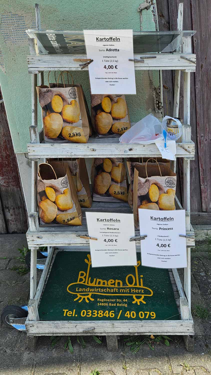 Auch bei Oliver Herz wird es auf dem Blumenacker ruhiger. Die Kasse des Vertrauens steht zwar noch da, die Blumen sind jedoch verblüht, die letzten Gladiolen welken vor sich hin. Von Sonnenblumen und Chrysanthemen nichts mehr zu sehen. Die Kartoffeltüten sind jedoch gut gefüllt und können ebenfalls an einer Kasse des Vertrauens erworben werden. Adretta, Rosara und Princess warten auf Kunden.