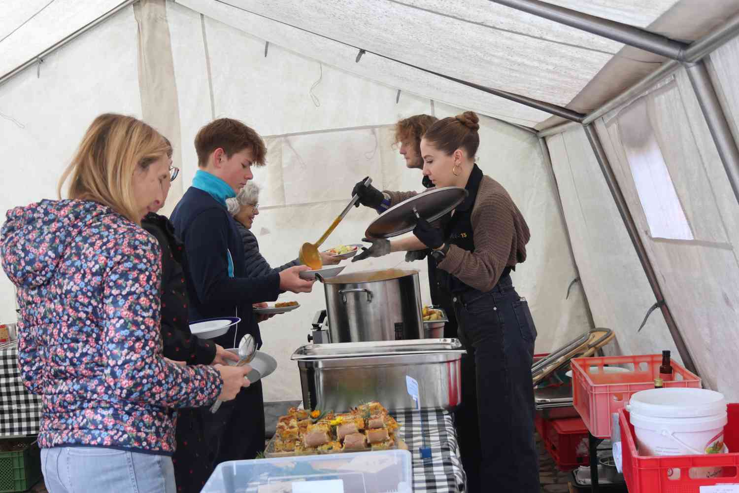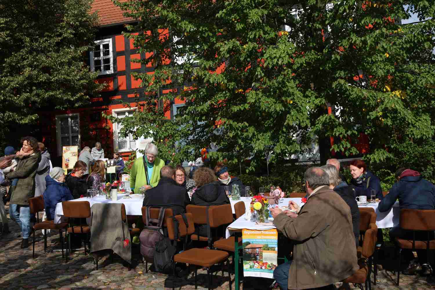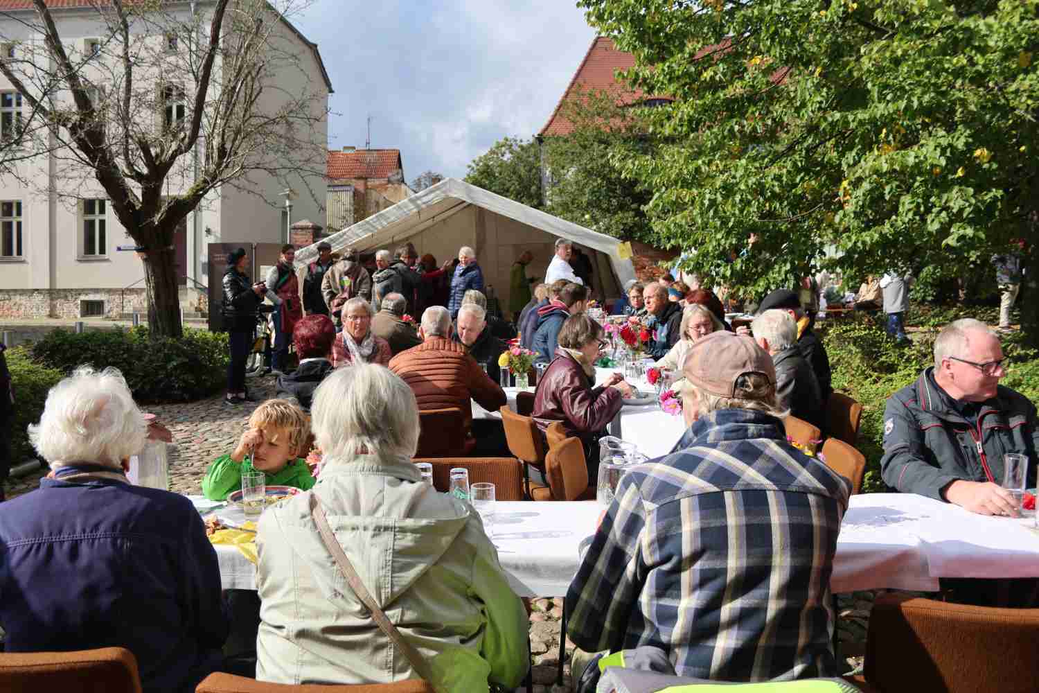Eine kleine Gruppe von etwa zwölf Ehrenamtlern hat das Fest wieder mit viel Liebe zum Detail organisiert. Das Besondere war, dass alle Gerichte mit regionalen Zutaten zubereitet wurden. Gefördert wurde das Fest vom Ministerium für Soziales, Gesundheit, Integration und Verbraucherschutz des Landes Brandenburg (MSGIV). Viele regionale Firmen haben sich beteiligt, um ein möglichst breites Angebot bieten zu können. Zu ihnen gehörten neben dem Ernährungsrat Brandenburg, der Landmarkt, die Backschweintenne Gömnigk, die Steintherme, das Fläminger Weideschwein, das Café Apfel und der Verein Zif e.V. (Zukunft im Fläming). „Wir waren nach dem Erfolg 2023 ziemlich motiviert“, sagte Mitorganisatorin Renate Kaßner. Und auch in diesem Jahr strömten zahlreiche Besucher auf den Kirchplatz. Bereits eine Stunde vorher fand in der Kirche ein Erntedankgottesdienst statt. Zusätzlich gab es einen kleinen Stand, an dem man sich über regionale Produkte informieren und einige auch erwerben konnte. Für die Kinder gab es eine kleine Bastelstraße.
